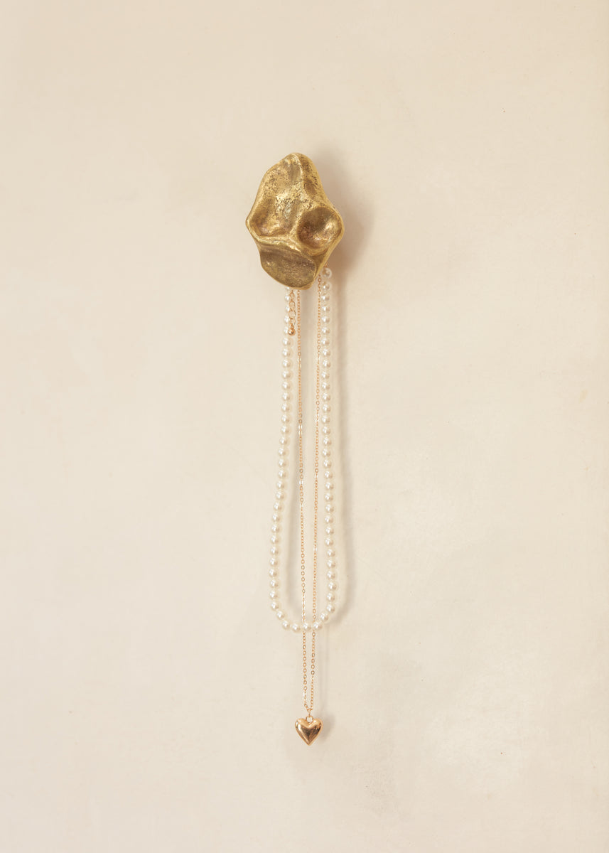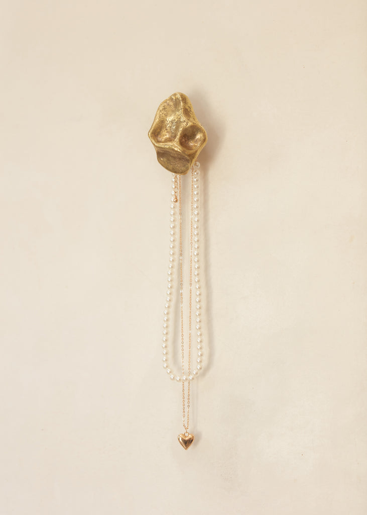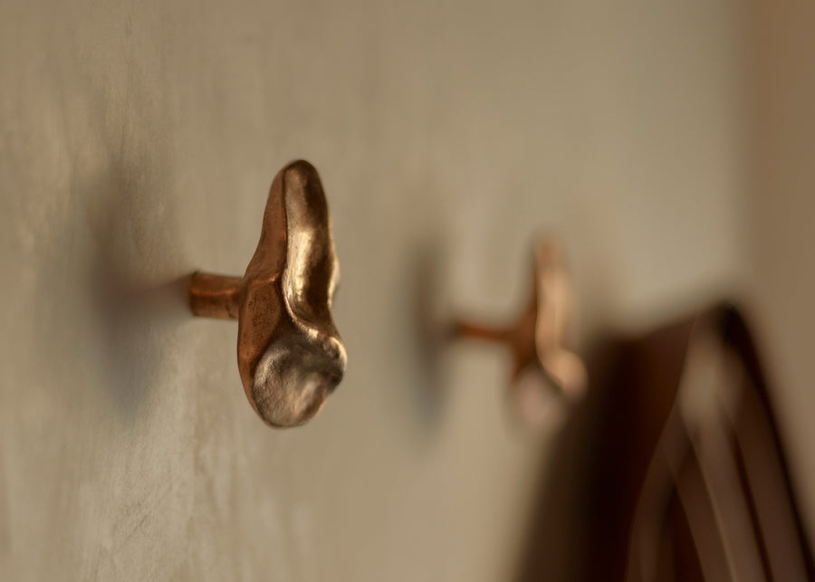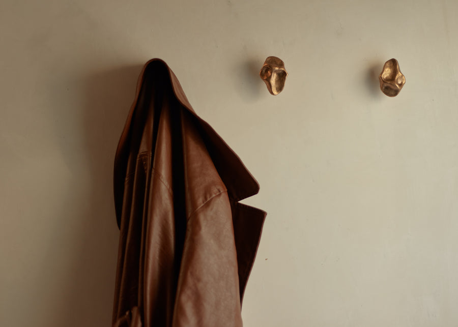 The design process begins by making models in clay, shaped by the maker's hands. The clay models are then sand cast in solid brass or bronze. This technique, where molten metal is poured into a sand mould, dates back thousands of years. After casting, the objects are sanded and polished by hand, leaving the grains of sand and the air bubbles visible in the finished piece. Each object is then drilled and punched by hand, a time-consuming and complex process that embraces traditional techniques.