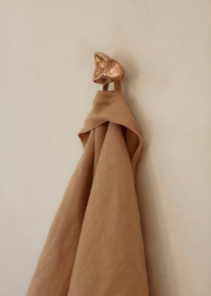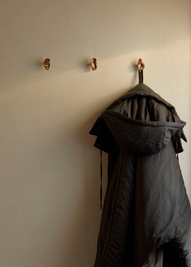 The design process begins by making models in clay, shaped by the maker's hands. The clay models are then sand cast in solid brass or bronze. This technique, where molten metal is poured into a sand mould, dates back thousands of years. After casting, the objects are sanded and polished by hand, leaving the grains of sand and the air bubbles visible in the finished piece. Each object is then drilled and punched by hand, a time-consuming and complex process that embraces traditional techniques.