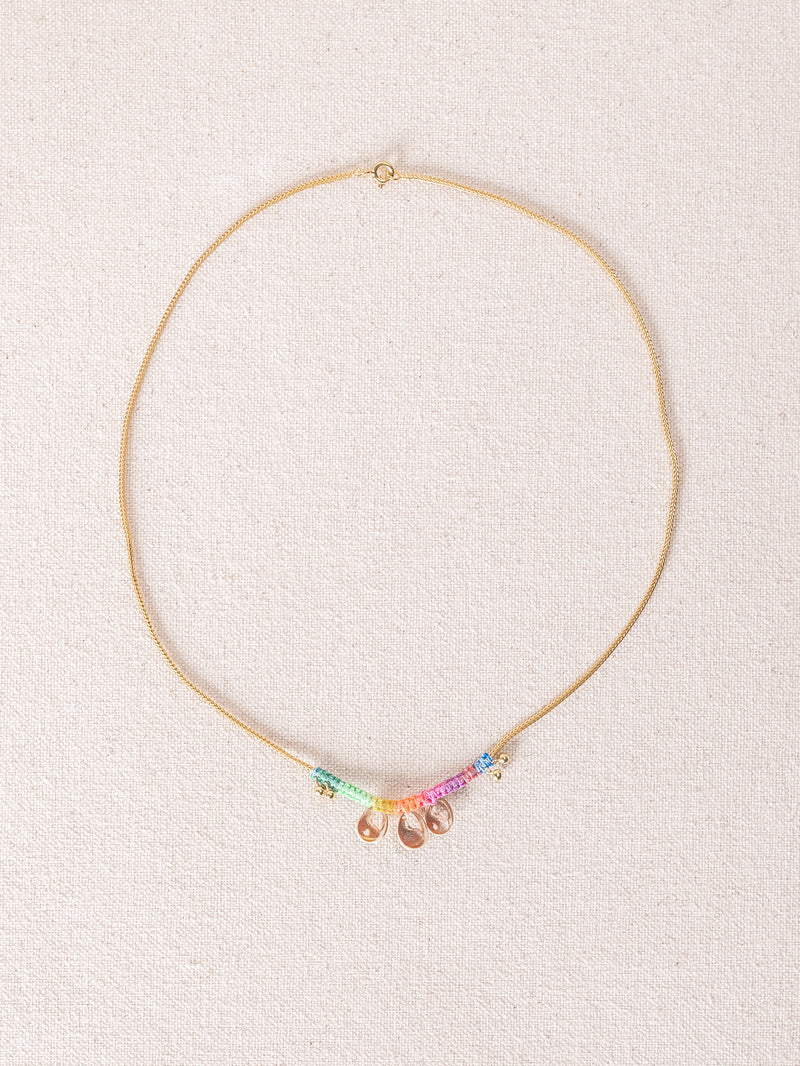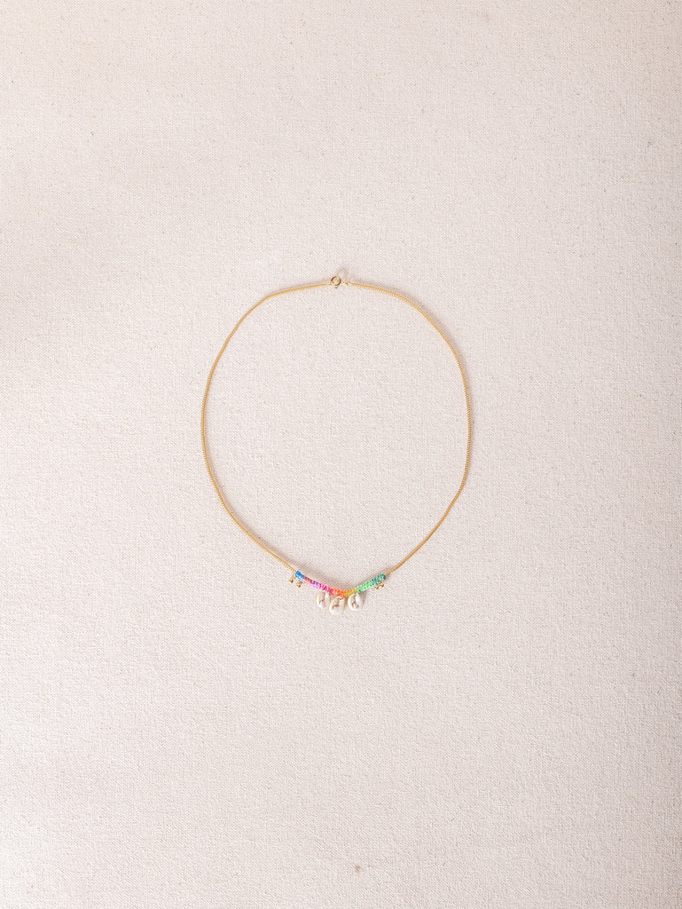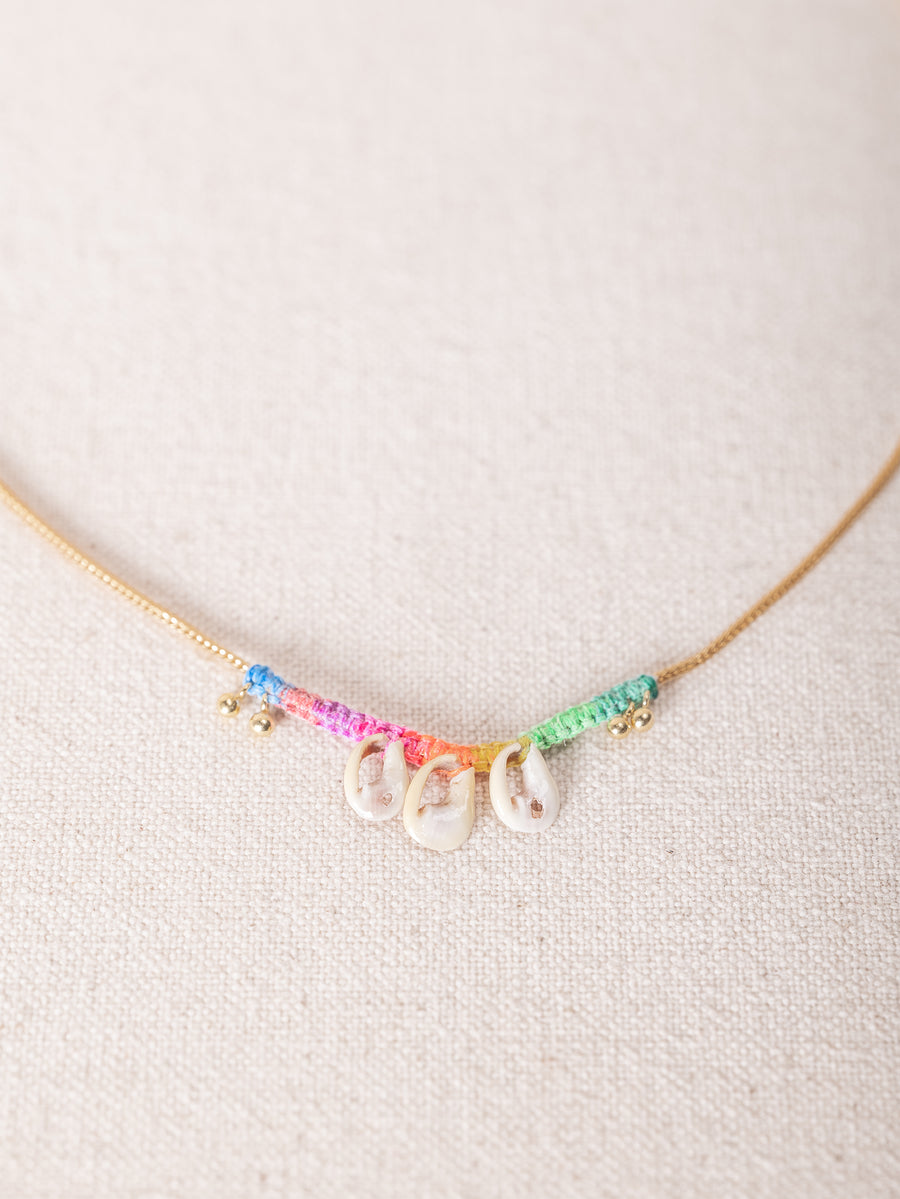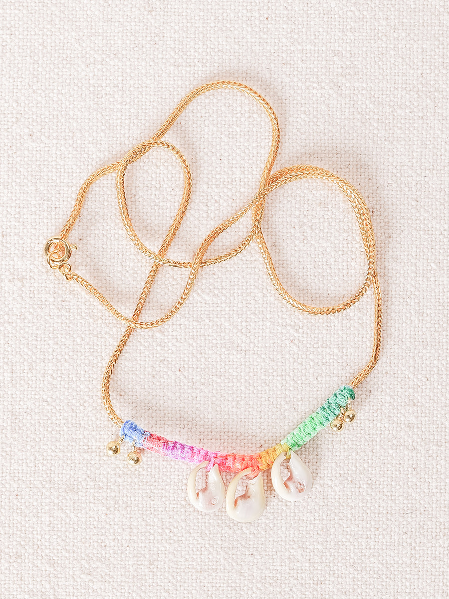 Three petite shell charms form the focal point of this necklace, suspended from a fine gold-plated chain accented with a subtle rainbow macramé detail. Designed at 41cm to sit neatly at the collarbone, it brings a refined touch of texture and colour to effortless, everyday layering.