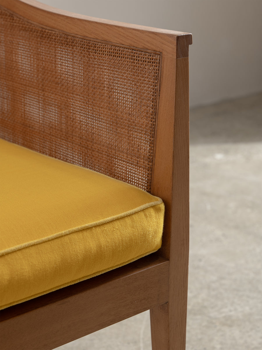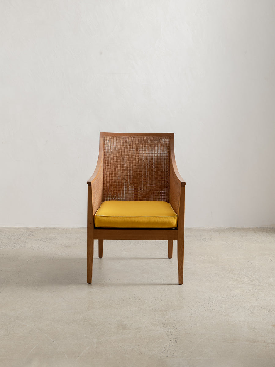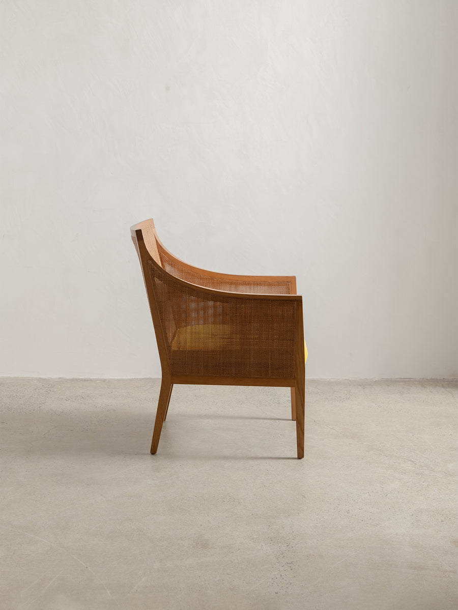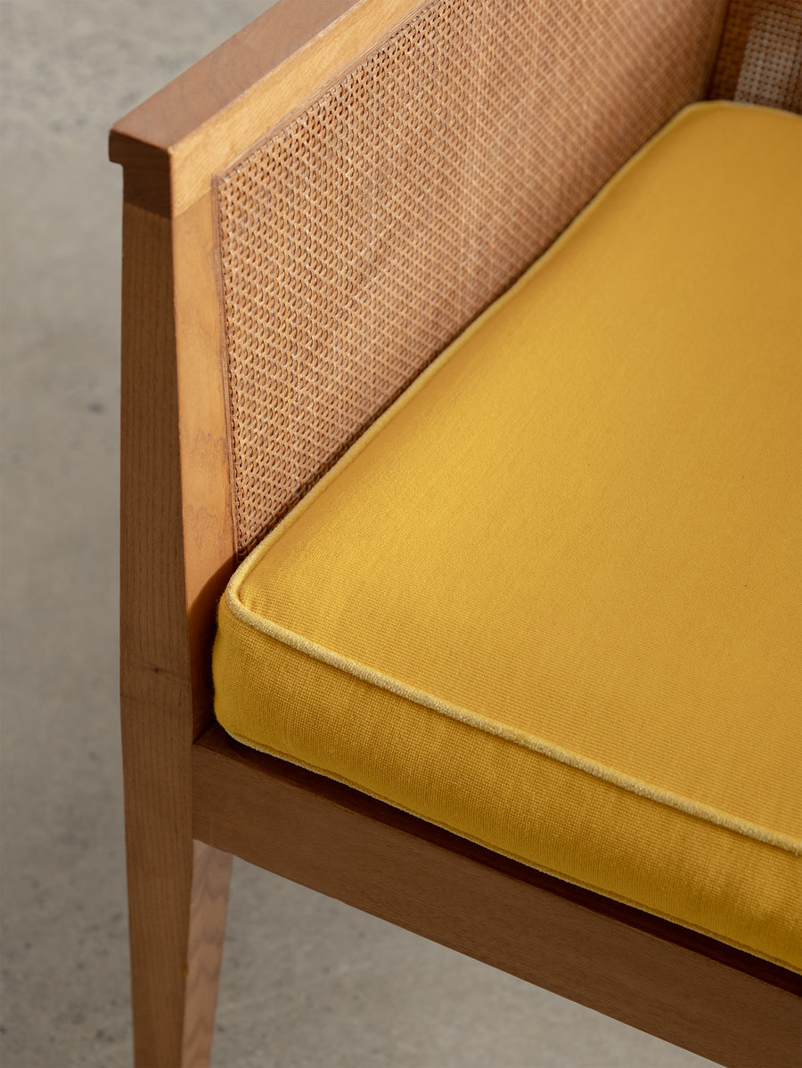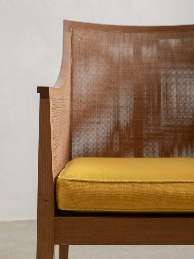 Armchair by Antonio Citterio for Flexform. With a frame crafted from beech wood, the rattan cladding runs along both the inside and outside. Featuring from wood joinery, high armrests and original lemon cushion.