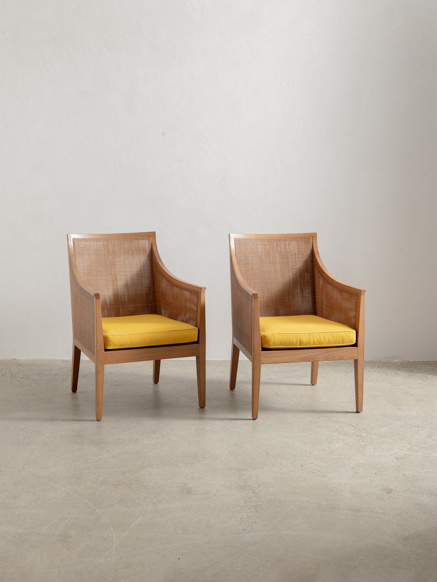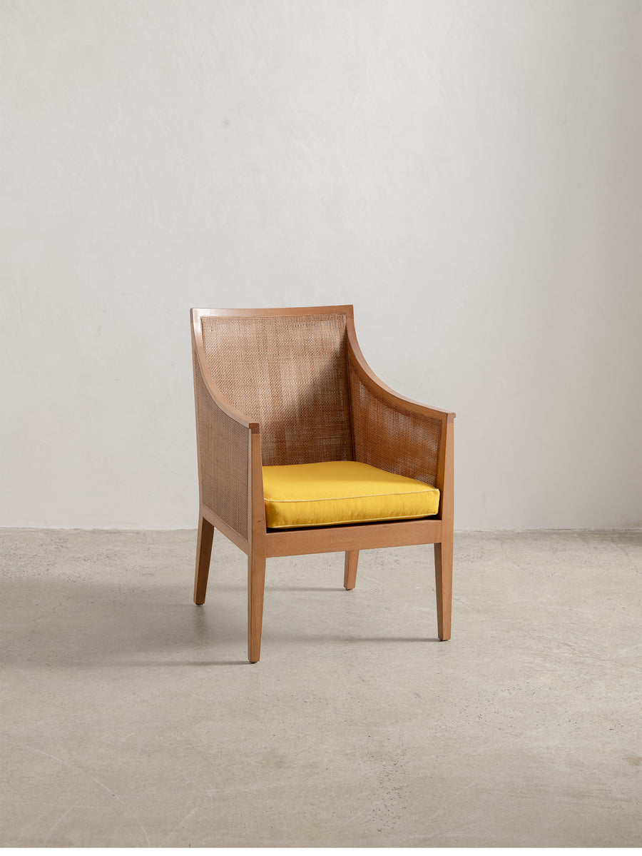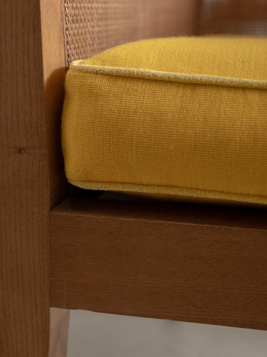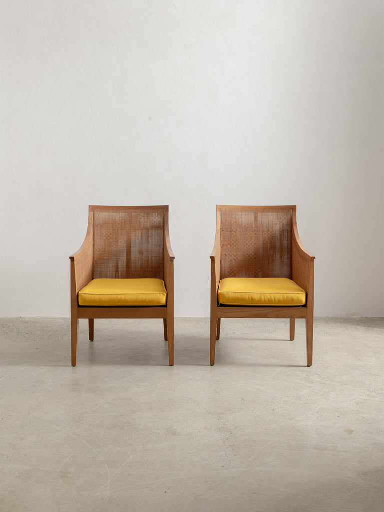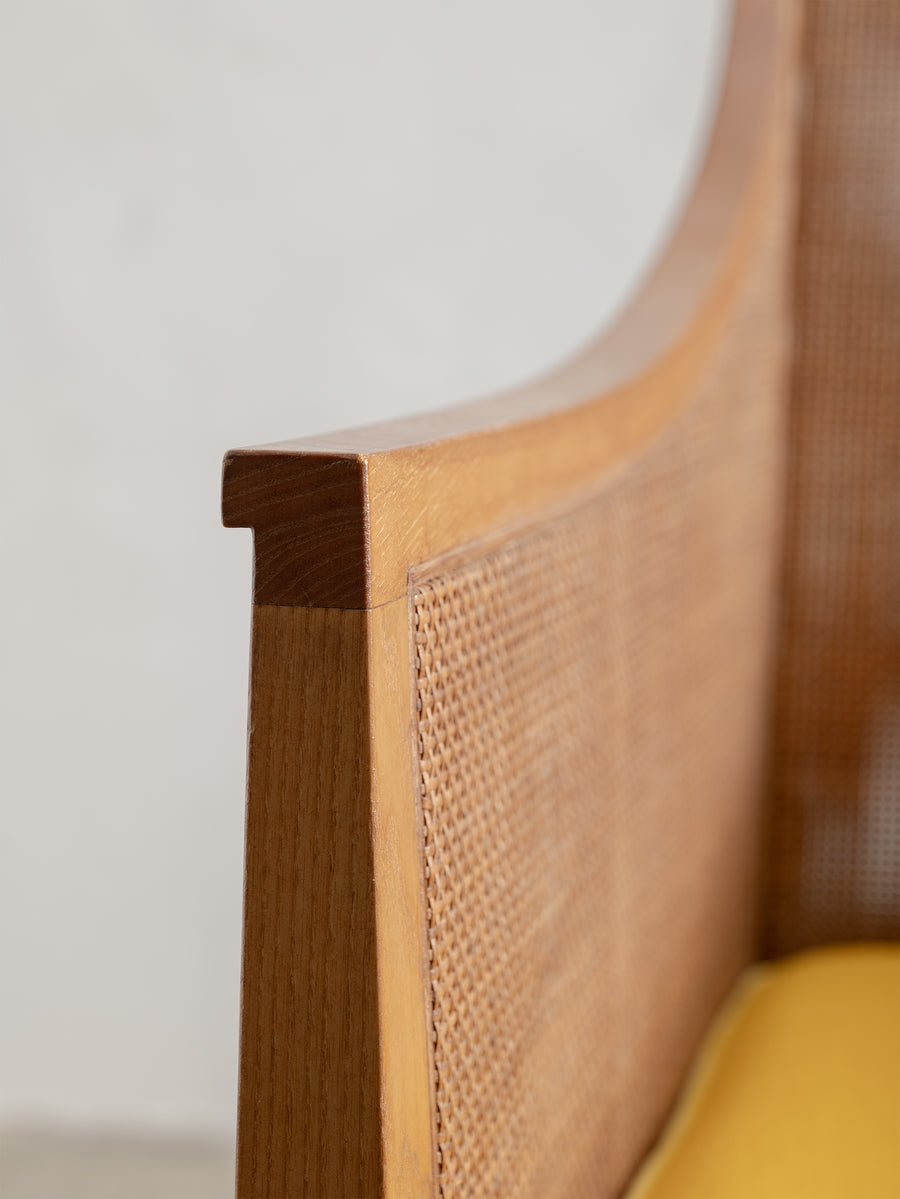 Armchair by Antonio Citterio for Flexform. With a frame crafted from beech wood, the rattan cladding runs along both the inside and outside. Featuring from wood joinery, high armrests and original lemon cushion.