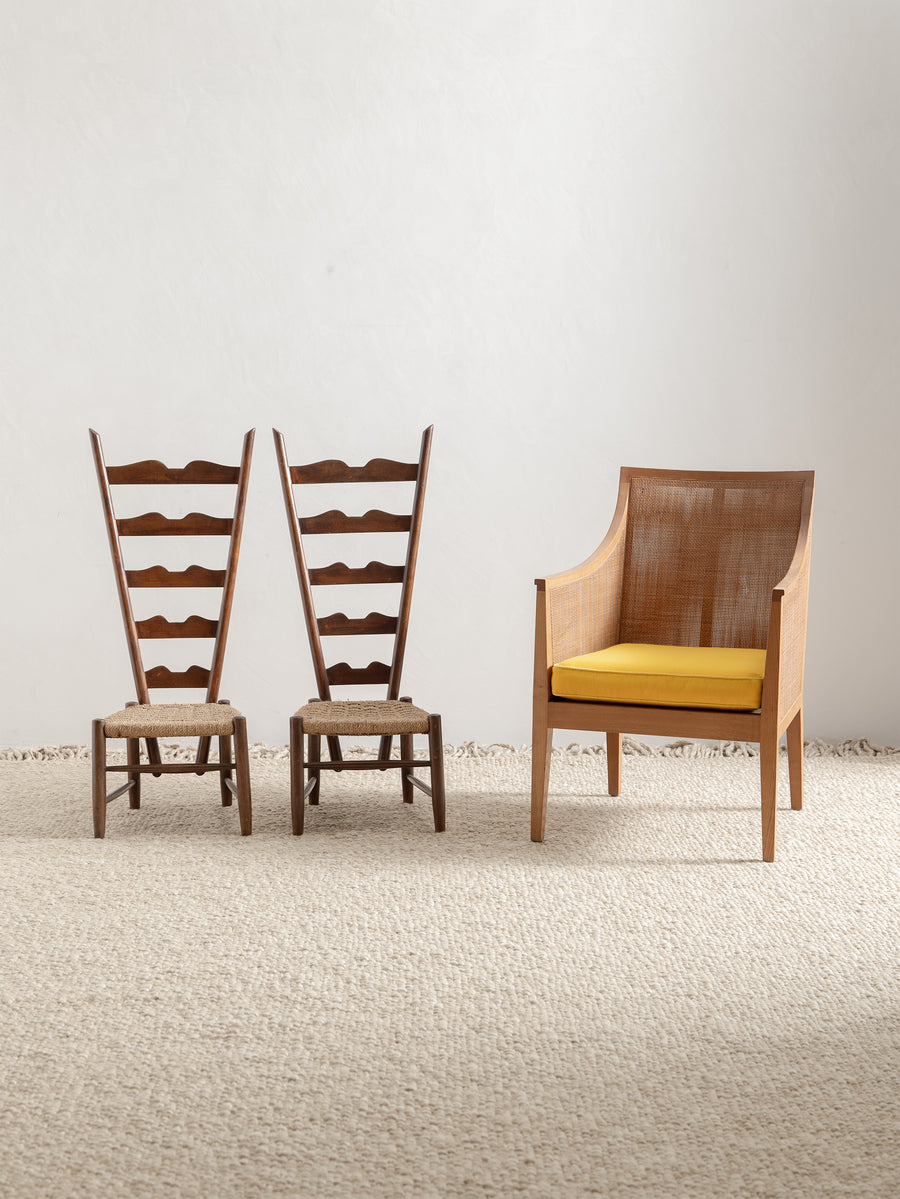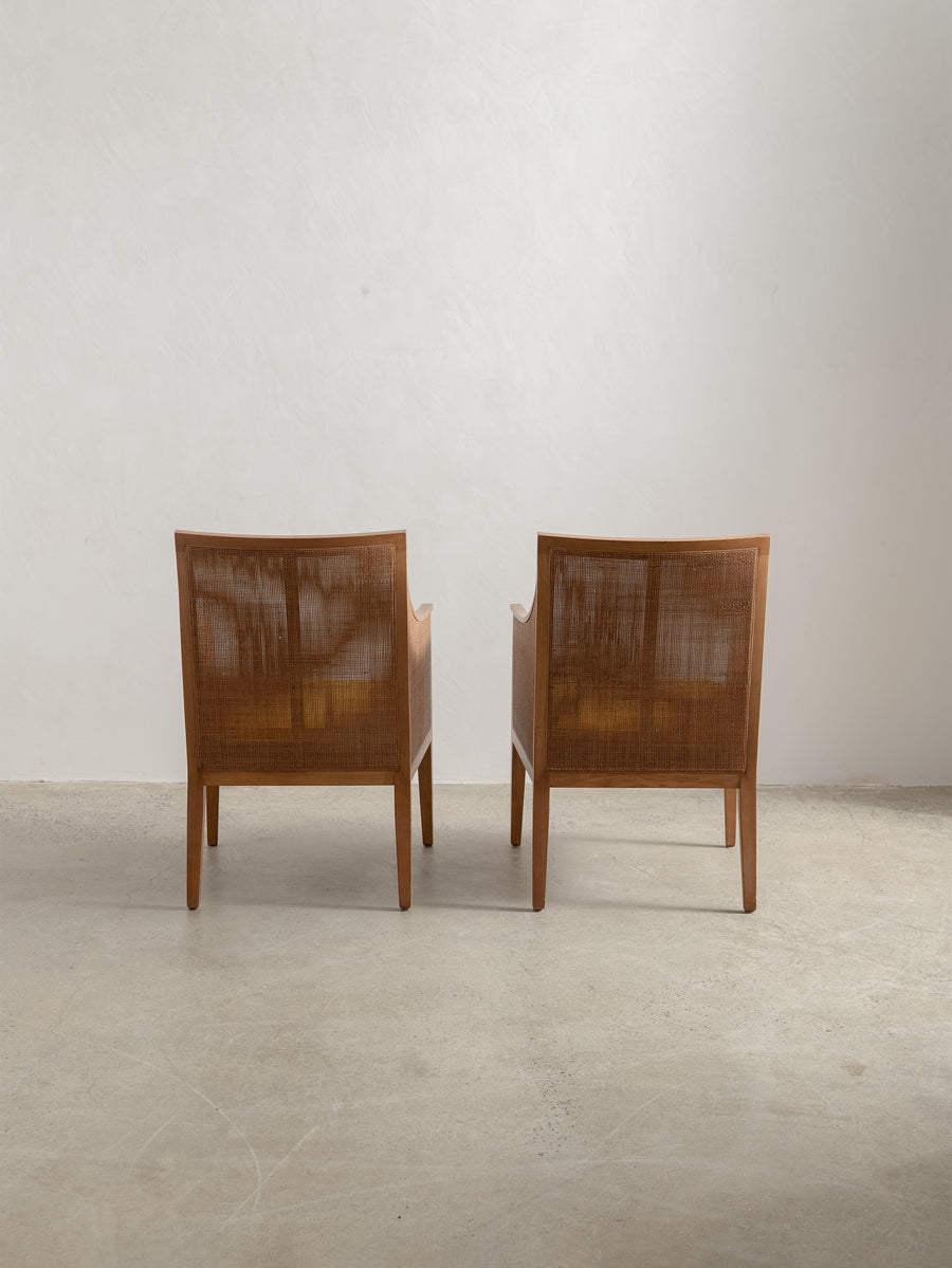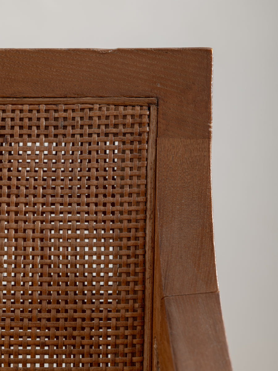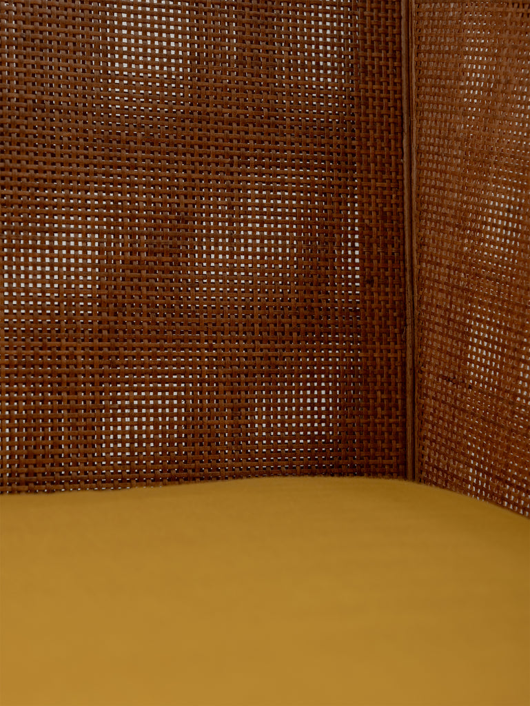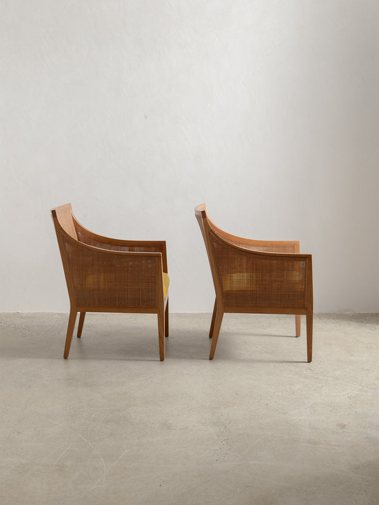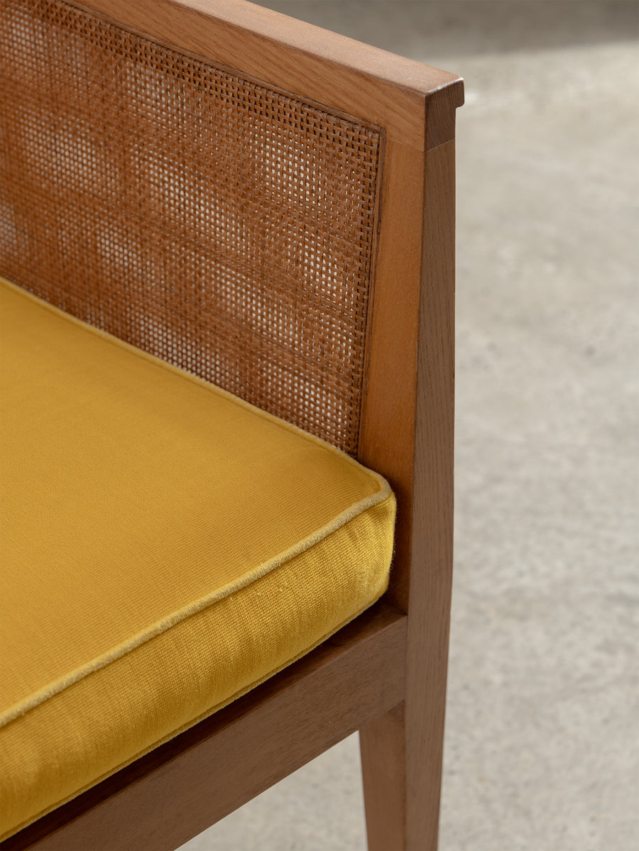 Armchair by Antonio Citterio for Flexform. With a frame crafted from beech wood, the rattan cladding runs along both the inside and outside. Featuring from wood joinery, high armrests and original lemon cushion.