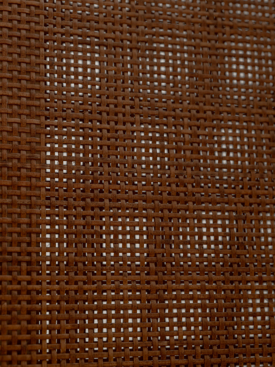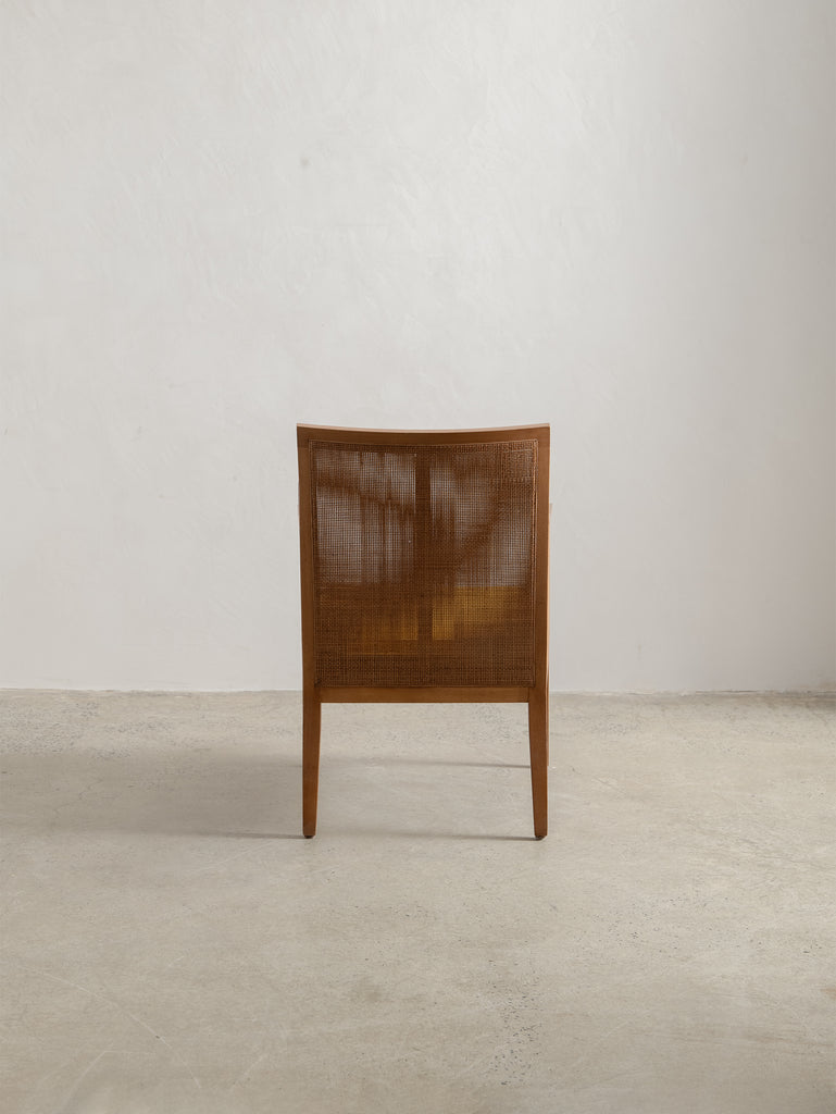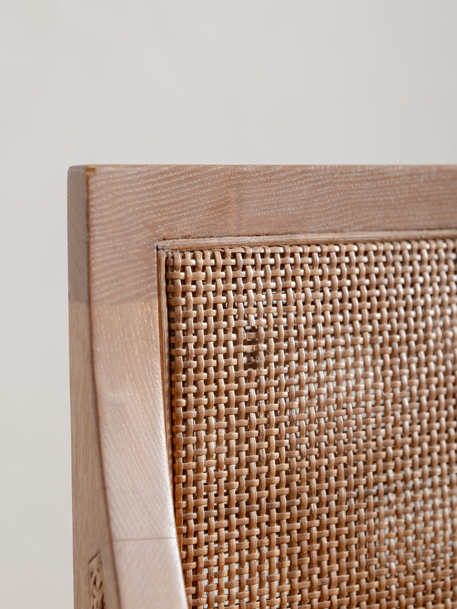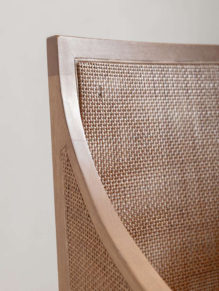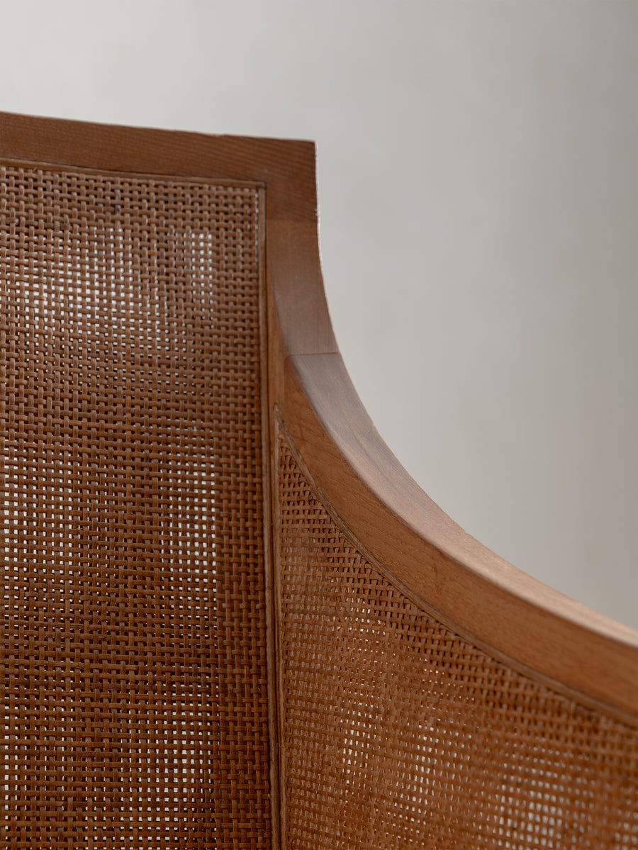 Armchair by Antonio Citterio for Flexform. With a frame crafted from beech wood, the rattan cladding runs along both the inside and outside. Featuring from wood joinery, high armrests and original lemon cushion.