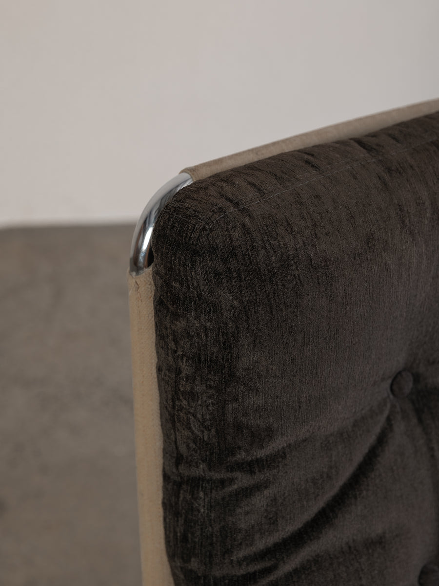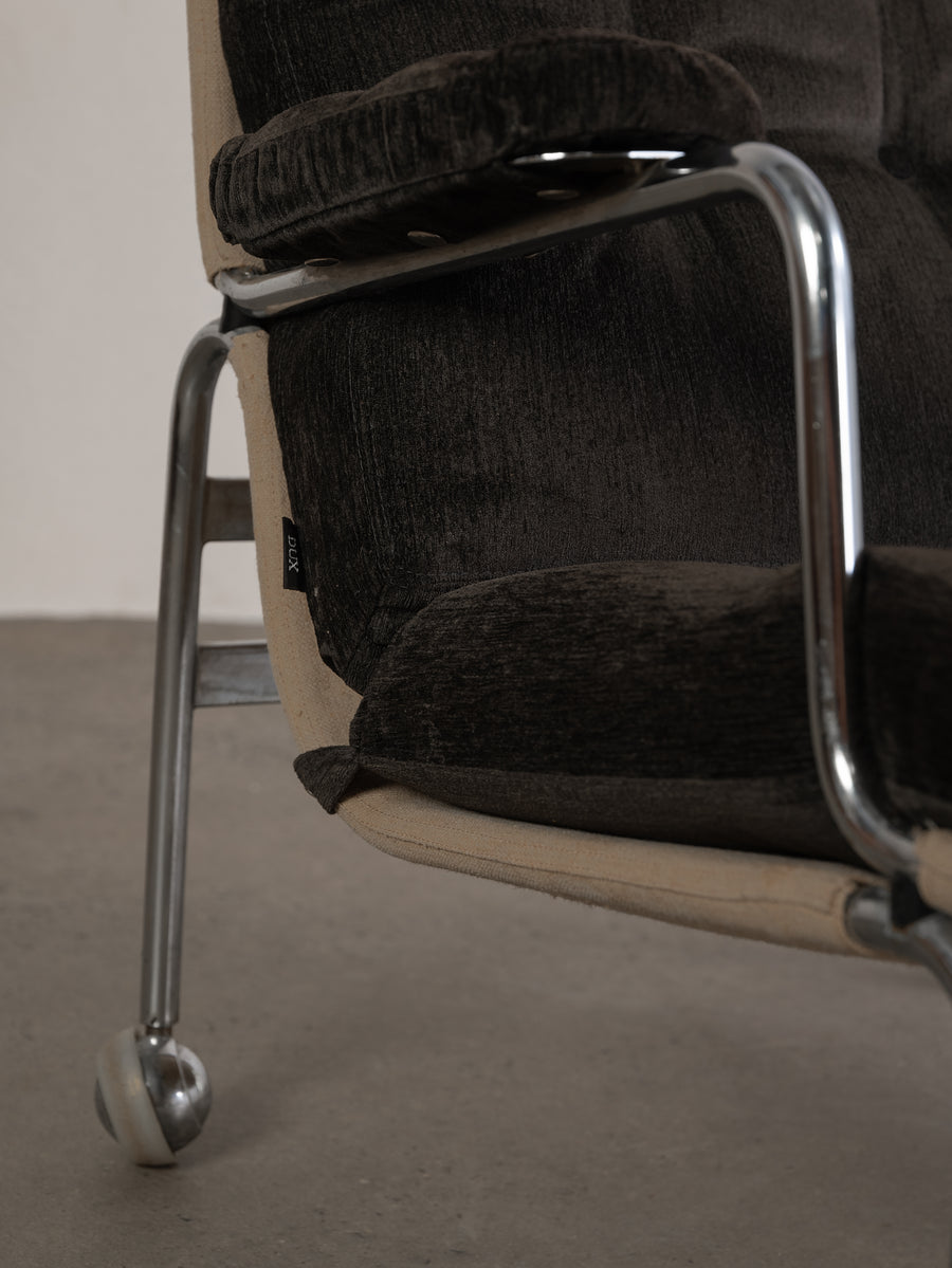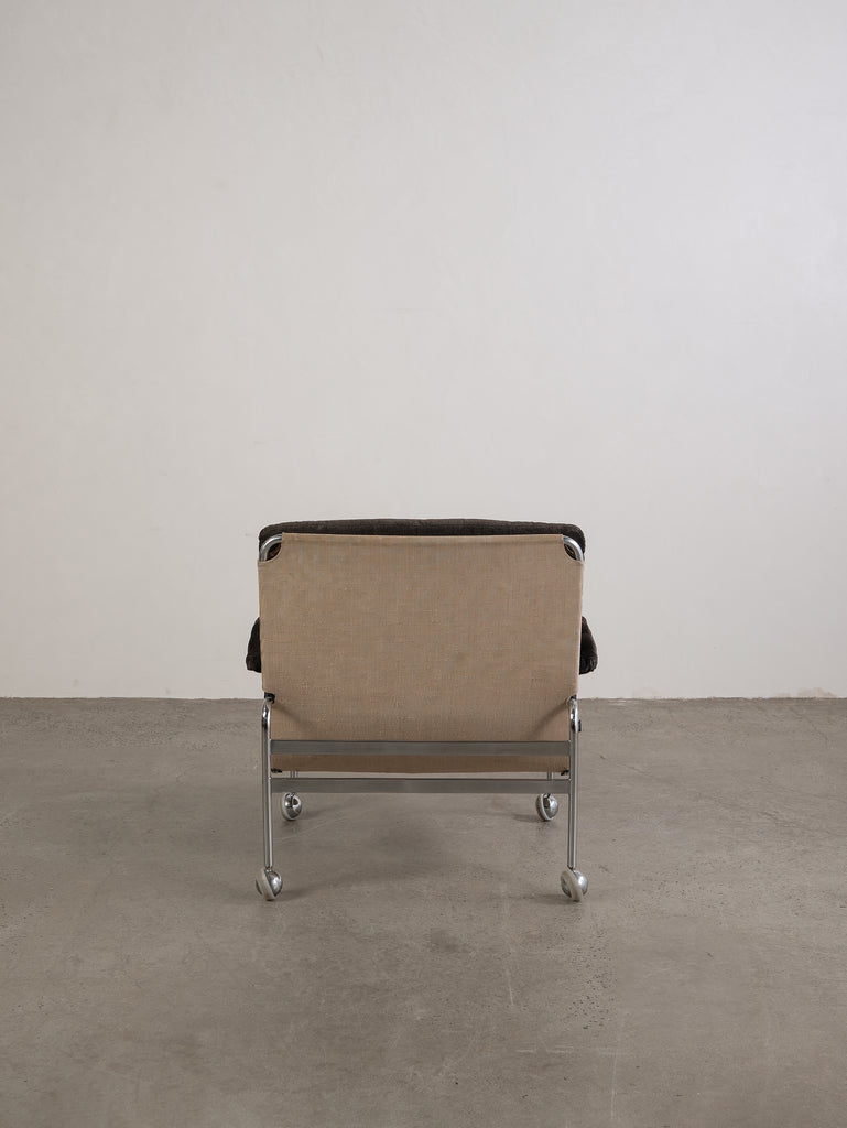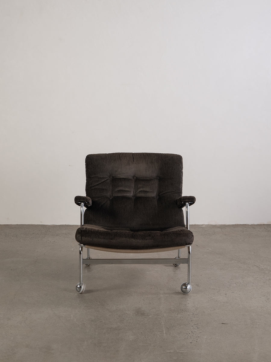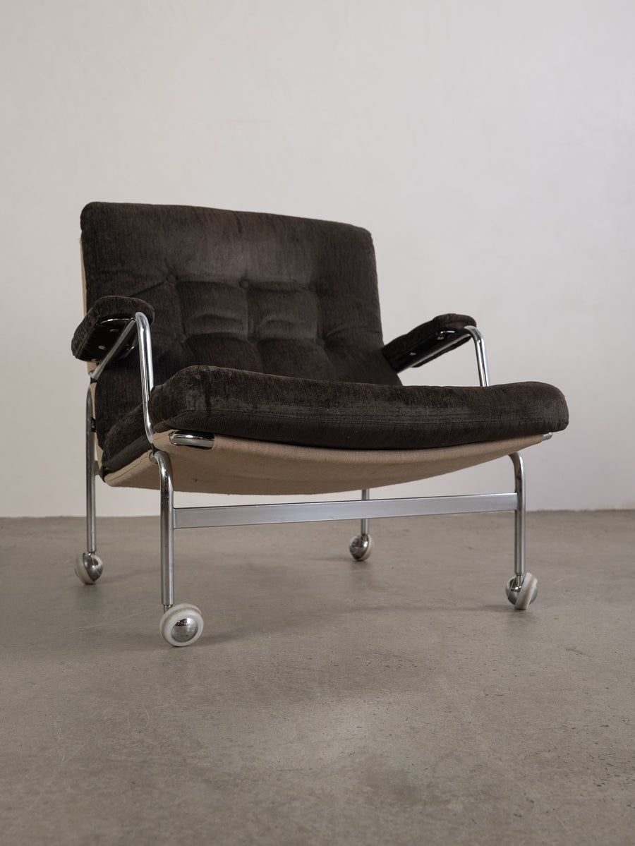 A timeless icon of Scandinavian modernism, the Karin armchair by Bruno Mathsson for Dux embodies elegance and functionality. Designed in 1969, it features a button-tufted cushion in its original fabric, resting gracefully on a chrome-plated steel frame with Mathsson’s signature supportive webbing.