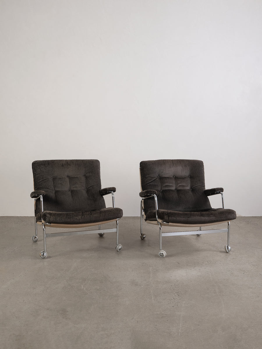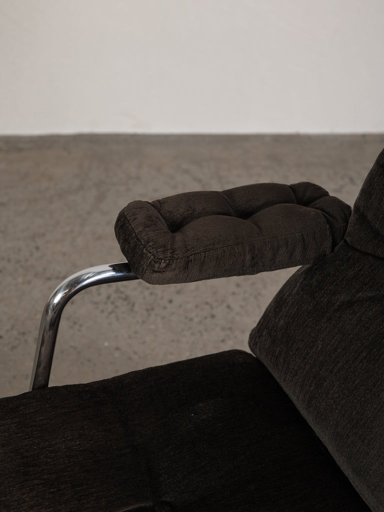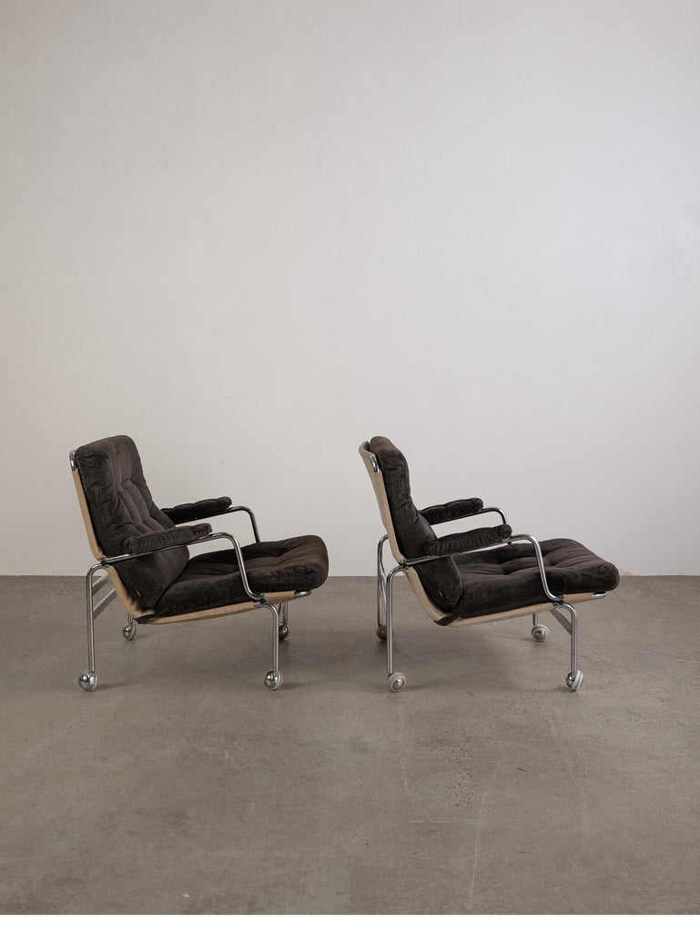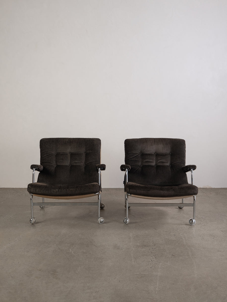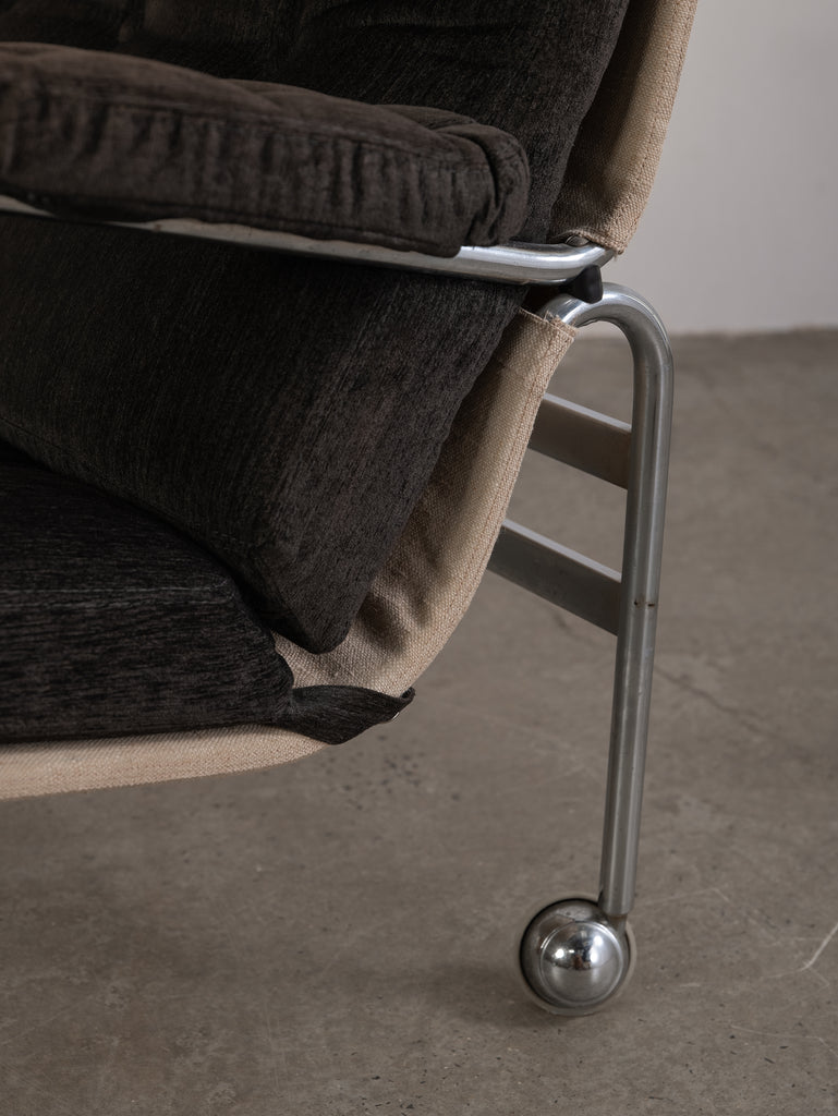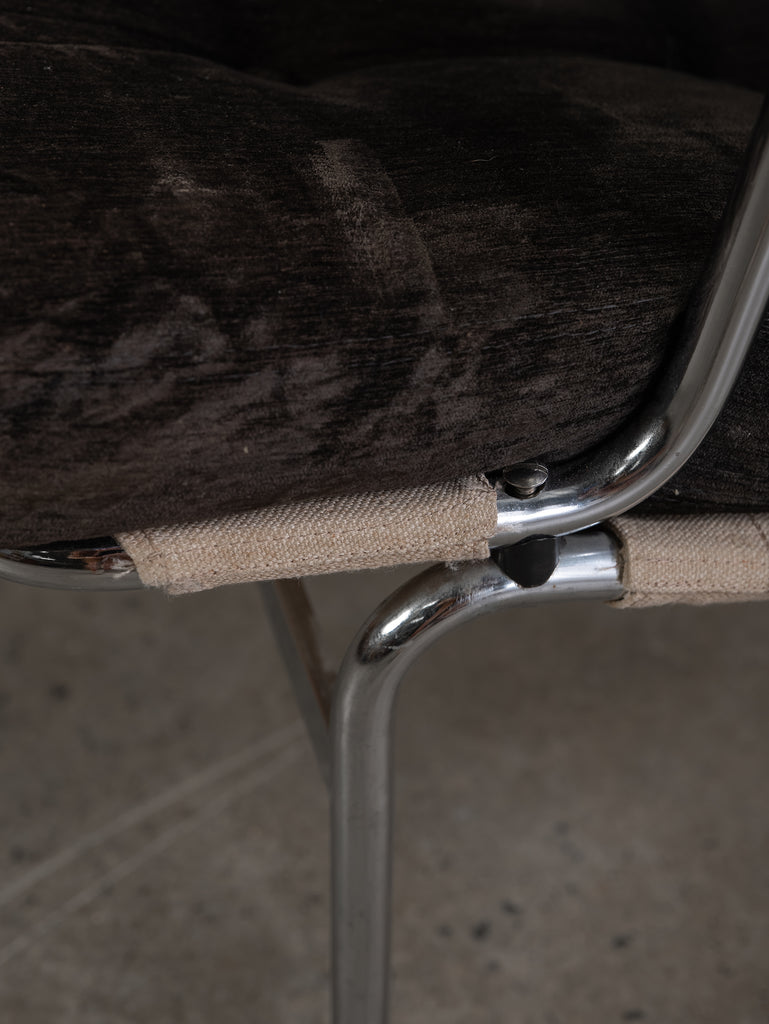 A timeless icon of Scandinavian modernism, the Karin armchair by Bruno Mathsson for Dux embodies elegance and functionality. Designed in 1969, it features a button-tufted cushion in its original fabric, resting gracefully on a chrome-plated steel frame with Mathsson’s signature supportive webbing.