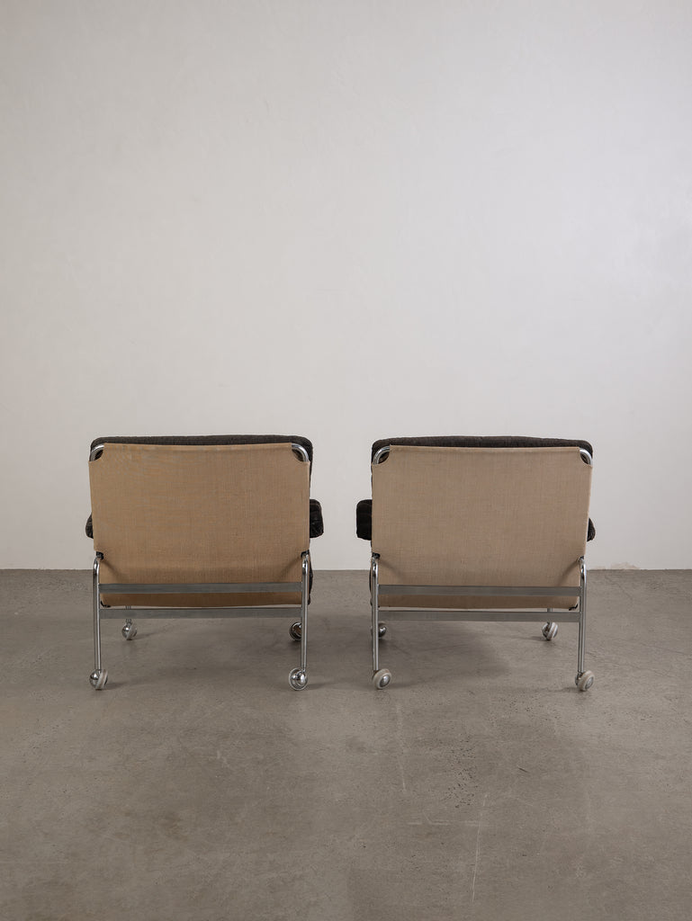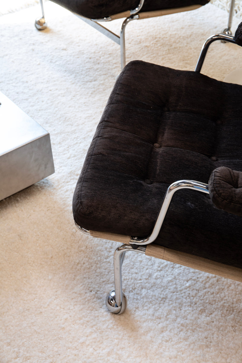 Thoughtfully crafted for both comfort and style, the Karin’s clean lines and understated sophistication make it a versatile addition to any interior. Casters provide effortless mobility, while the chrome frame remains in premium condition, adding a sleek, contemporary edge.