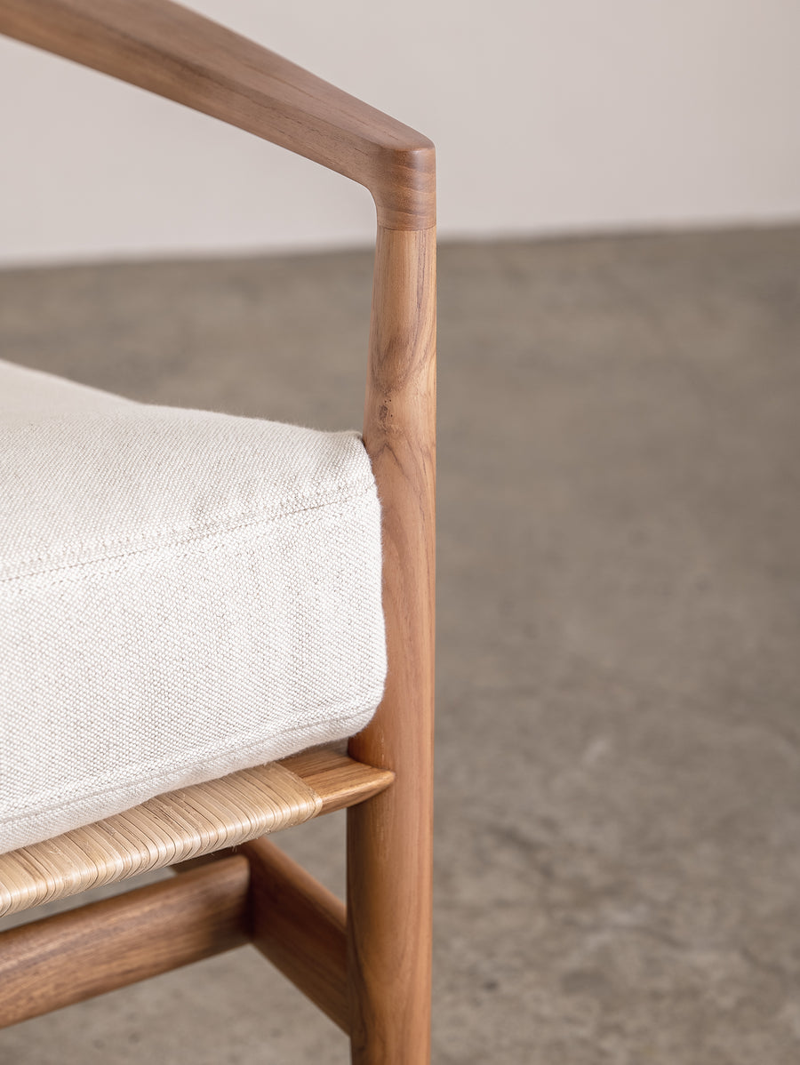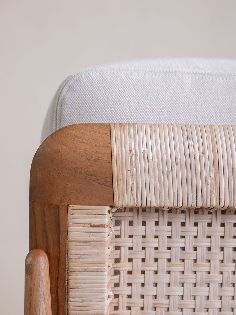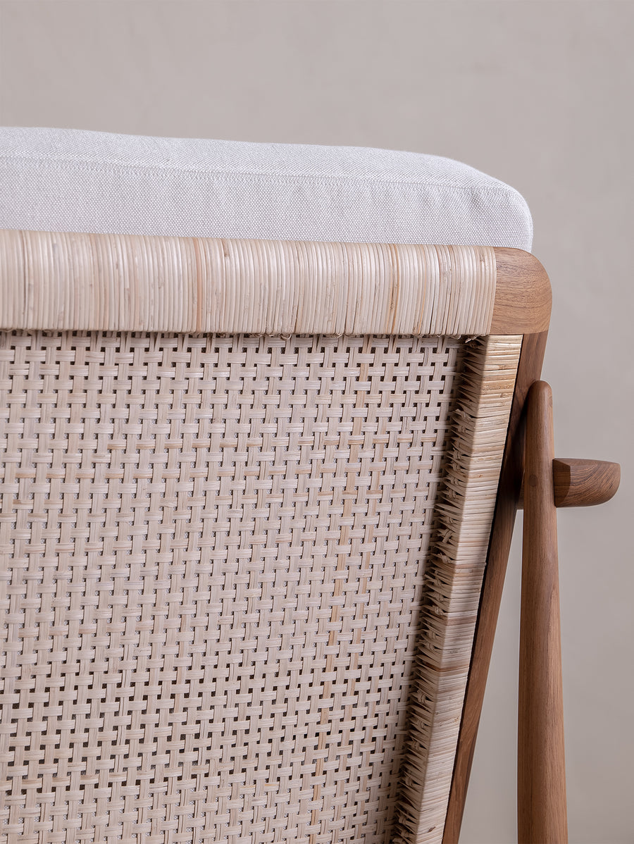 The Tangali Comfort Chair is a spacious and cozy lounge chair that is accompanied by back and seat cushions; designed for ultimate relaxation. This luxurious piece features hand-spun cotton fabric cushions that are filled with foam and wadding atop the signature Tangali cane weave and teak timber frame.