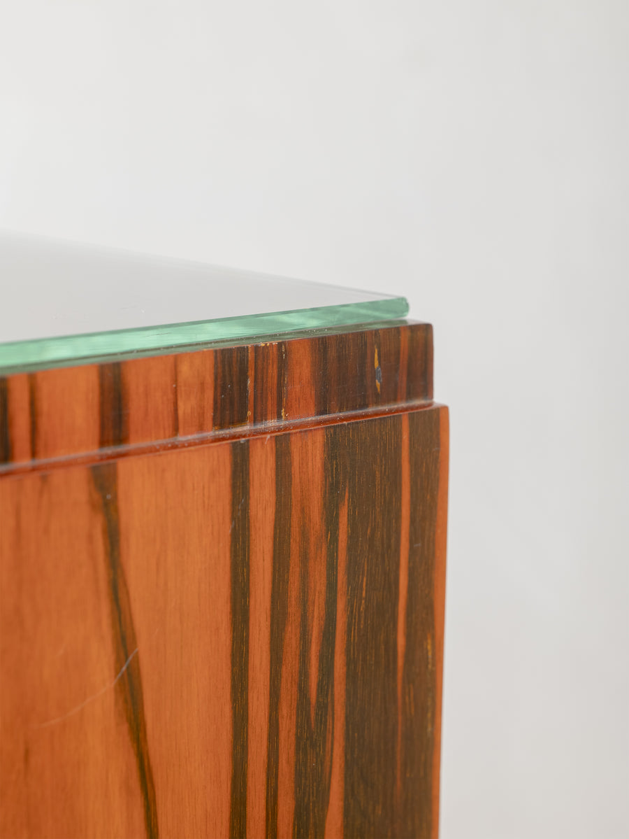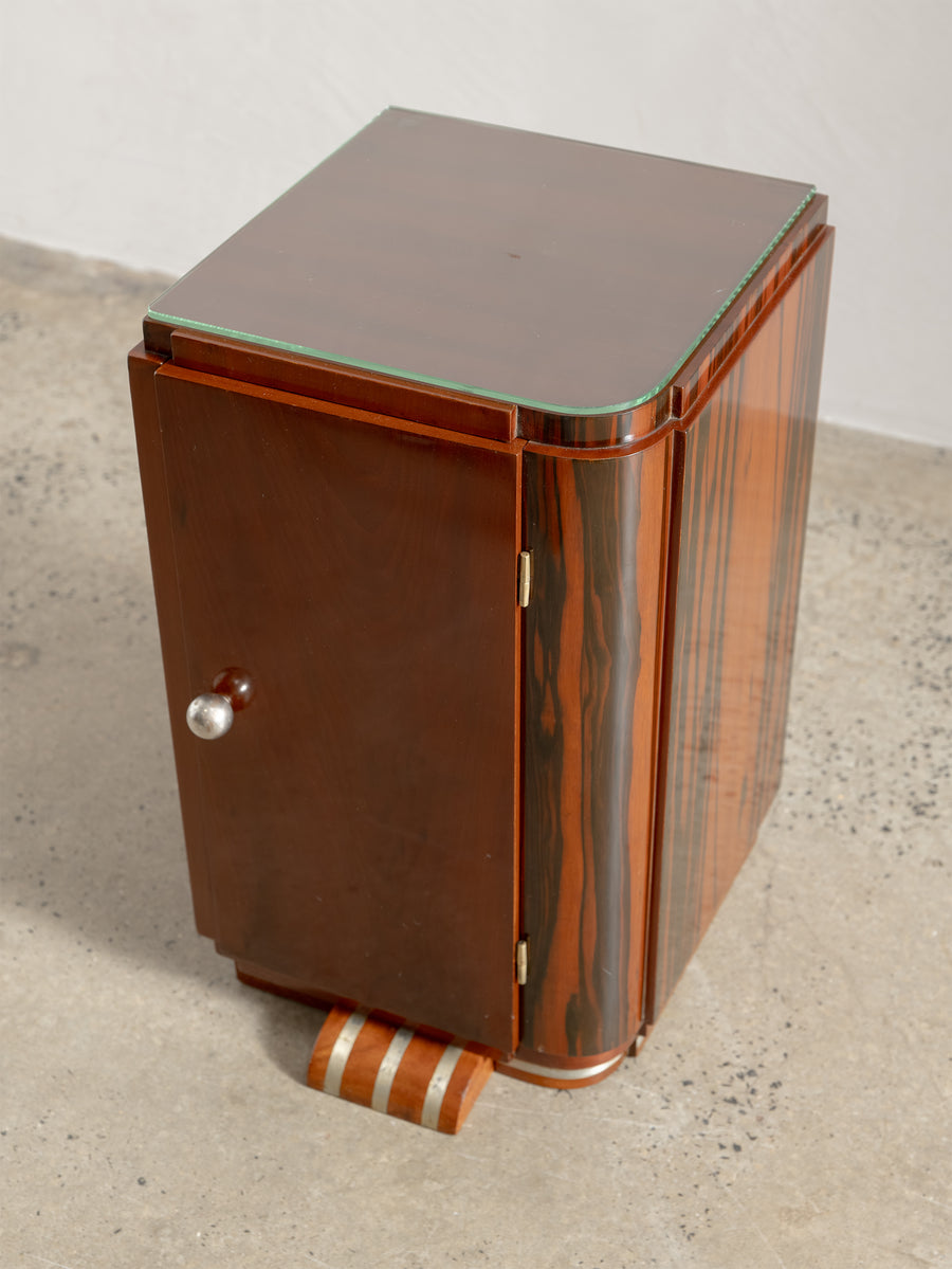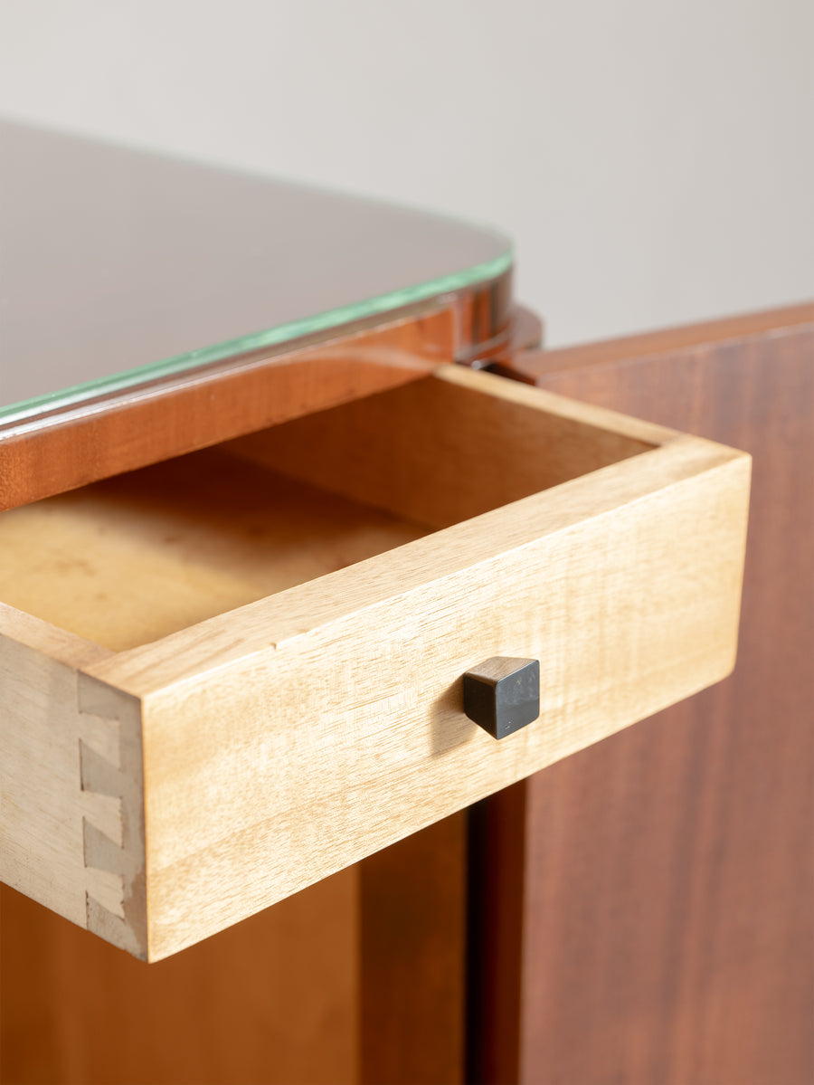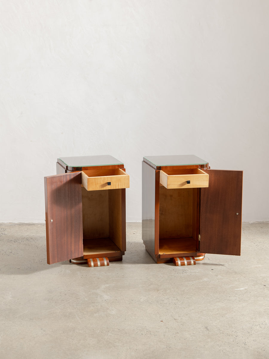 Elegant yet purposeful, each table features a drawer and cupboard, seamlessly integrated into the design. The contrast of tone and material creates a sense of depth and refinement, reflecting the craftsmanship and attention to detail synonymous with the Art Deco period.