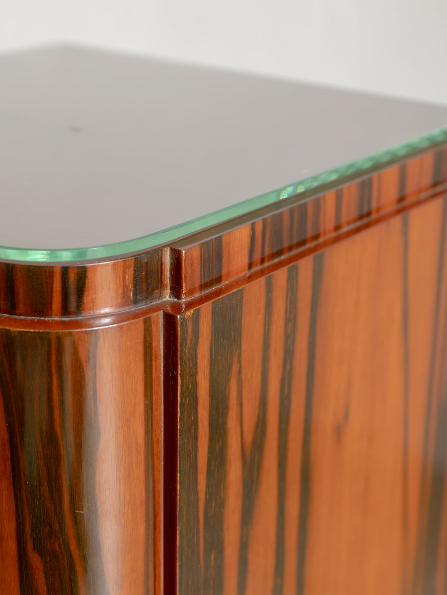 An exceptional pair of 1920s Art Deco bedside tables, showcasing the richness of rosewood paired with striking ebony accents. The beautifully figured grain is set against bold, architectural lines, with softly curved edges and sculptural stepped bases that ground each piece with quiet confidence. Finished with a glass top, for added functionality and protection to the wood.