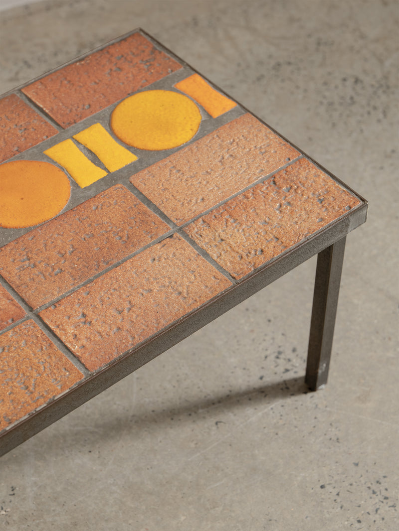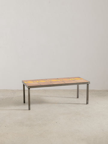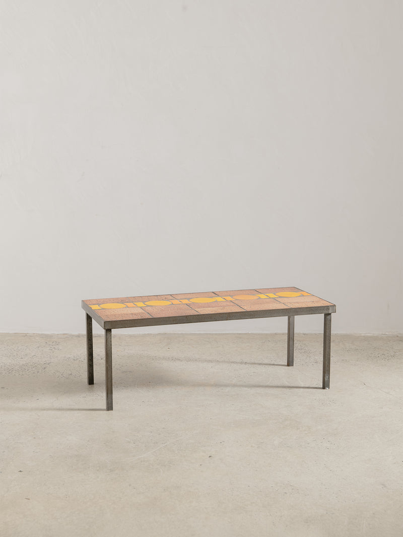 Ceramic-topped table from Vallauris, France, featuring hand-glazed terracotta tiles framed by a slender metal base. The design is defined by its warm earth tones and a striking row of sunburst yellow motifs through the centre - a hallmark of the Vallauris ceramic tradition. With its sculptural form and artisanal character, this piece brings a touch of mid-century French craftsmanship to contemporary spaces.