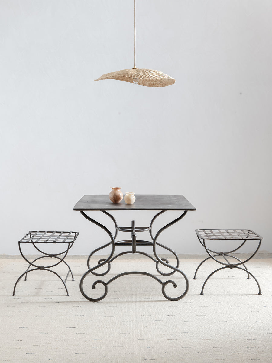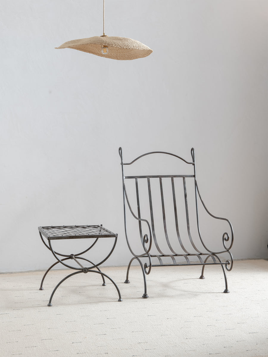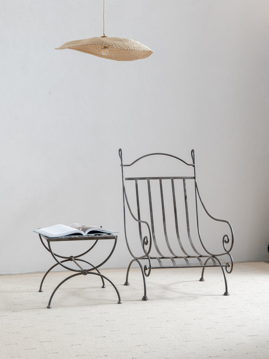 A sculptural 1960s iron side table, defined by its woven lattice top and gently arched supports. Light in form yet strong in structure, it carries the quiet presence of hand-forged craftsmanship and the patina of time.