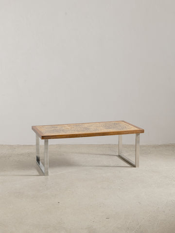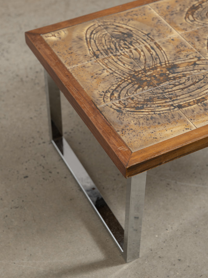 Wooden and ceramic coffee table by Jean D’Asti, created in Vallauris, France during the 1970s. The tiled surface features an abstract, hand-enameled design in earthy tones of beige, brown, and black — characteristic of D’Asti’s rustic yet sophisticated style. Resting on a solid wood frame with polished metal legs, the piece captures the spirit of the French Riviera’s ceramic movement, where art and function meet in perfect balance.