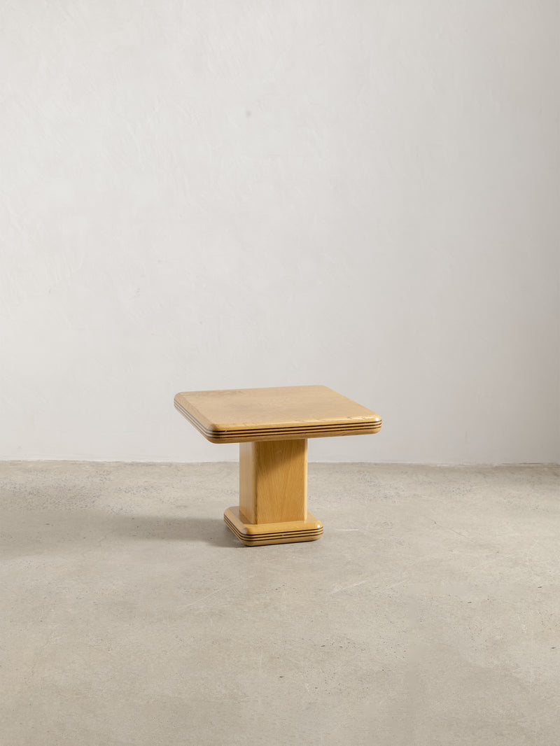 A refined 1980s coffee table characterised by its soft, architectural lines and minimalist form. The rectangular top rests on a pedestal base with rounded edges and layered detailing that give the piece a quiet sense of depth and proportion.
