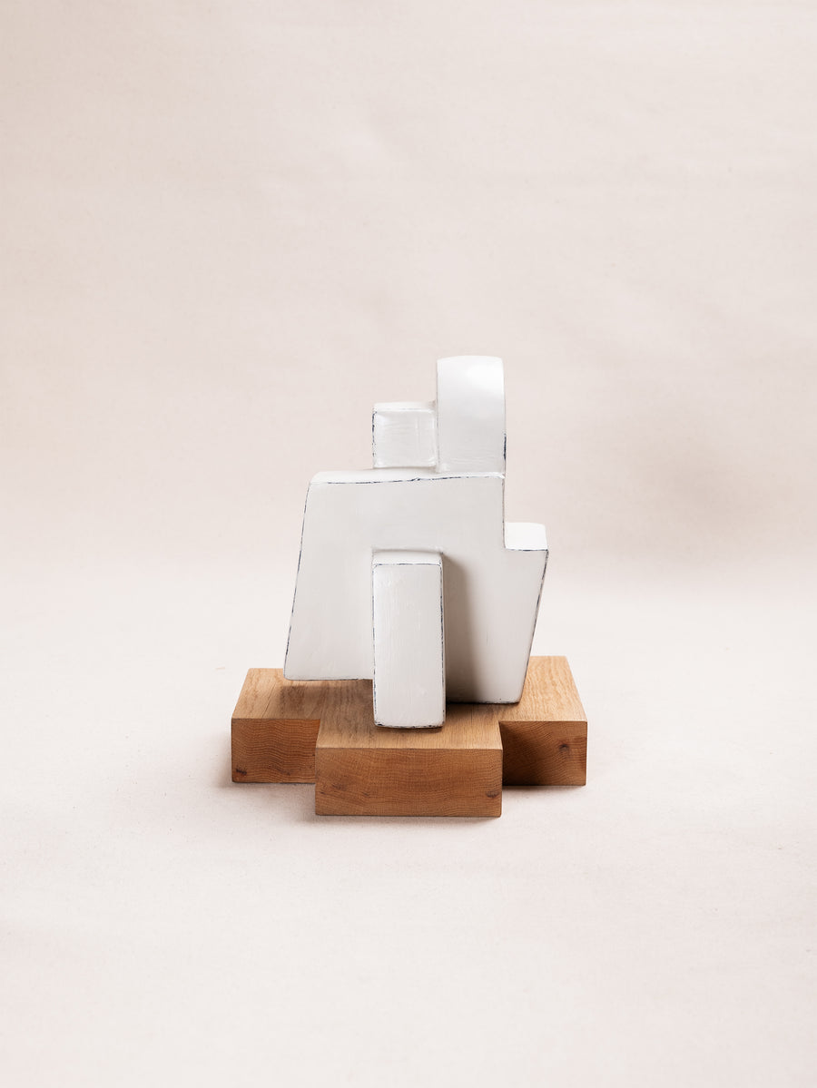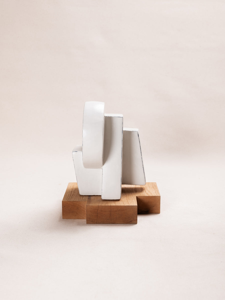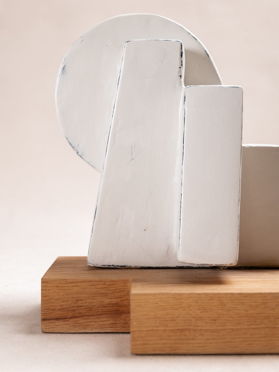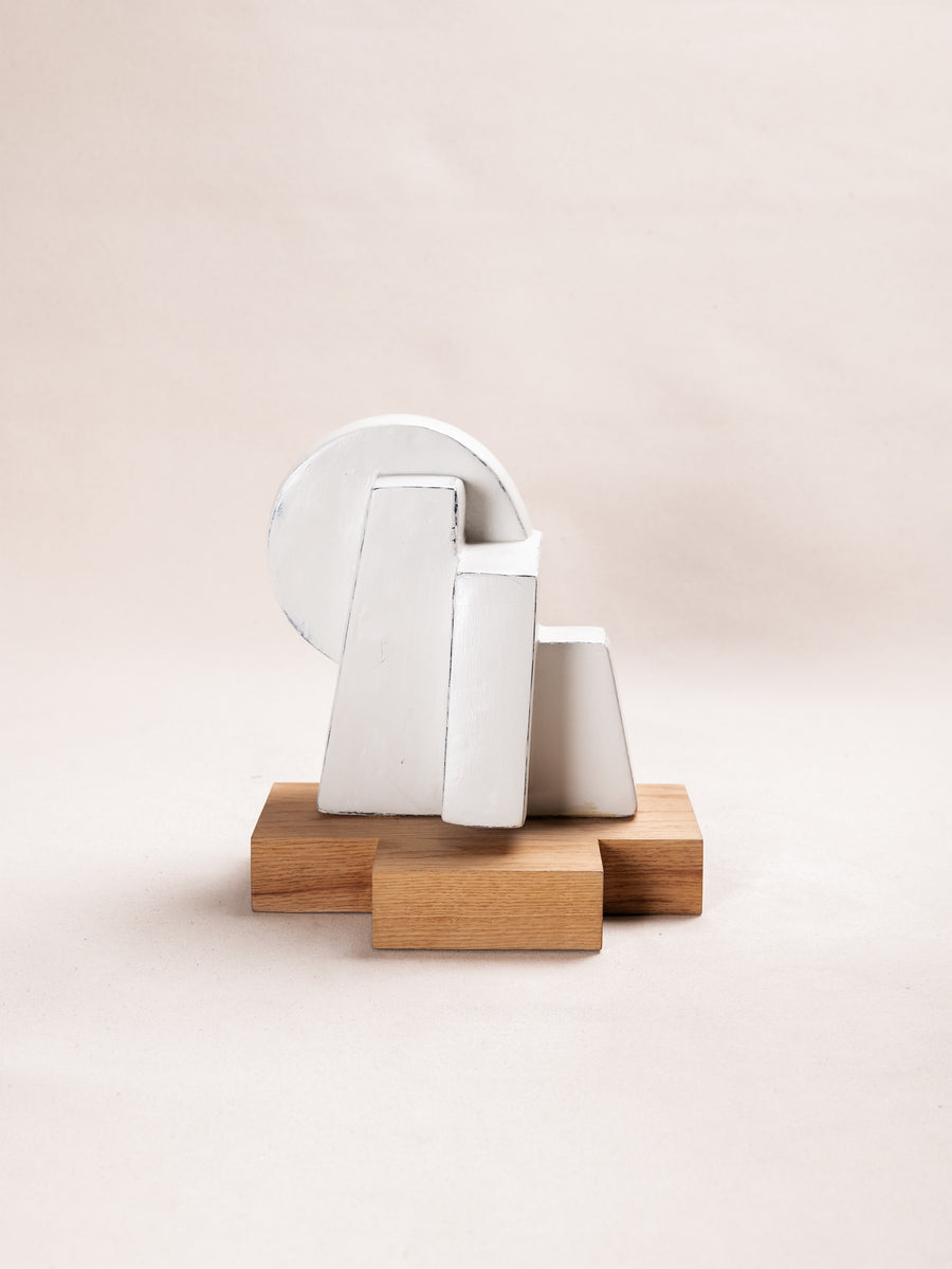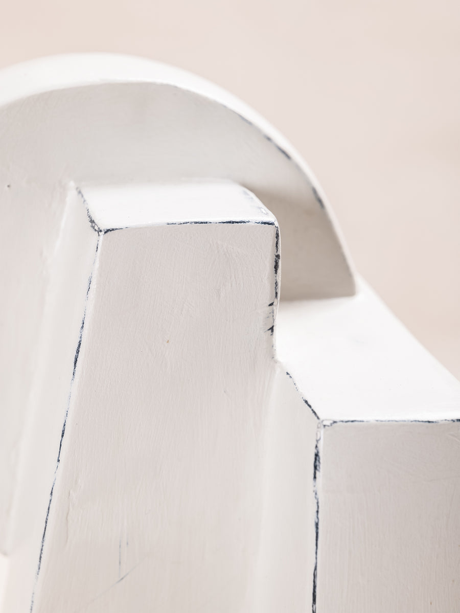 A compact miscellany of irregular 3D truncated square like prisms, with semicircular formation, constructed as one irregular shape, with unique perspective from every angle. Alabaster Hued finish.