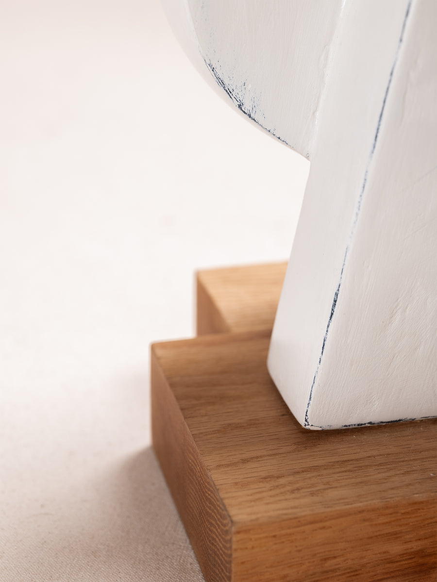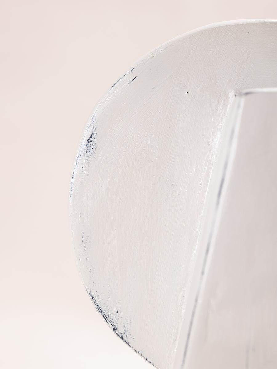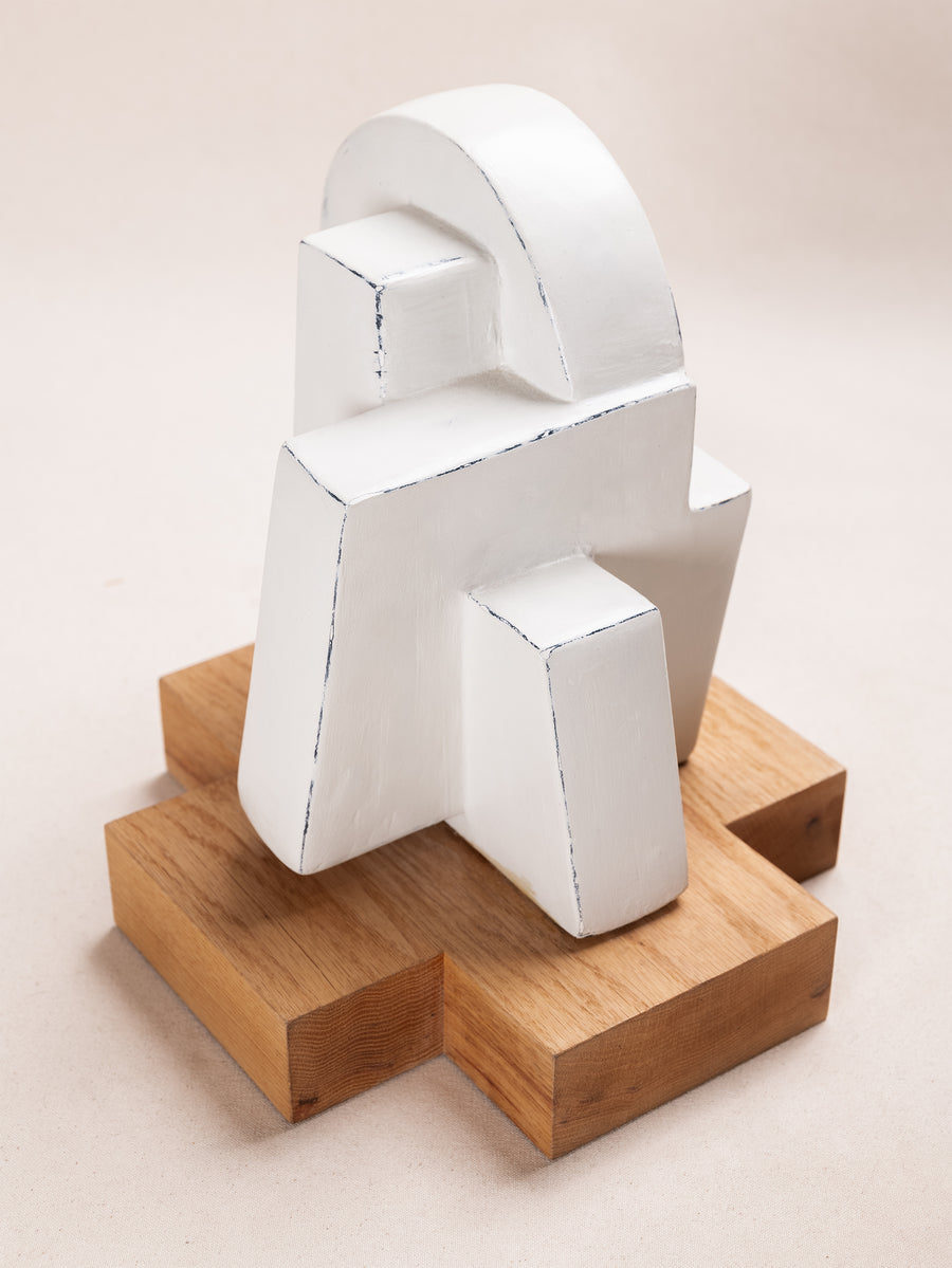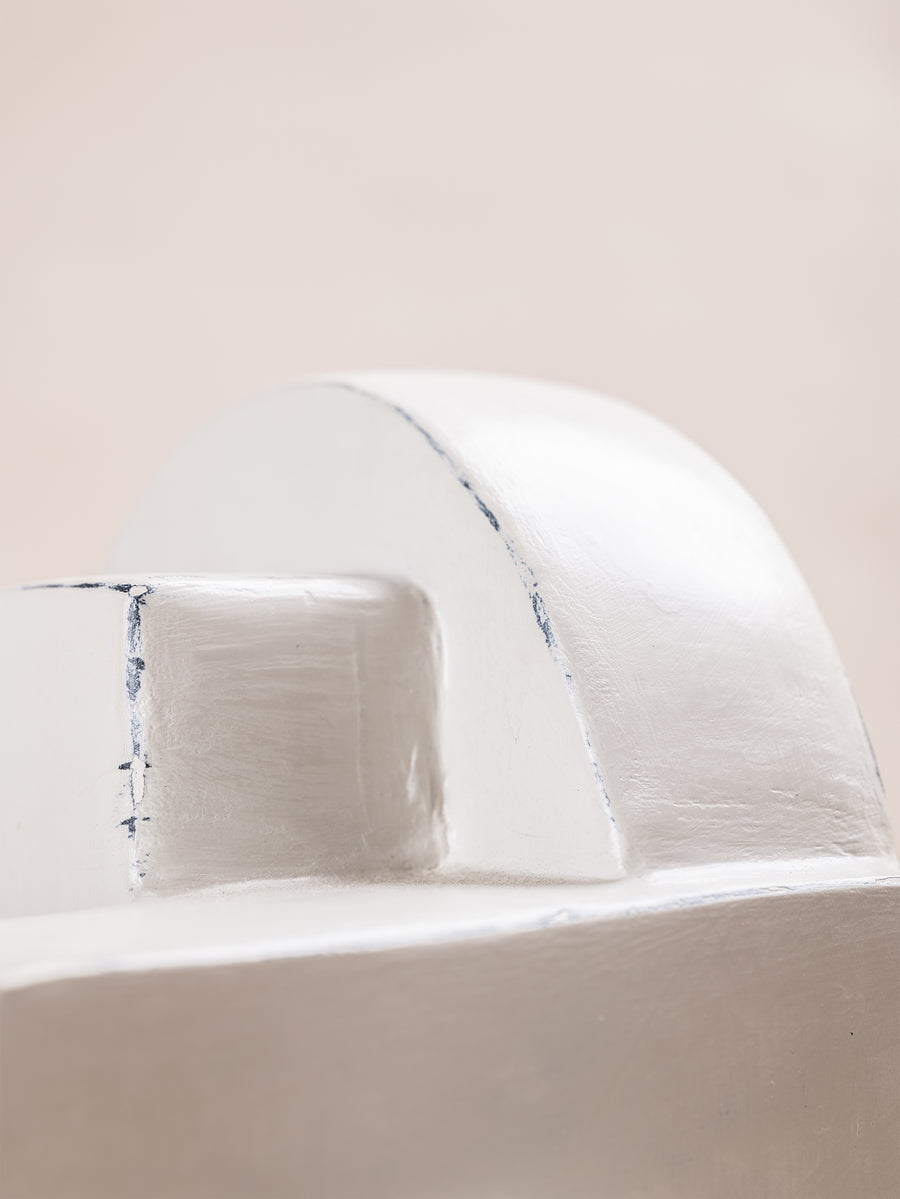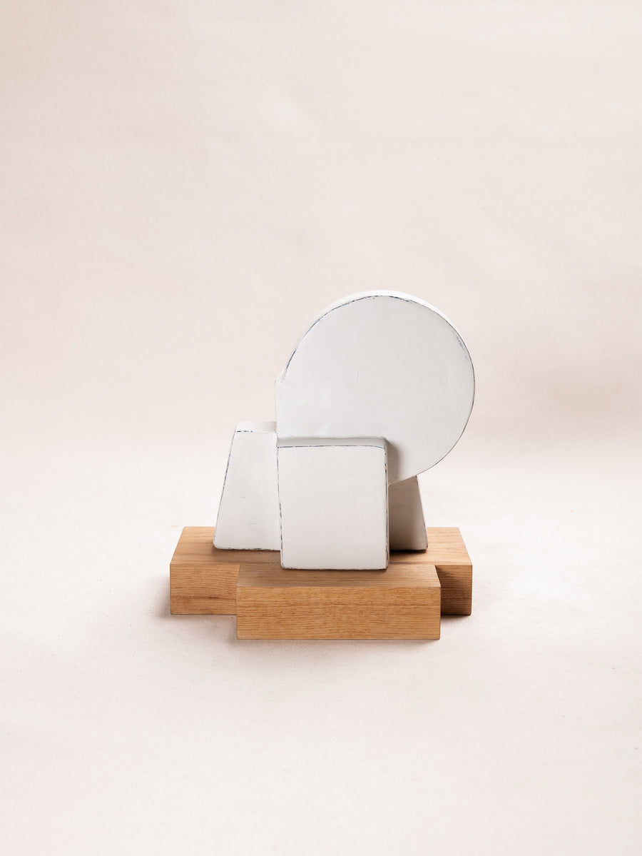 A compact miscellany of irregular 3D truncated square like prisms, with semicircular formation, constructed as one irregular shape, with unique perspective from every angle. Alabaster Hued finish.