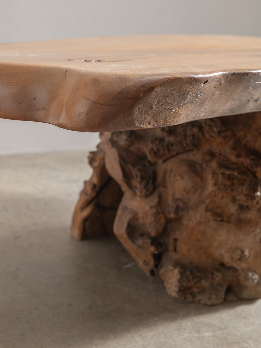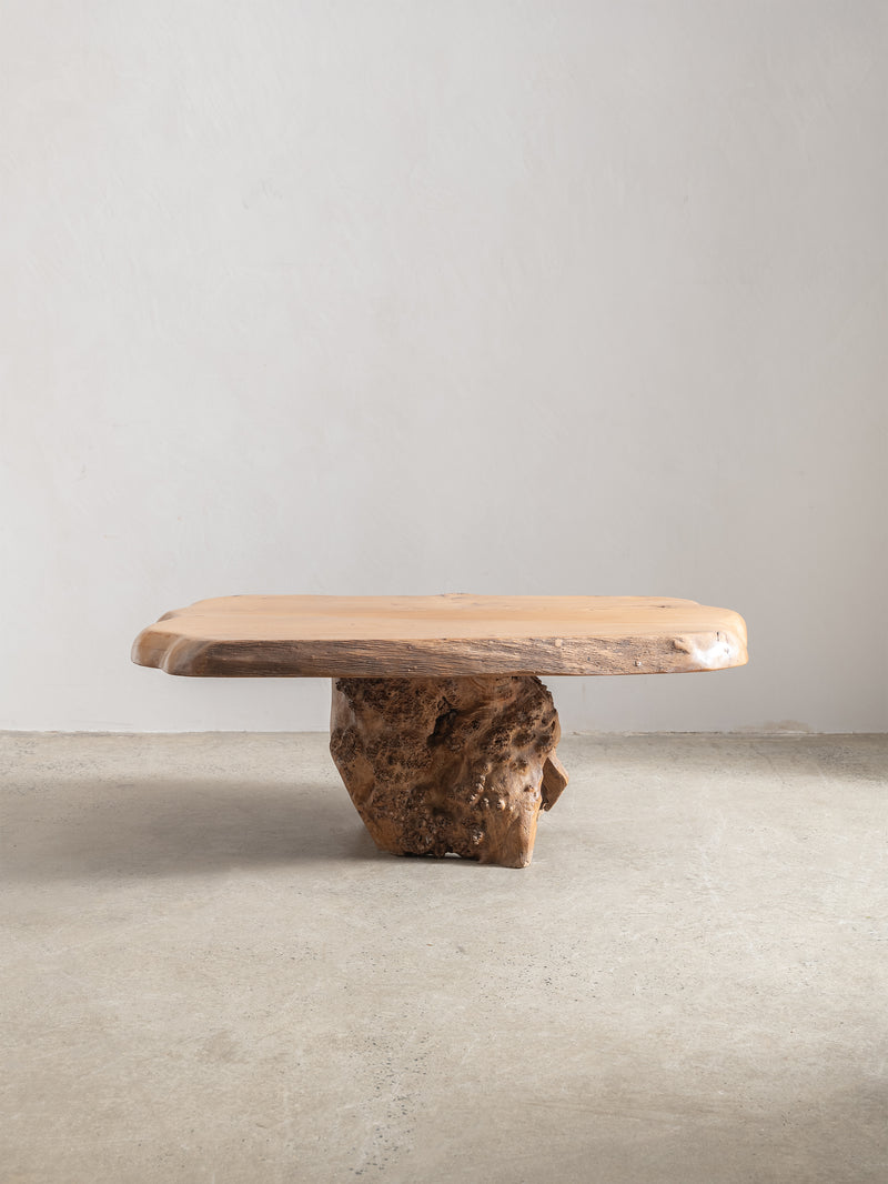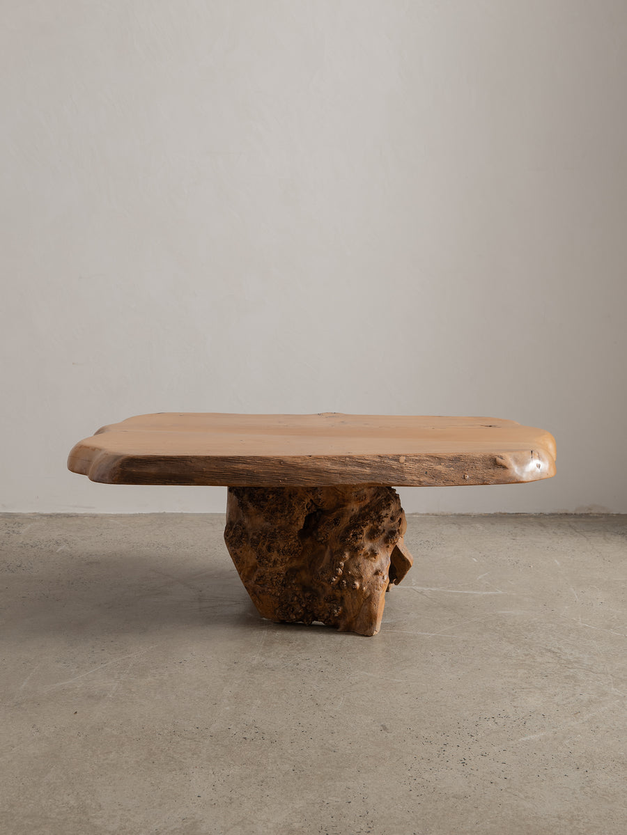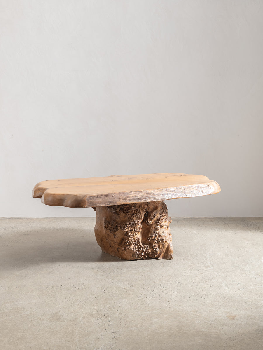 This brutalist elm coffee table brings together raw strength and refined simplicity. Its smooth top contrasts beautifully with a burly, sculpted base, grounding the piece with a bold presence. The natural veining and rich texture of the elm wood give it a unique character, celebrating the organic beauty of the material. Striking yet understated, this table serves as a true centrepiece.