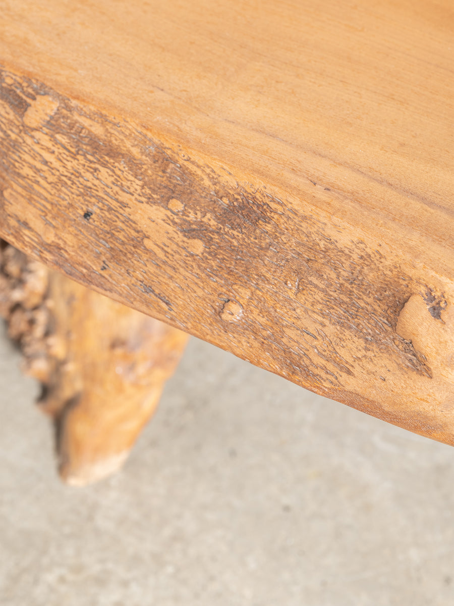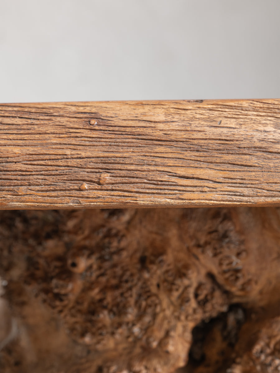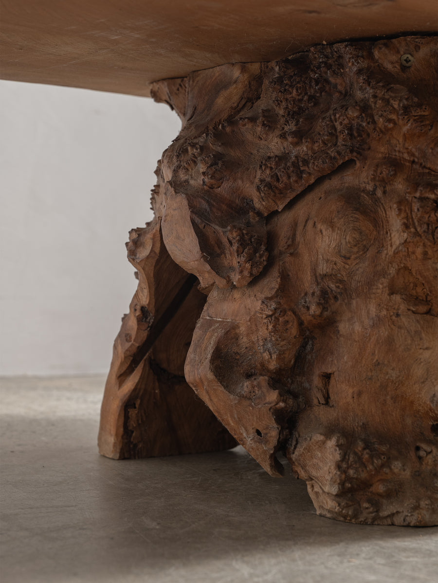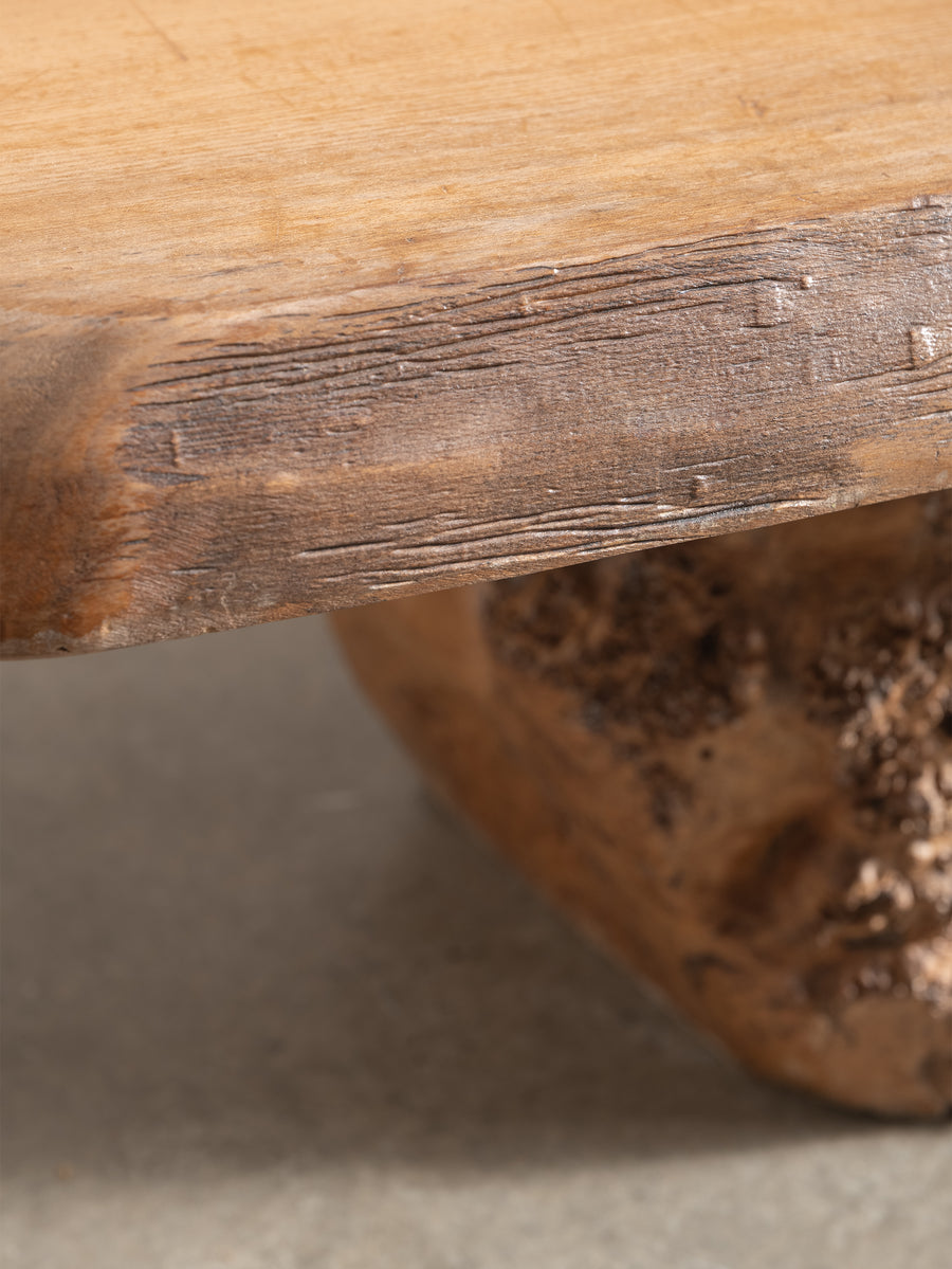 This brutalist elm coffee table brings together raw strength and refined simplicity. Its smooth top contrasts beautifully with a burly, sculpted base, grounding the piece with a bold presence. The natural veining and rich texture of the elm wood give it a unique character, celebrating the organic beauty of the material. Striking yet understated, this table serves as a true centrepiece.