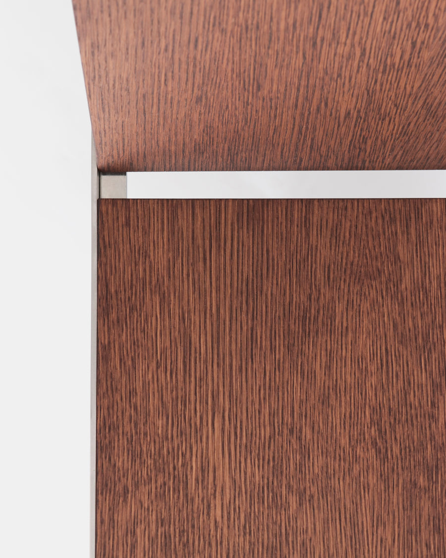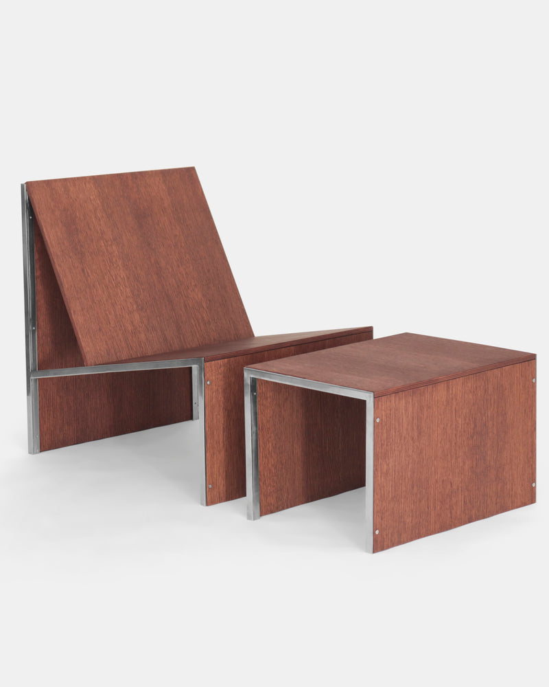 Crafted from plywood with oak veneer, the Lounge Chair features a vibrated stainless steel frame and striking angular design.