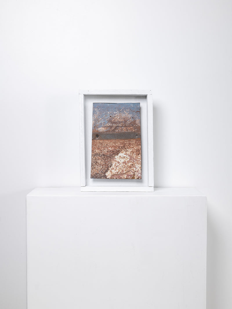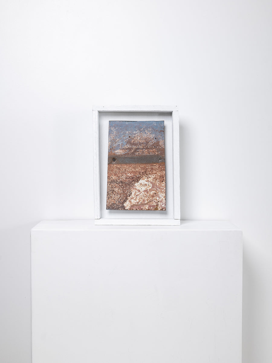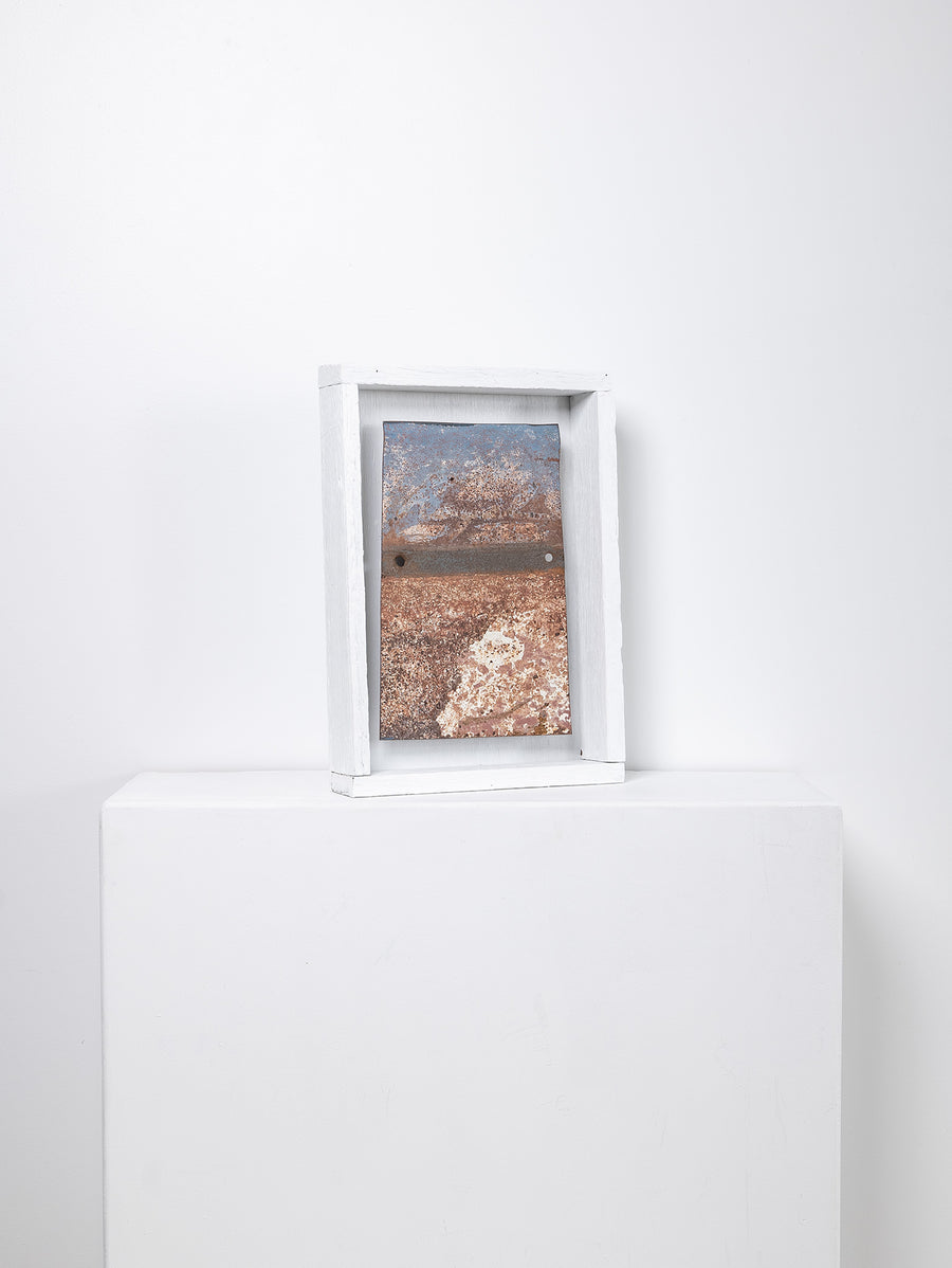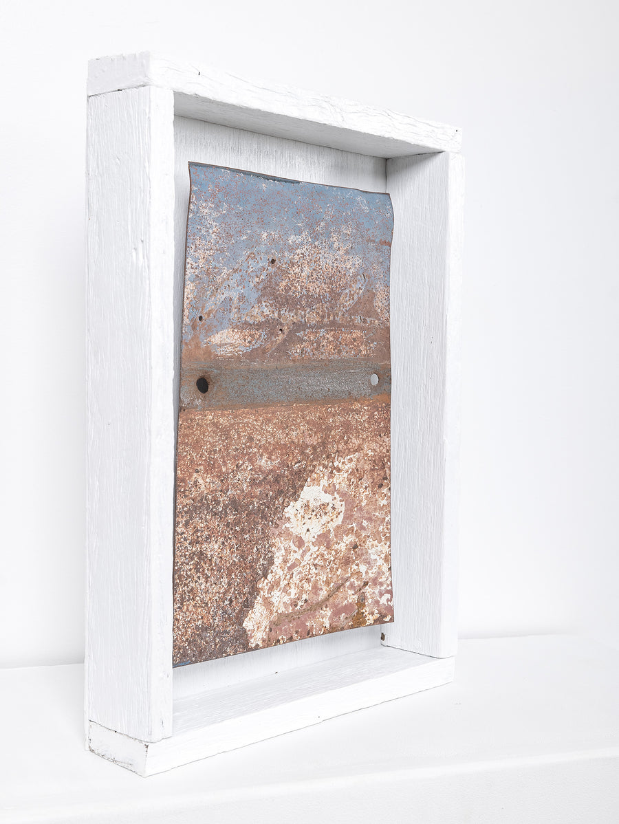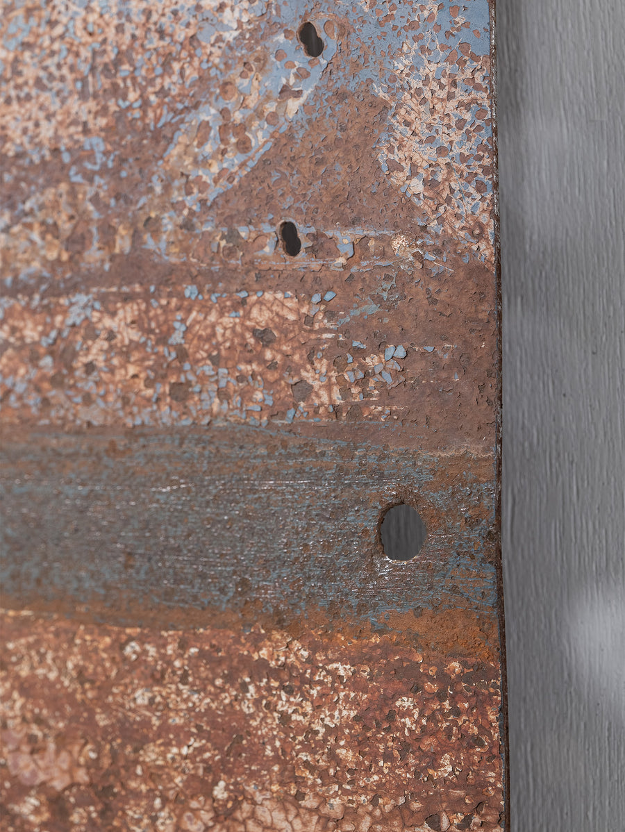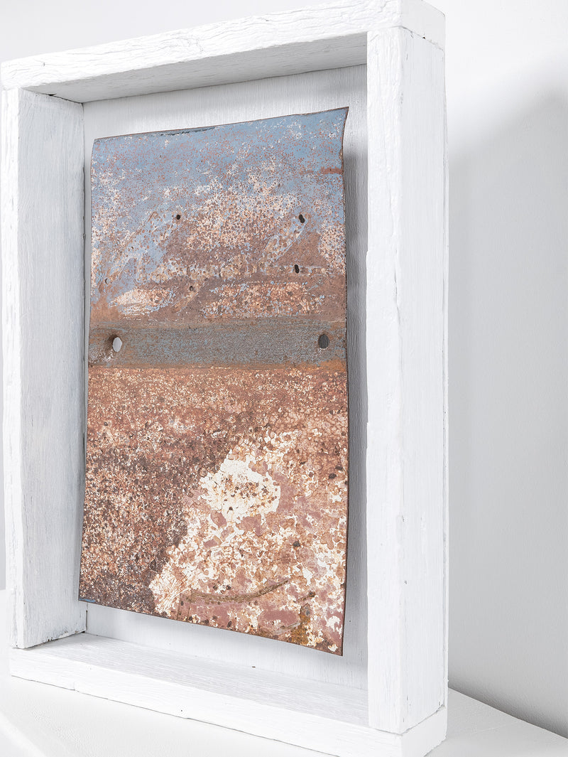 Saskia Folk's 'Panel Work' series features panels of metal sourced from abandoned steel carcasses across thousands of square kilometres of desert in Australia - from the Western Desert of Kiwirrkurra, Mt Ebenezer near Uluru, Woomera and Willington SA, and the old mining town of Broken Hill in NSW.