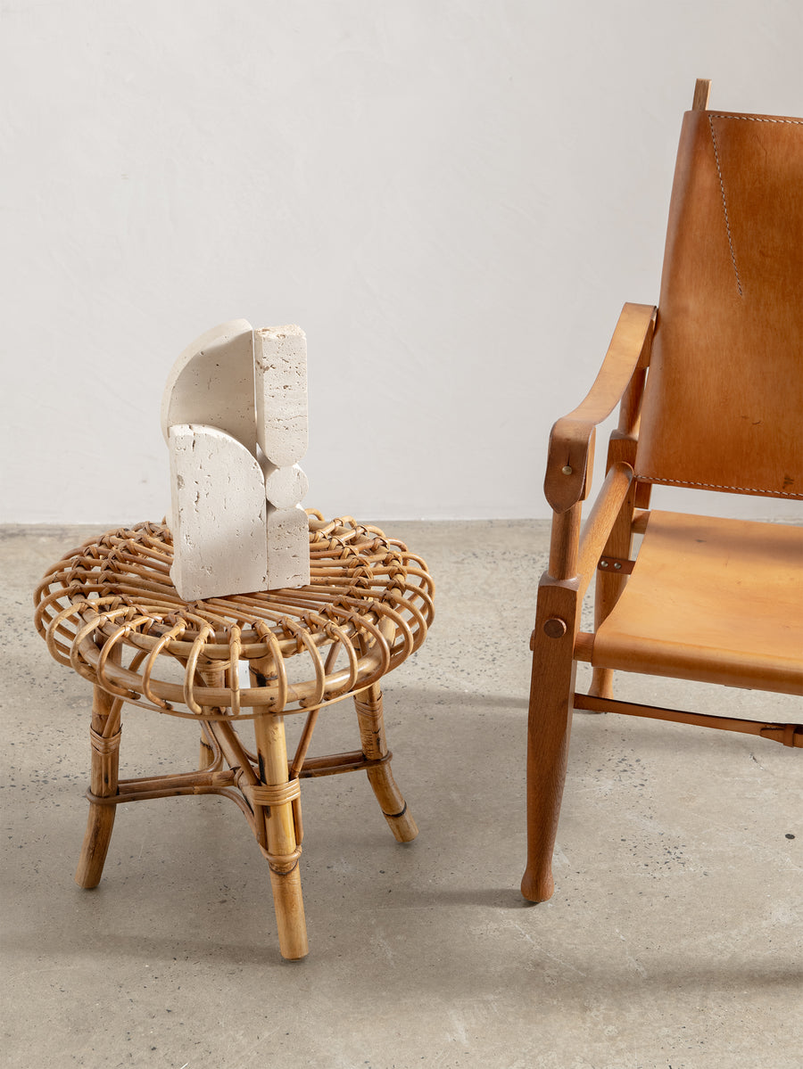Carved from solid travertine, this sculptural object explores the balance between geometric form and natural material. Layered shapes including a half disc, cylinders and architectural blocks create a composition that feels both grounded and expressive.