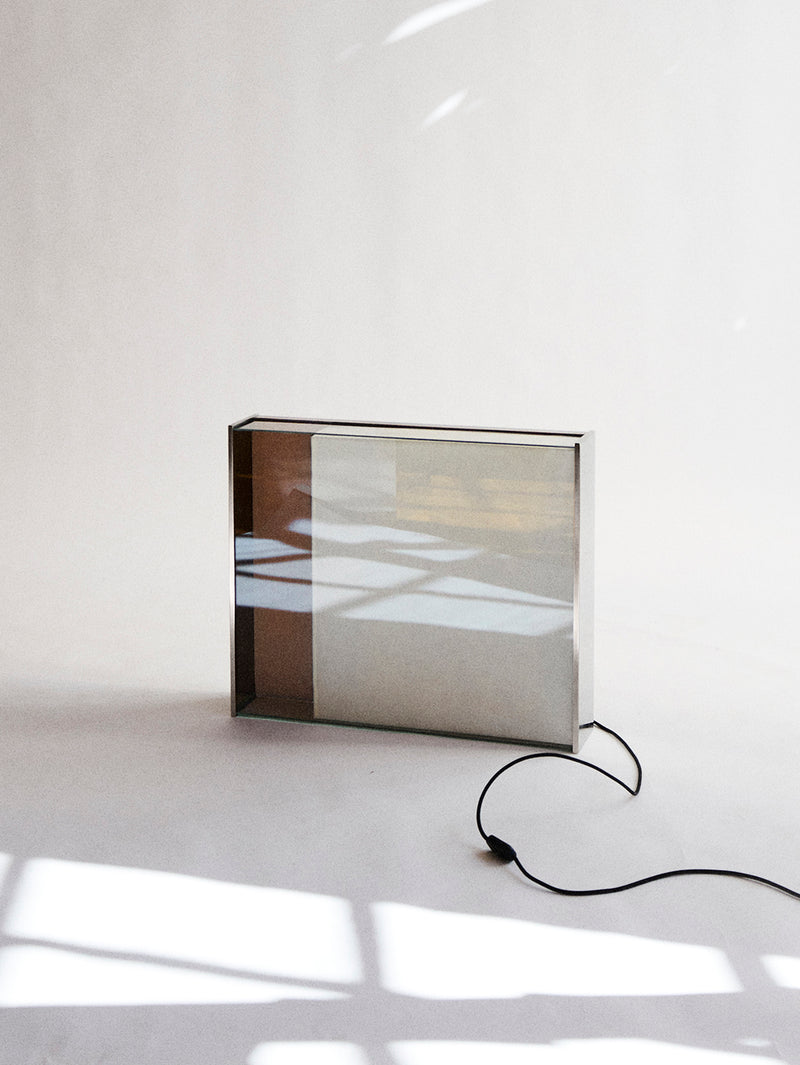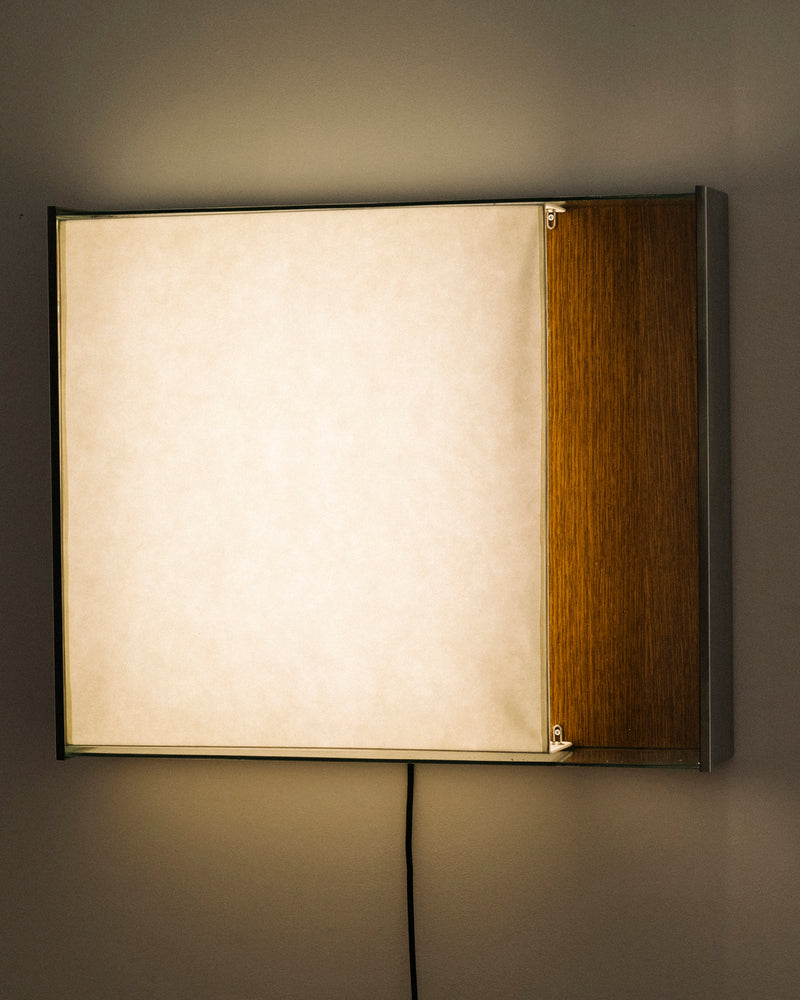Crafted from stainless steel, glass and plywood, the Wall Lamp is finished with a washi paper shade, emitting a warm, ambient glow through its striking form.