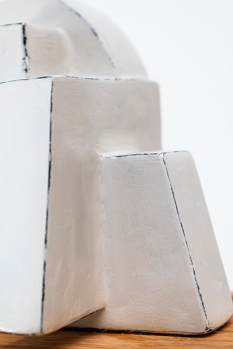 A compact miscellany of irregular 3D truncated square like prisms, with semicircular formation, constructed as one irregular shape, with unique perspective from every angle. Alabaster Hued finish.