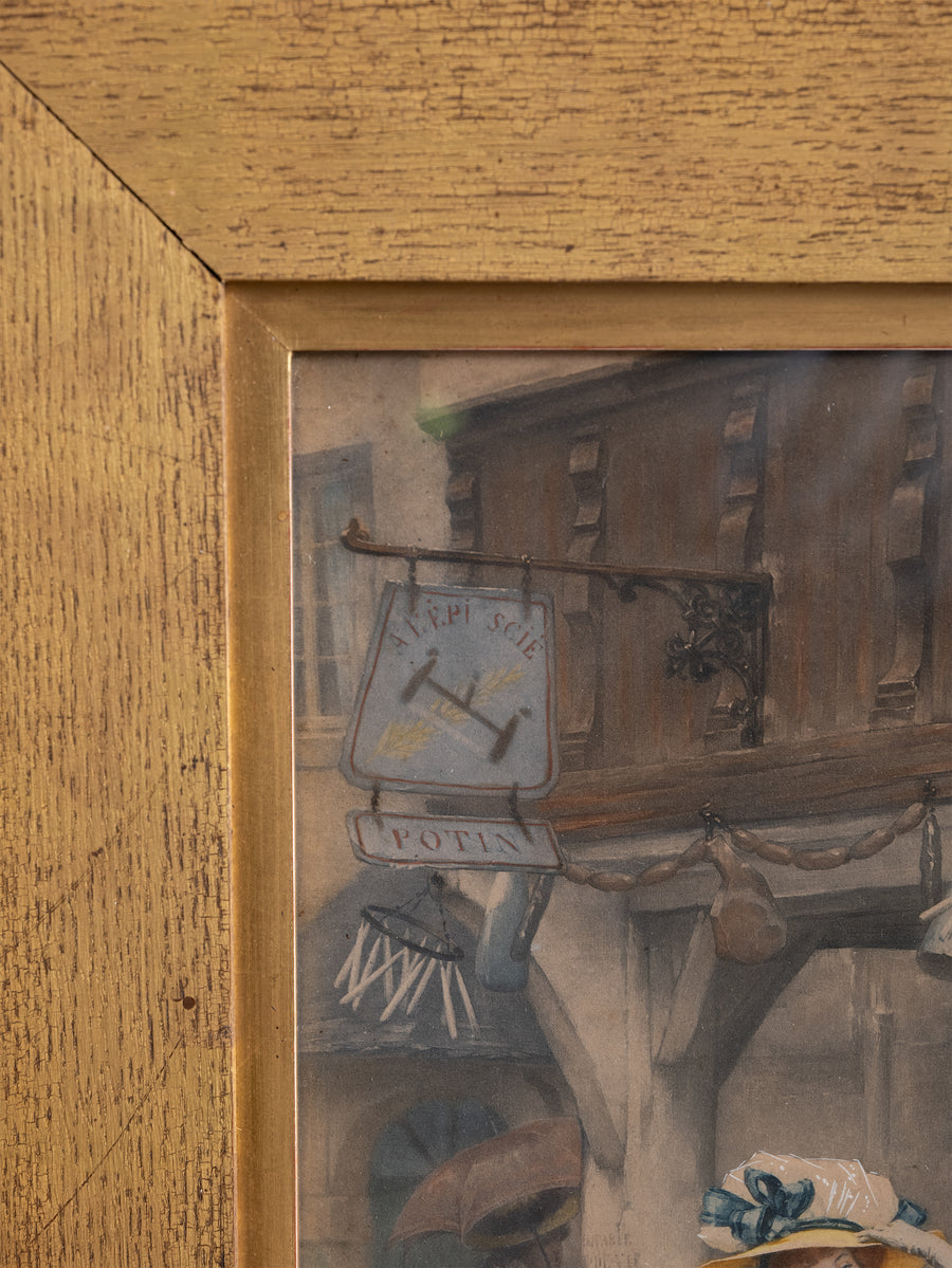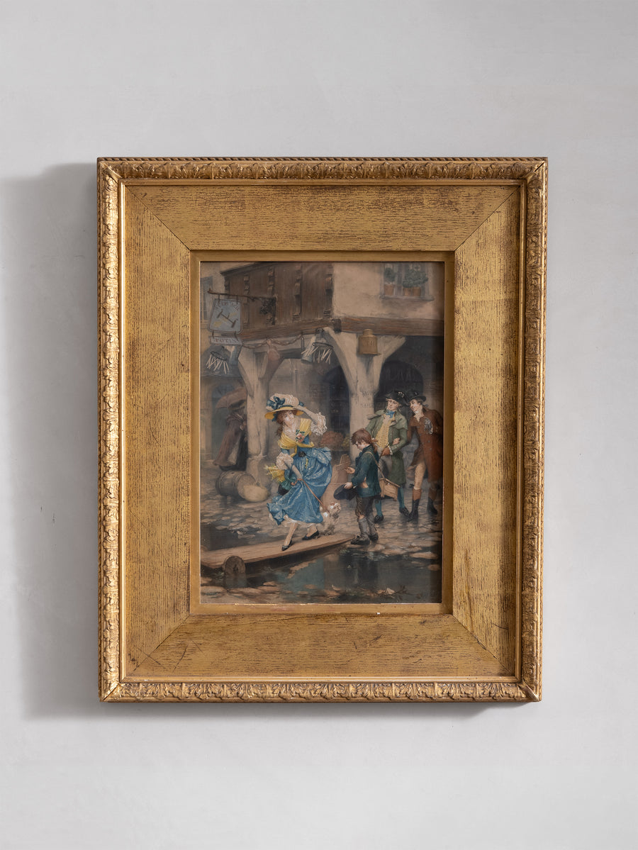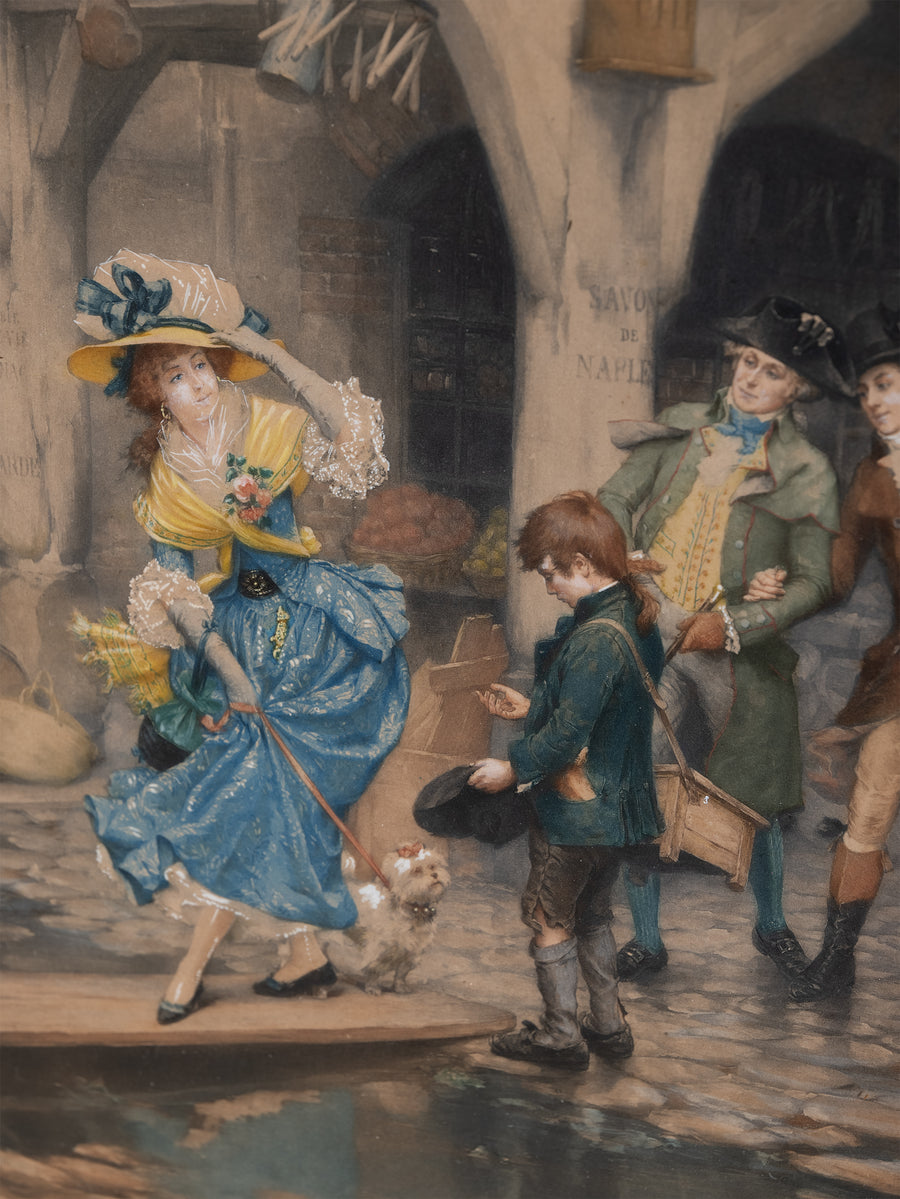 A printed reproduction of a late 19th-century figurative street scene by French painter Pierre Outin, known for his romantic narrative works and finely drawn figures in historical dress. Outin trained in Paris under Charles Joseph Lecointe and academic painter Alexandre Cabanel, debuting at the Paris Salon in 1868.