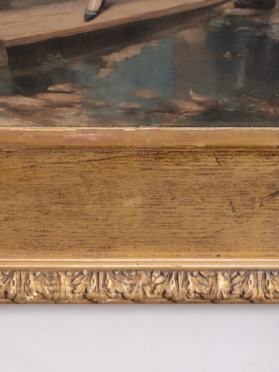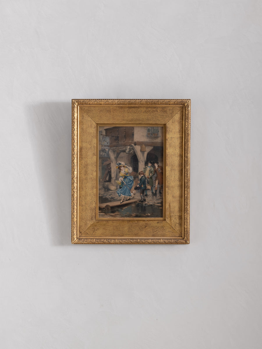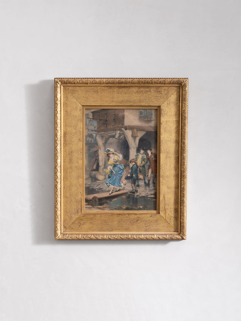 The print captures his signature storytelling style, with period costuming and a soft, illustrative quality inspired by 18th-century fêtes galantes. Presented in a wooden frame with a gold-painted finish and decorative detailing, showing gentle wear to the frame consistent with age. A timeless, character-filled artwork suited to both traditional and contemporary interiors.