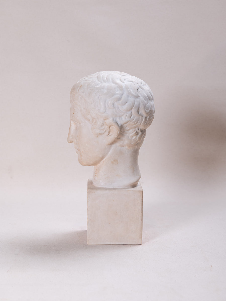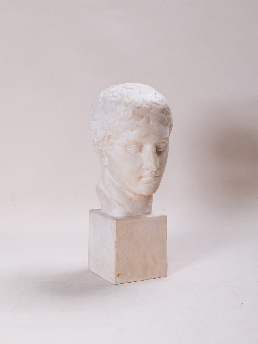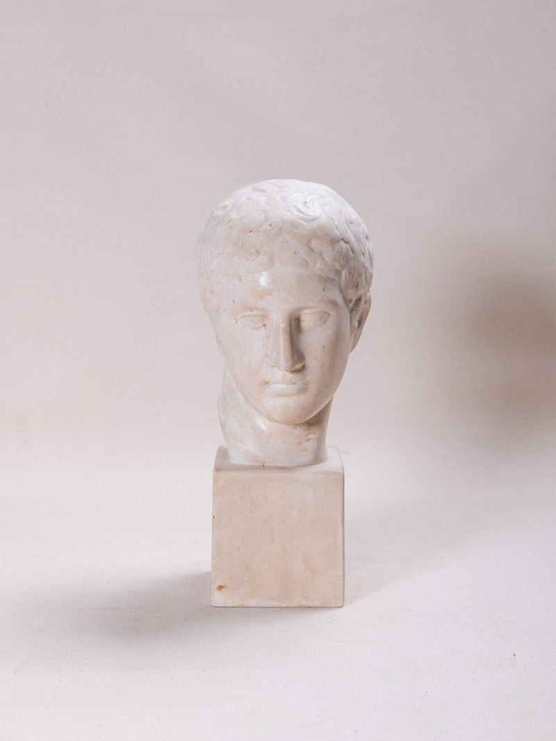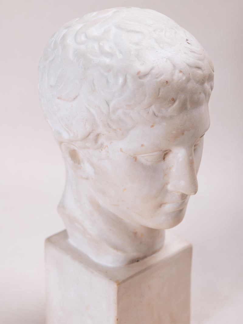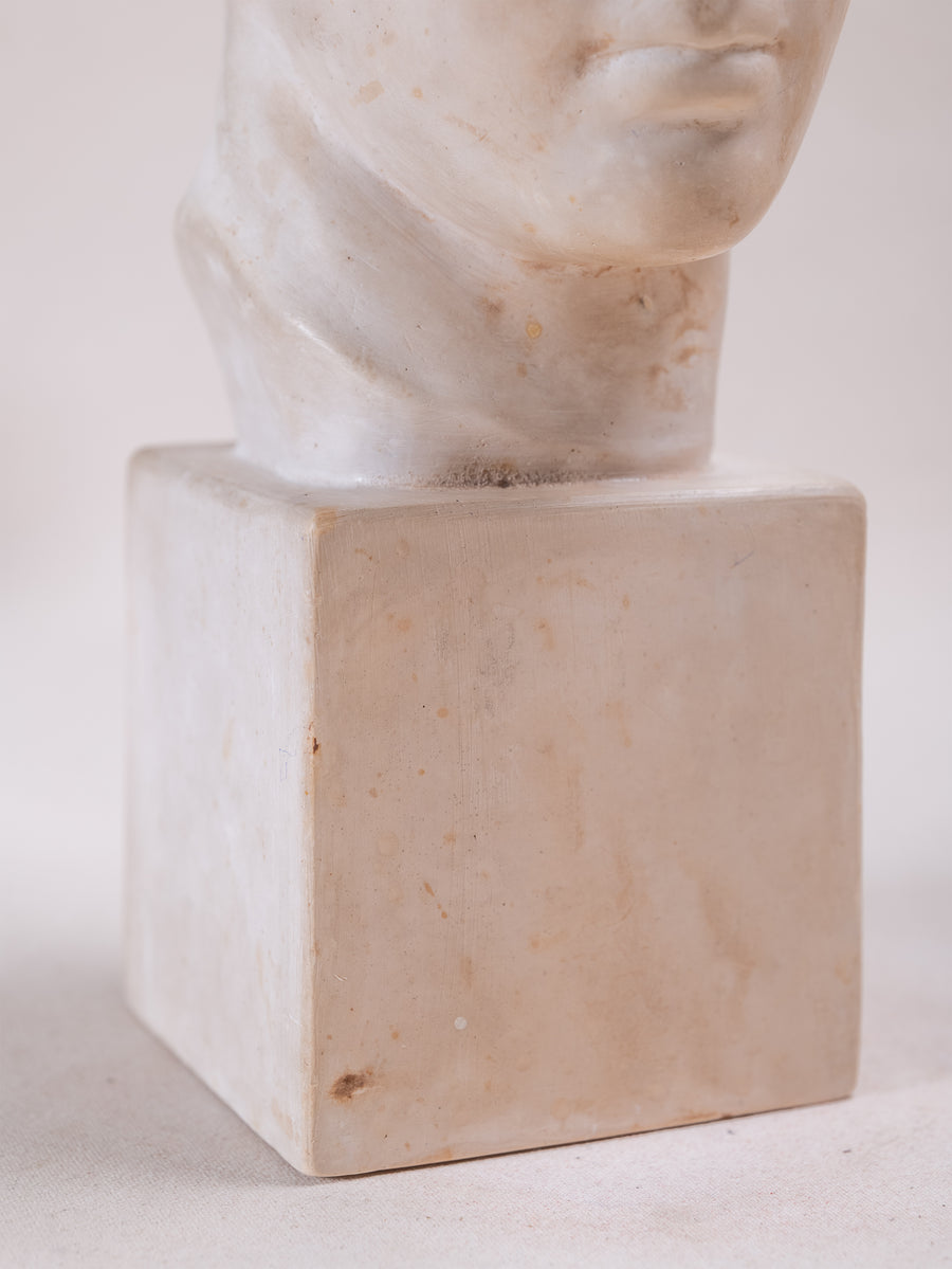 This 1950s plaster bust draws inspiration from classical sculpture, with finely modelled features and a simple block base. Its softly aged surface lends character and authenticity, making it a striking decorative accent for display on a console, pedestal, or shelf. Timeless in form and understated in presence, it brings a touch of history and refinement to any interior.