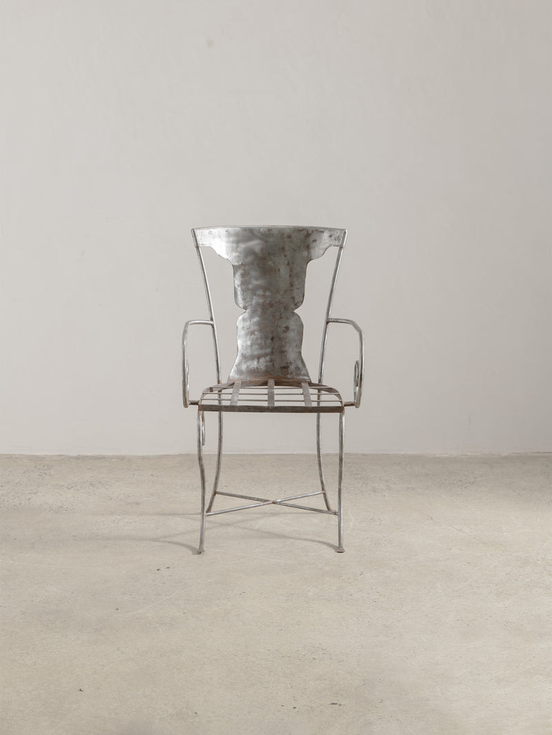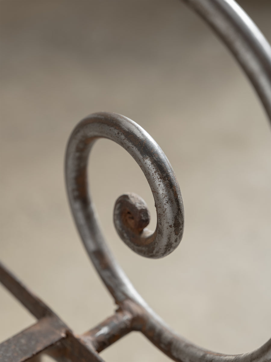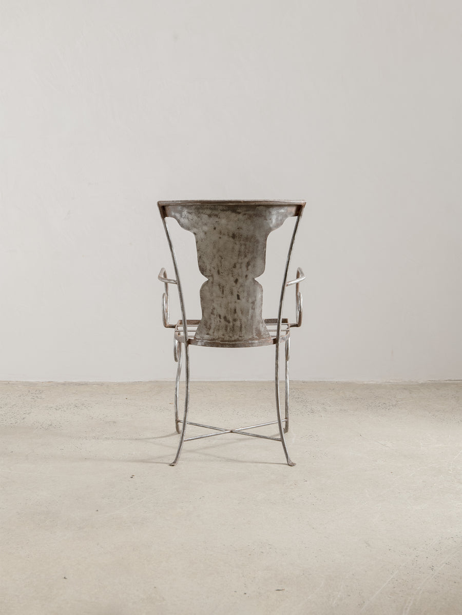 A striking example of French mid-century craftsmanship, this artisanal armchair is hand-forged from metal, dating back to the 1950s. Its sculptural form balances strength with elegance, featuring gracefully scrolled arms and a gently flared backrest. With a raw, time-worn patina that speaks to its age and history, this chair embodies both function and artistry, making it as much a statement piece as a seat. A rare find, it offers a glimpse into the refined simplicity of French design of the era.
