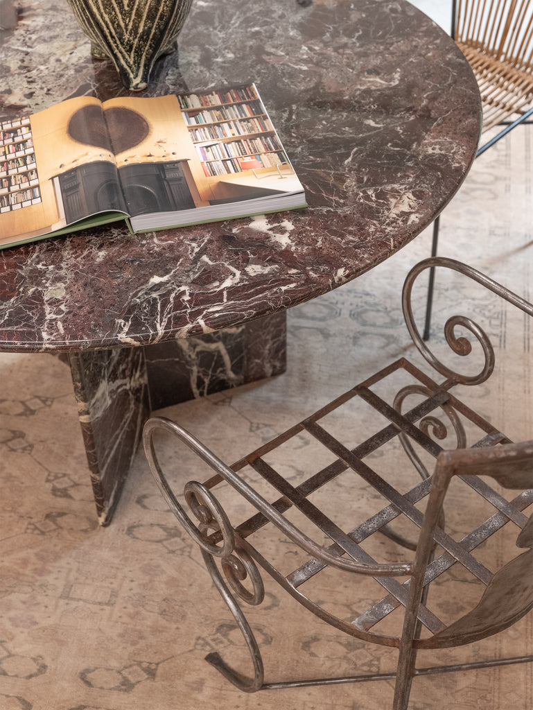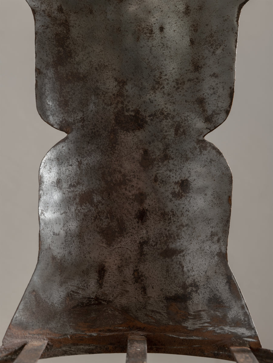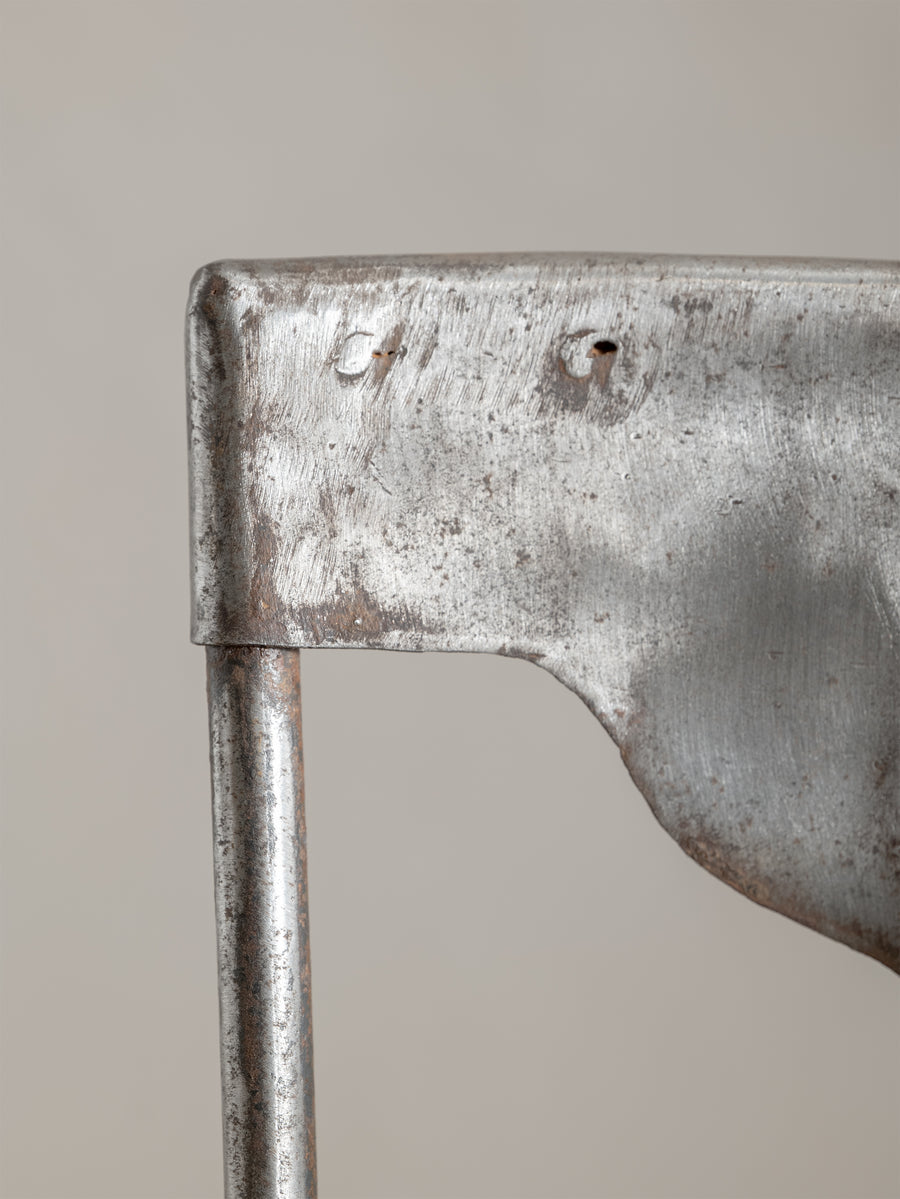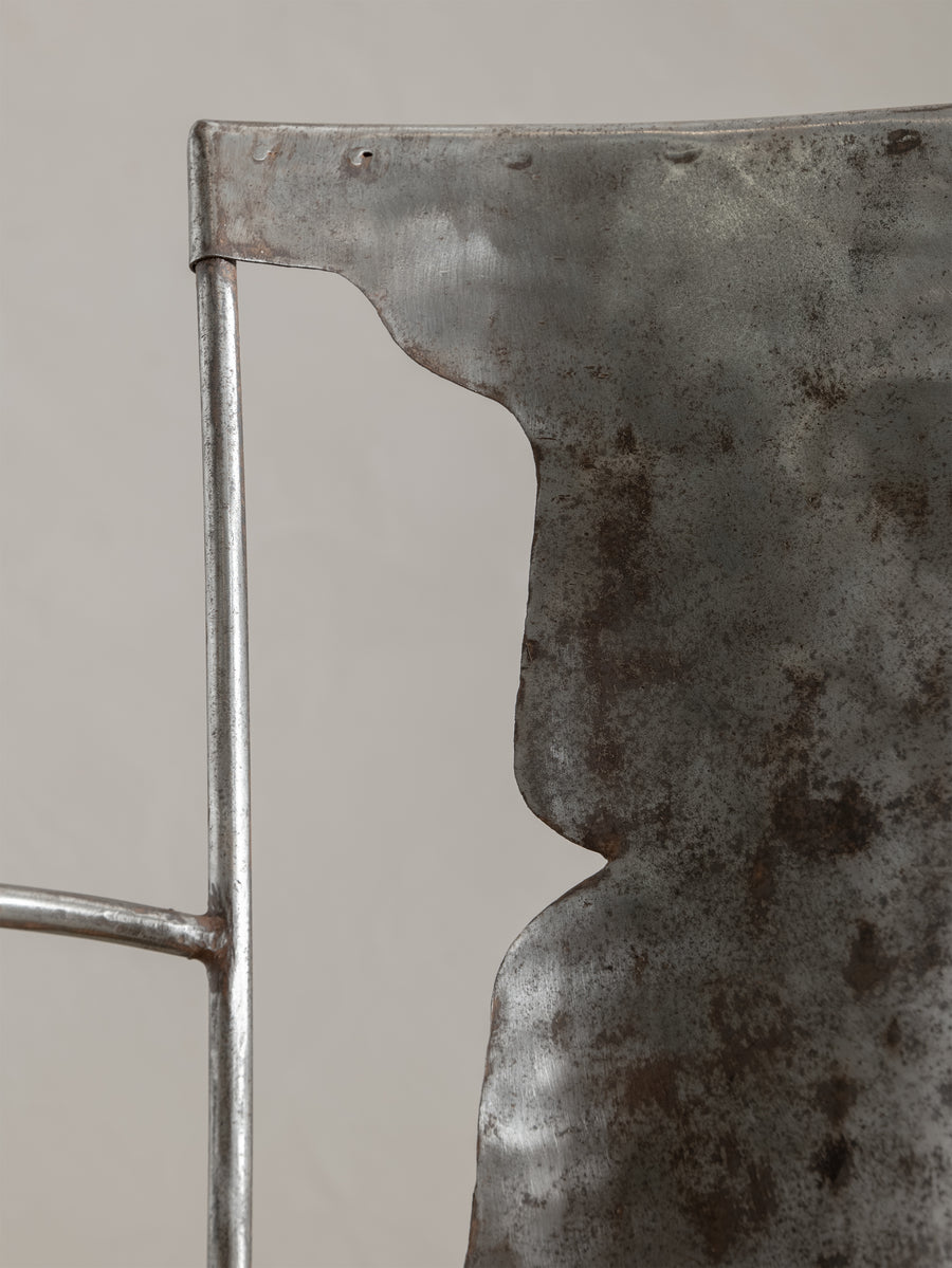 A striking example of French mid-century craftsmanship, this artisanal armchair is hand-forged from metal, dating back to the 1950s. Its sculptural form balances strength with elegance, featuring gracefully scrolled arms and a gently flared backrest. With a raw, time-worn patina that speaks to its age and history, this chair embodies both function and artistry, making it as much a statement piece as a seat. A rare find, it offers a glimpse into the refined simplicity of French design of the era.