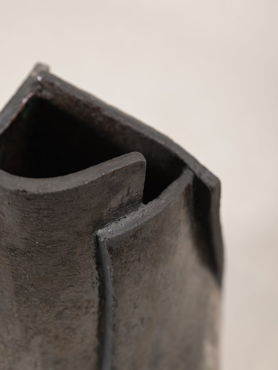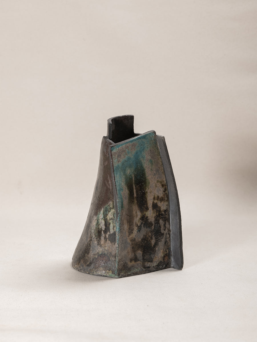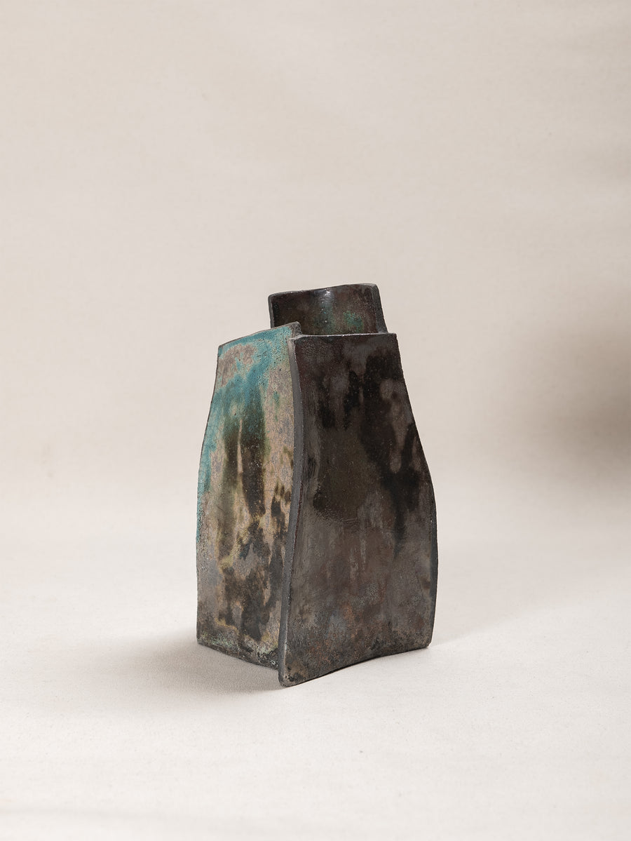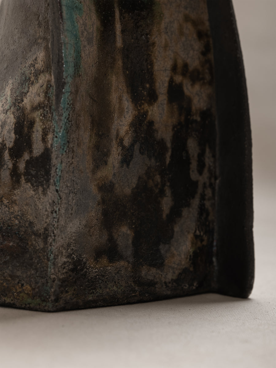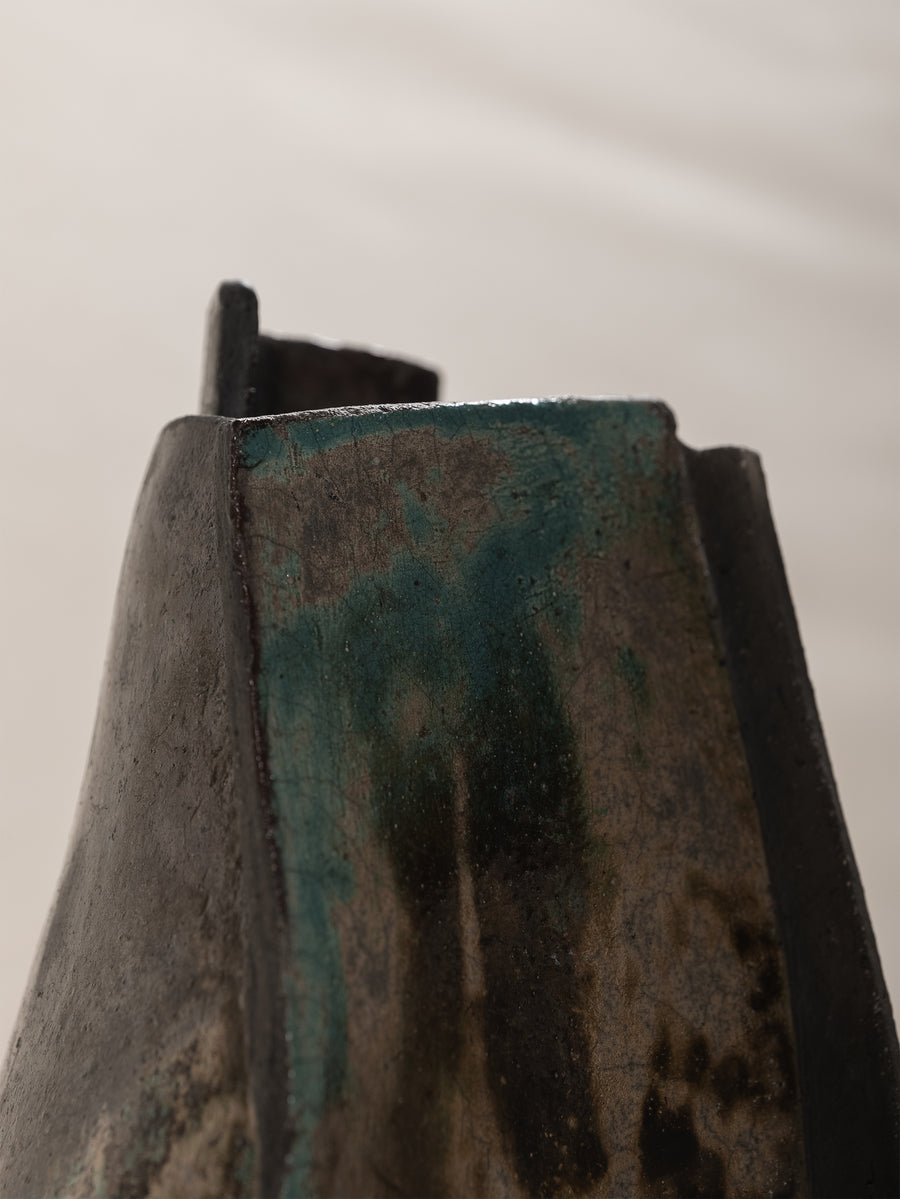 Raw, sculptural form defines this Brutalist ceramic vase, its angular silhouette softened by textured glazing in deep earth tones with flashes of green and blue. The irregular surface carries the hand of its maker, evoking both architectural strength and organic imperfection. More than a vessel, it stands as a piece of mid-century ceramic art.
