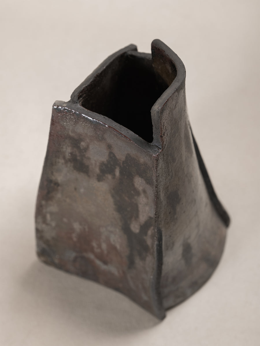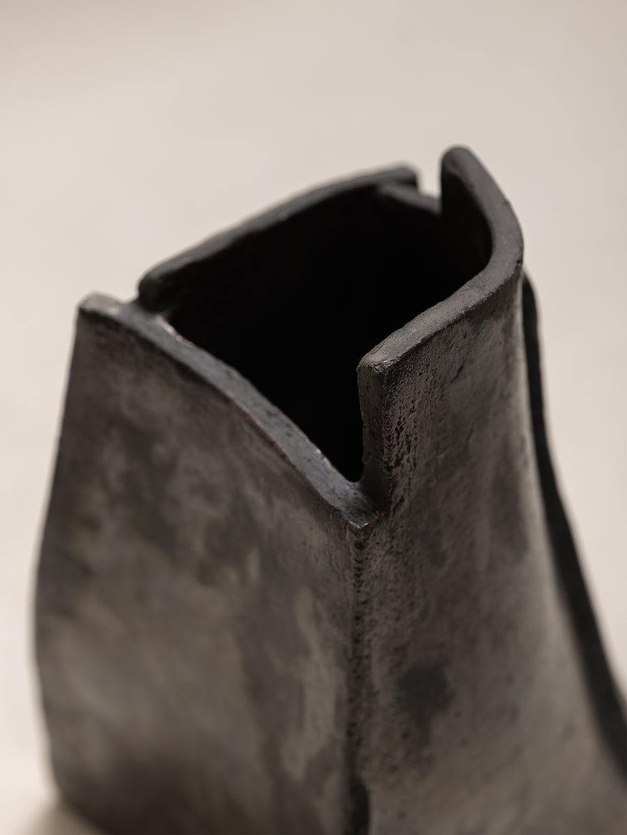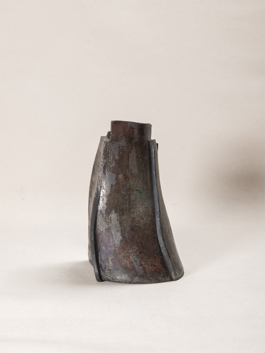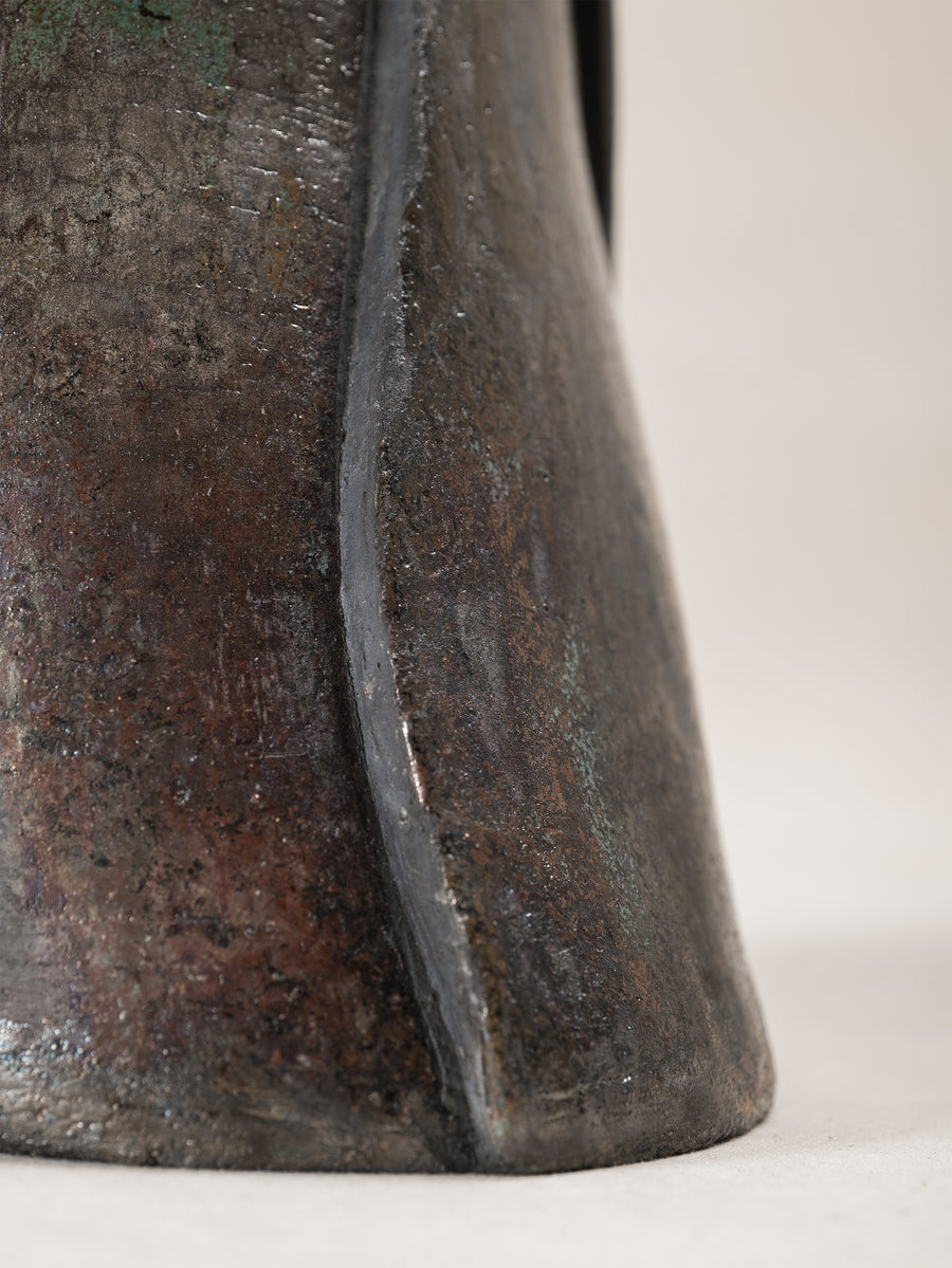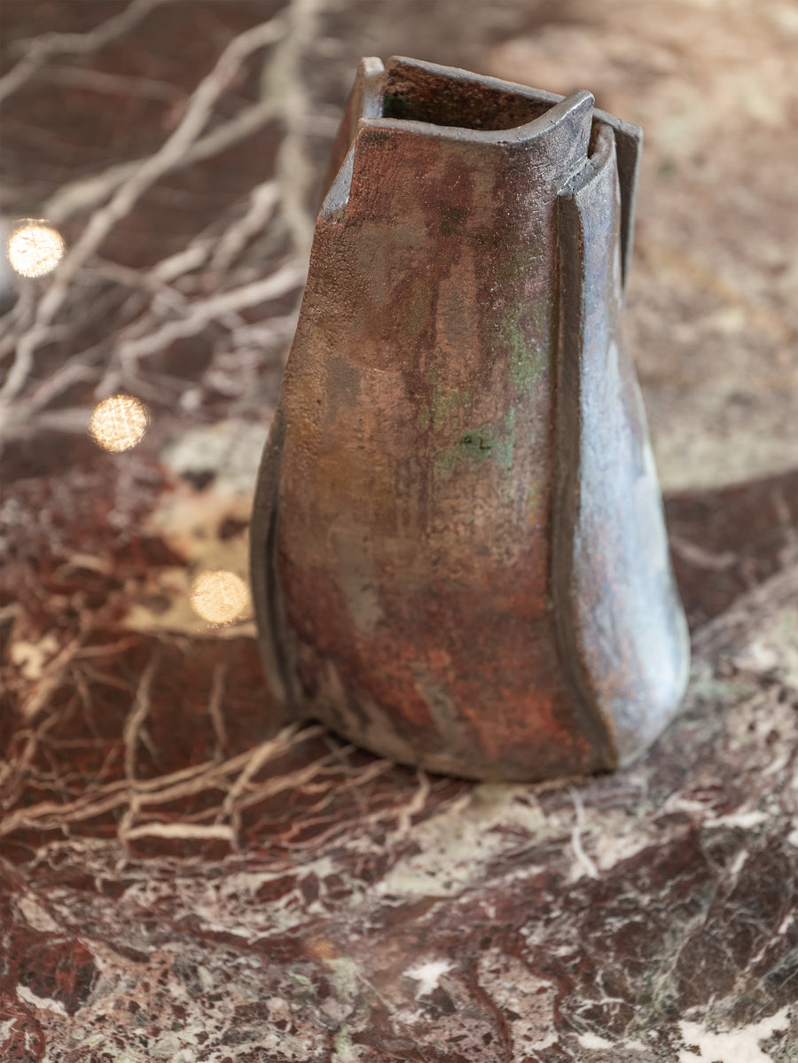 Raw, sculptural form defines this Brutalist ceramic vase, its angular silhouette softened by textured glazing in deep earth tones with flashes of green and blue. The irregular surface carries the hand of its maker, evoking both architectural strength and organic imperfection. More than a vessel, it stands as a piece of mid-century ceramic art.