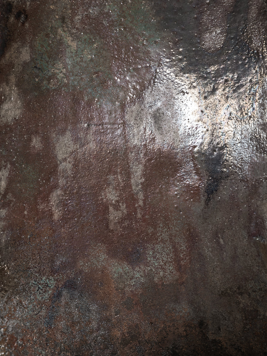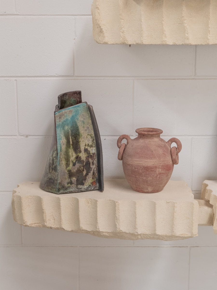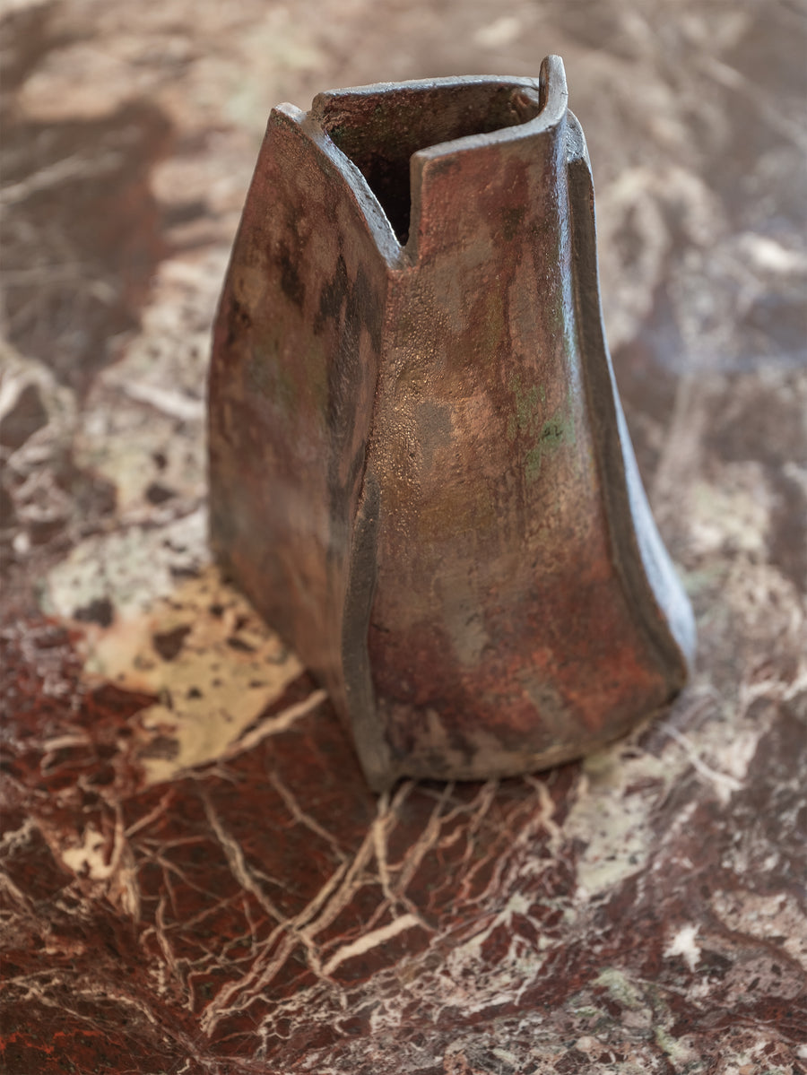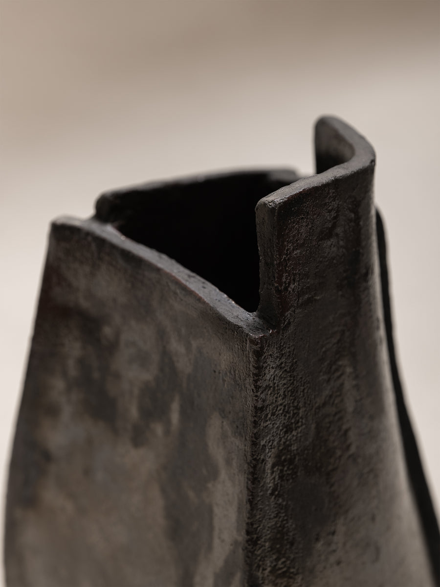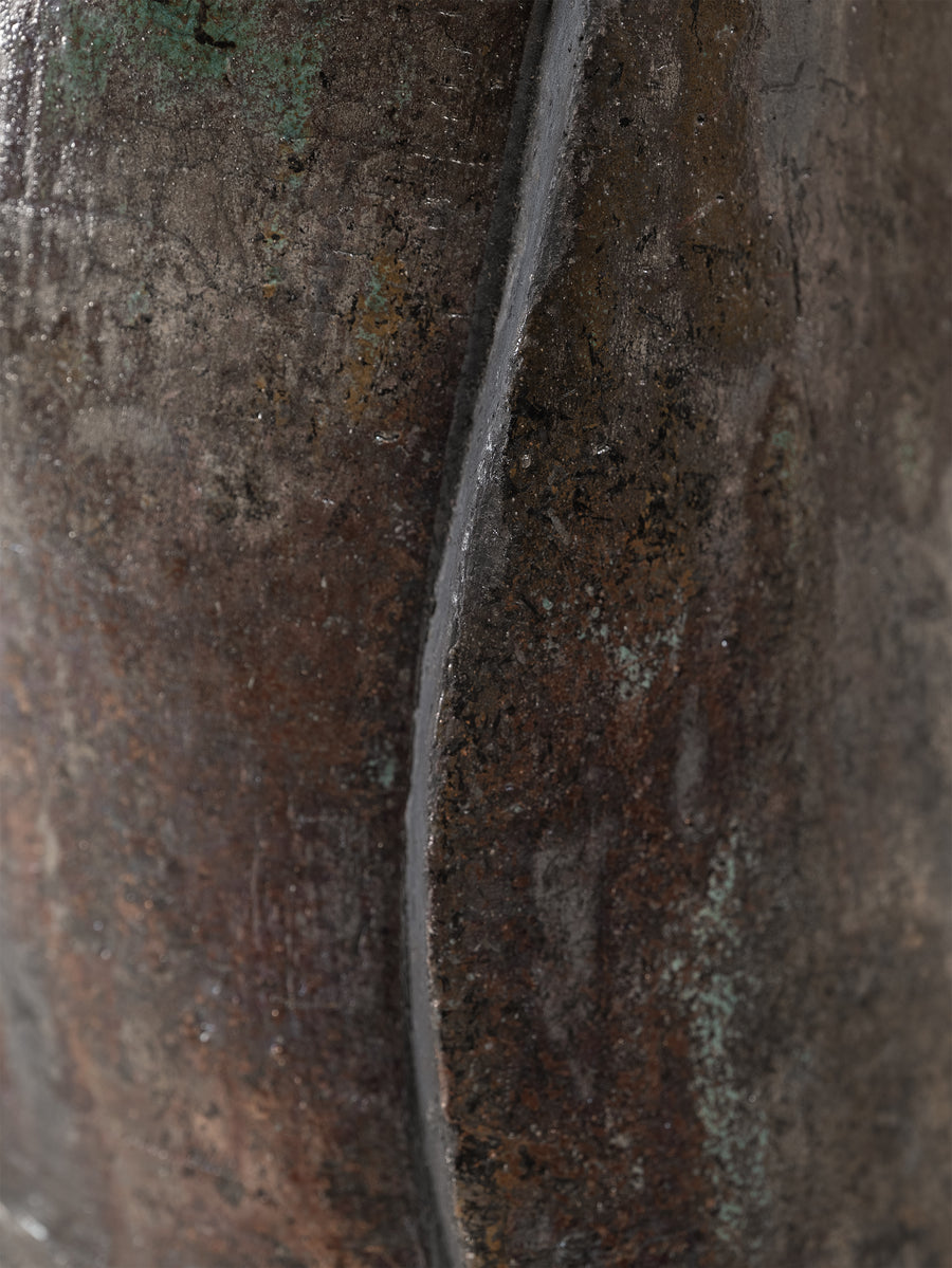 Raw, sculptural form defines this Brutalist ceramic vase, its angular silhouette softened by textured glazing in deep earth tones with flashes of green and blue. The irregular surface carries the hand of its maker, evoking both architectural strength and organic imperfection. More than a vessel, it stands as a piece of mid-century ceramic art.