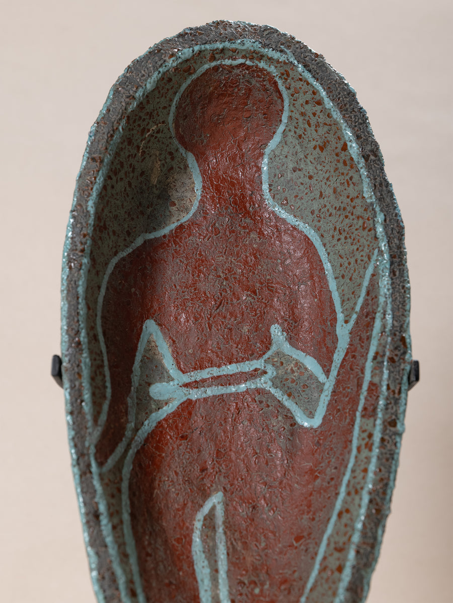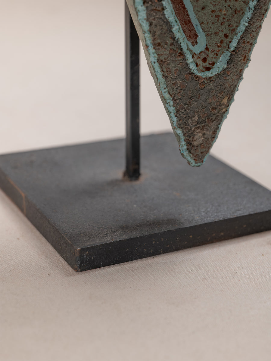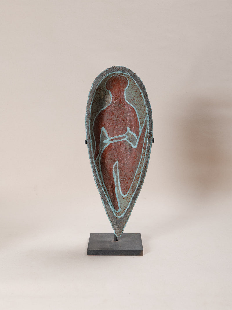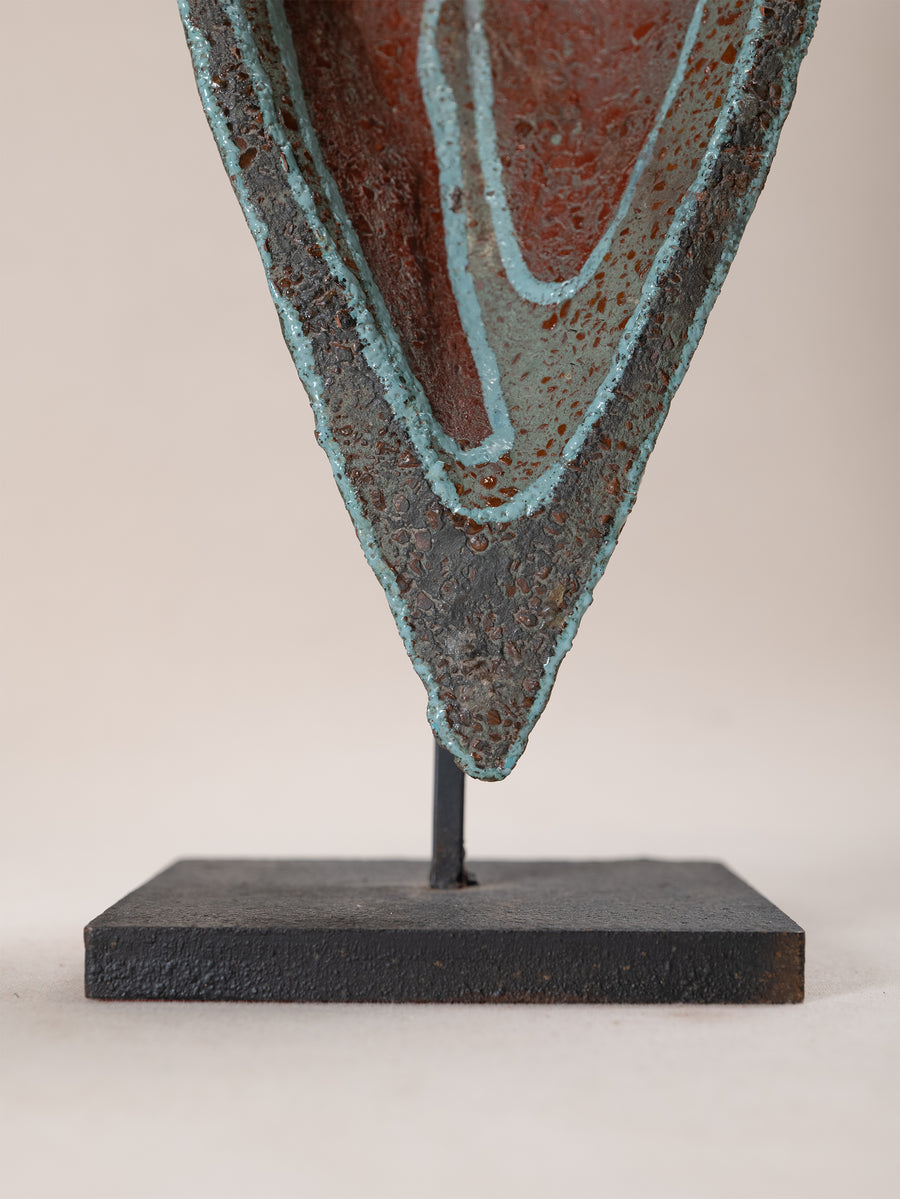Evoking the spirit of primitive art and mid-century abstraction, this ceramic sculpture captures a powerful sense of presence. Handcrafted in textured clay and finished in earthy red and turquoise tones, its stylised figure is both ancient and modern - bridging artefact and artwork. The elongated teardrop form, mounted on a black base, reveals a tactile surface that celebrates imperfection and material honesty. A striking piece that reflects the organic minimalism of 1960s studio ceramics.