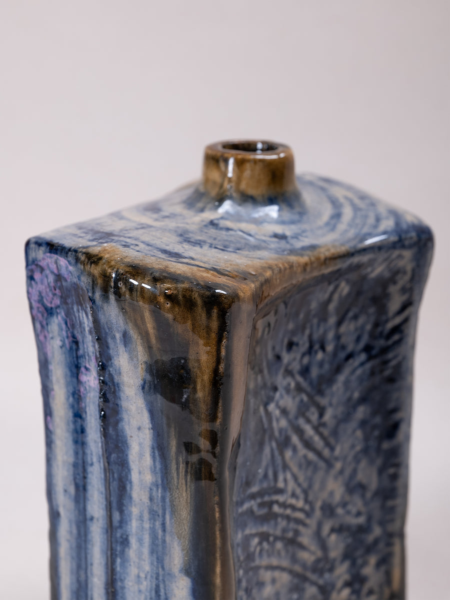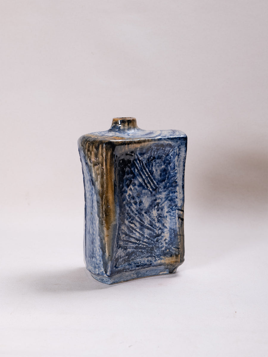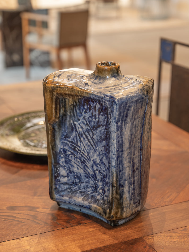 Defined by bold angular forms and richly textured surfaces, these glazed ceramic vessels reveal a dynamic interplay of earthy tones, deep blues, and expressive carved motifs. Their sculptural presence balances function with artistry, embodying the modernist spirit of mid-century ceramic design.