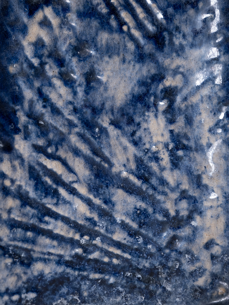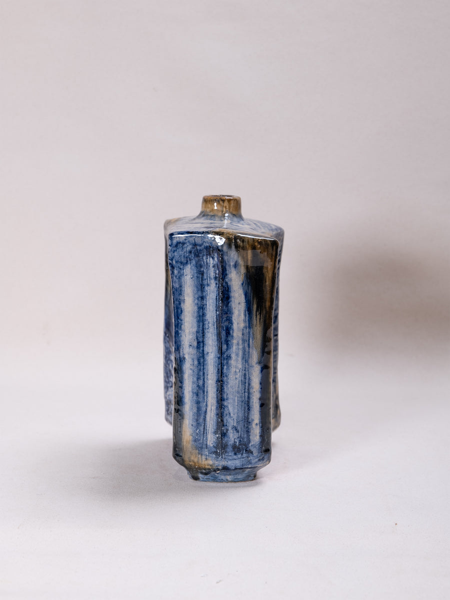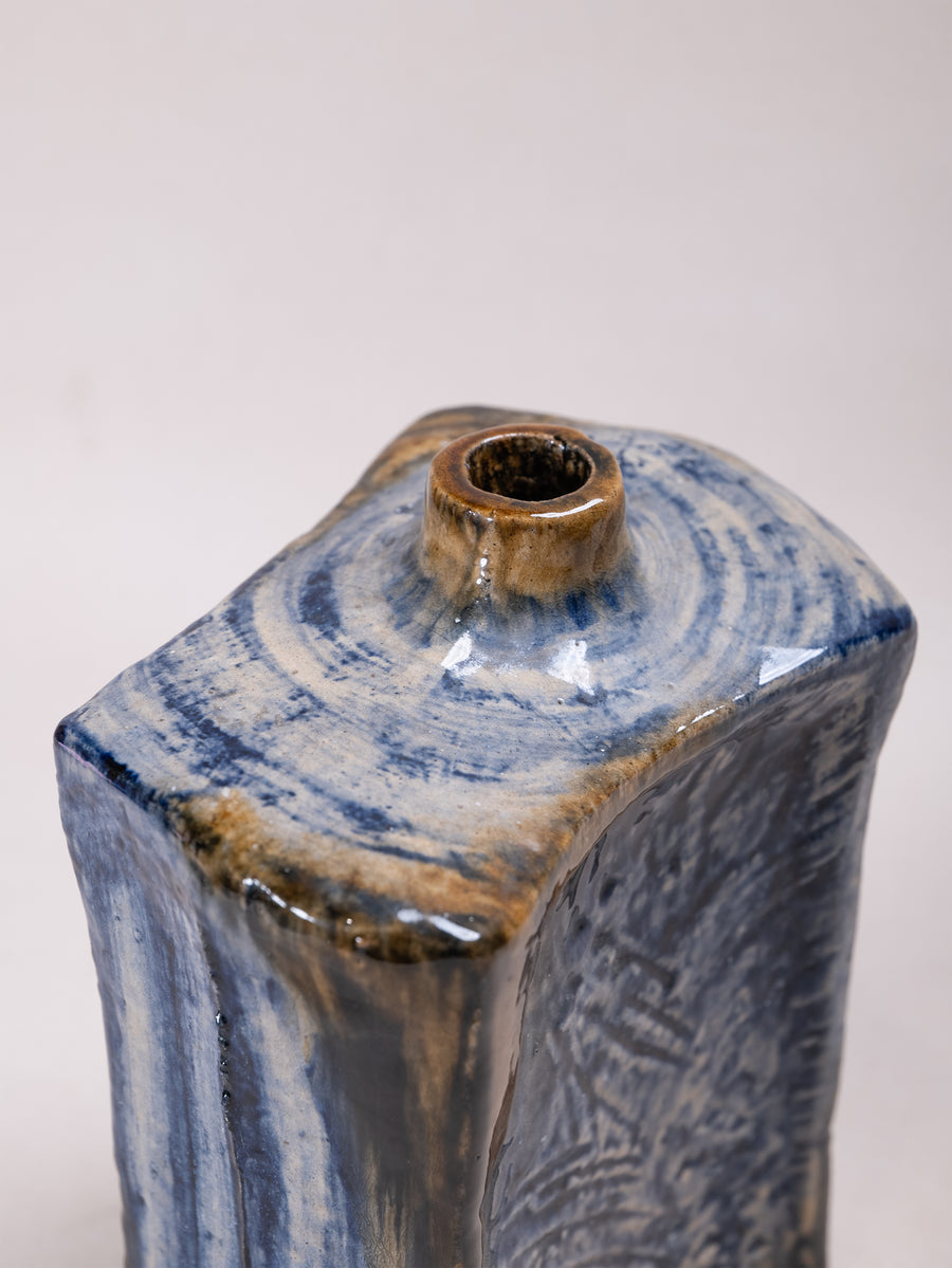 Defined by bold angular forms and richly textured surfaces, these glazed ceramic vessels reveal a dynamic interplay of earthy tones, deep blues, and expressive carved motifs. Their sculptural presence balances function with artistry, embodying the modernist spirit of mid-century ceramic design.