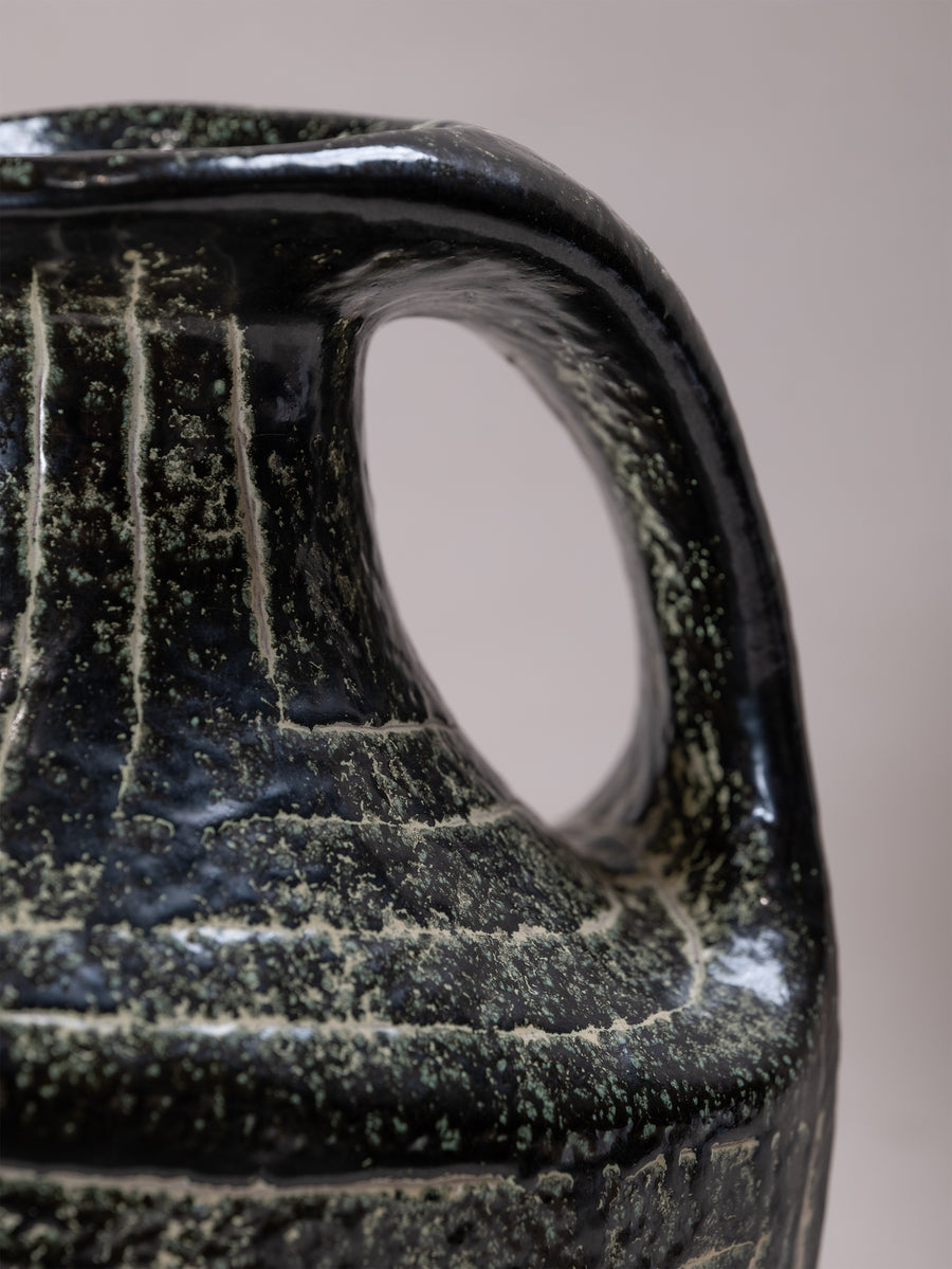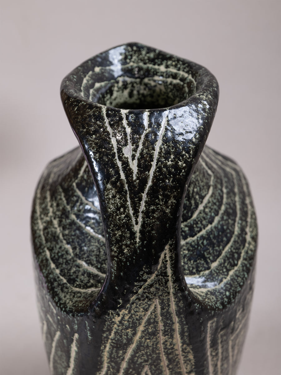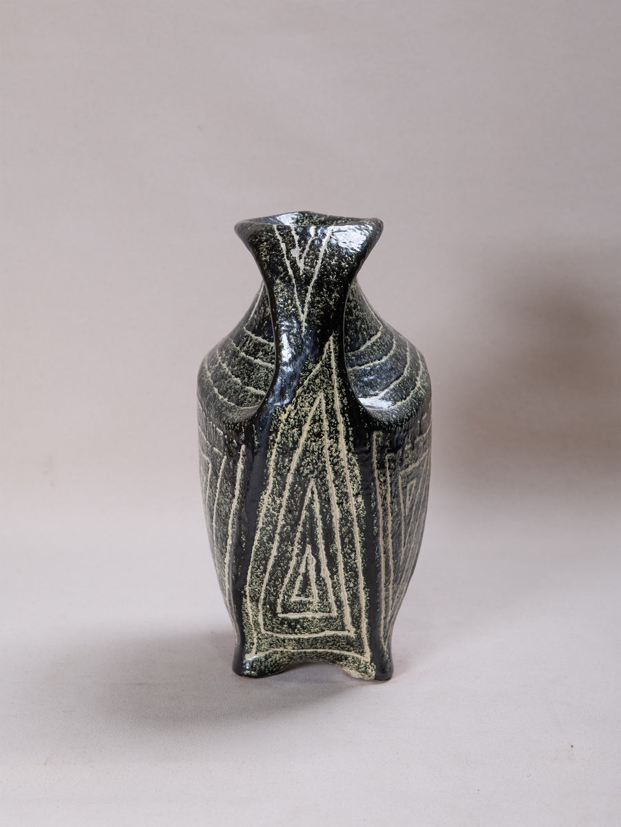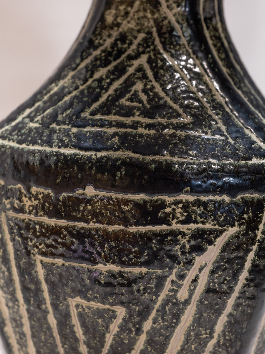 Striking geometric carvings define this large Hungarian ceramic vessel from the 1960s. Its bold triangular motifs and deep green-black glaze create a powerful graphic presence, while the organic curves of the form soften its Brutalist edge. Both utilitarian and sculptural, the vessel speaks to the era’s modernist experimentation with shape and surface.