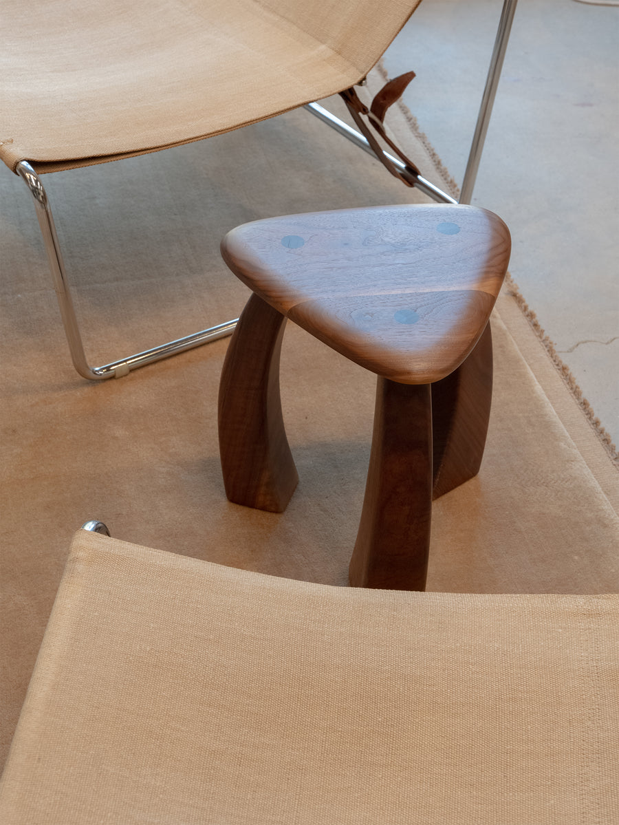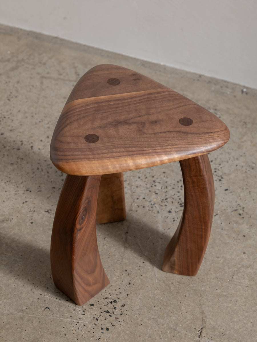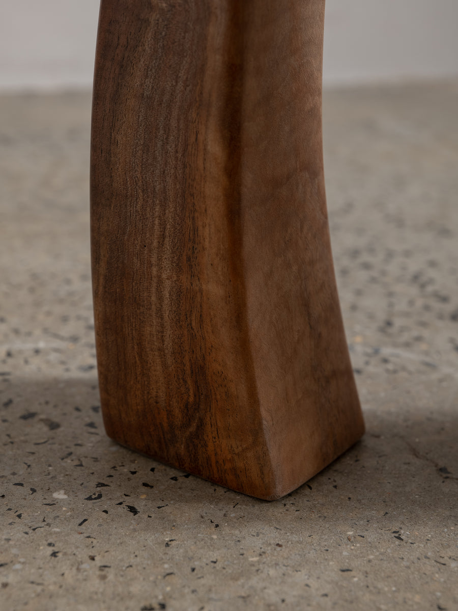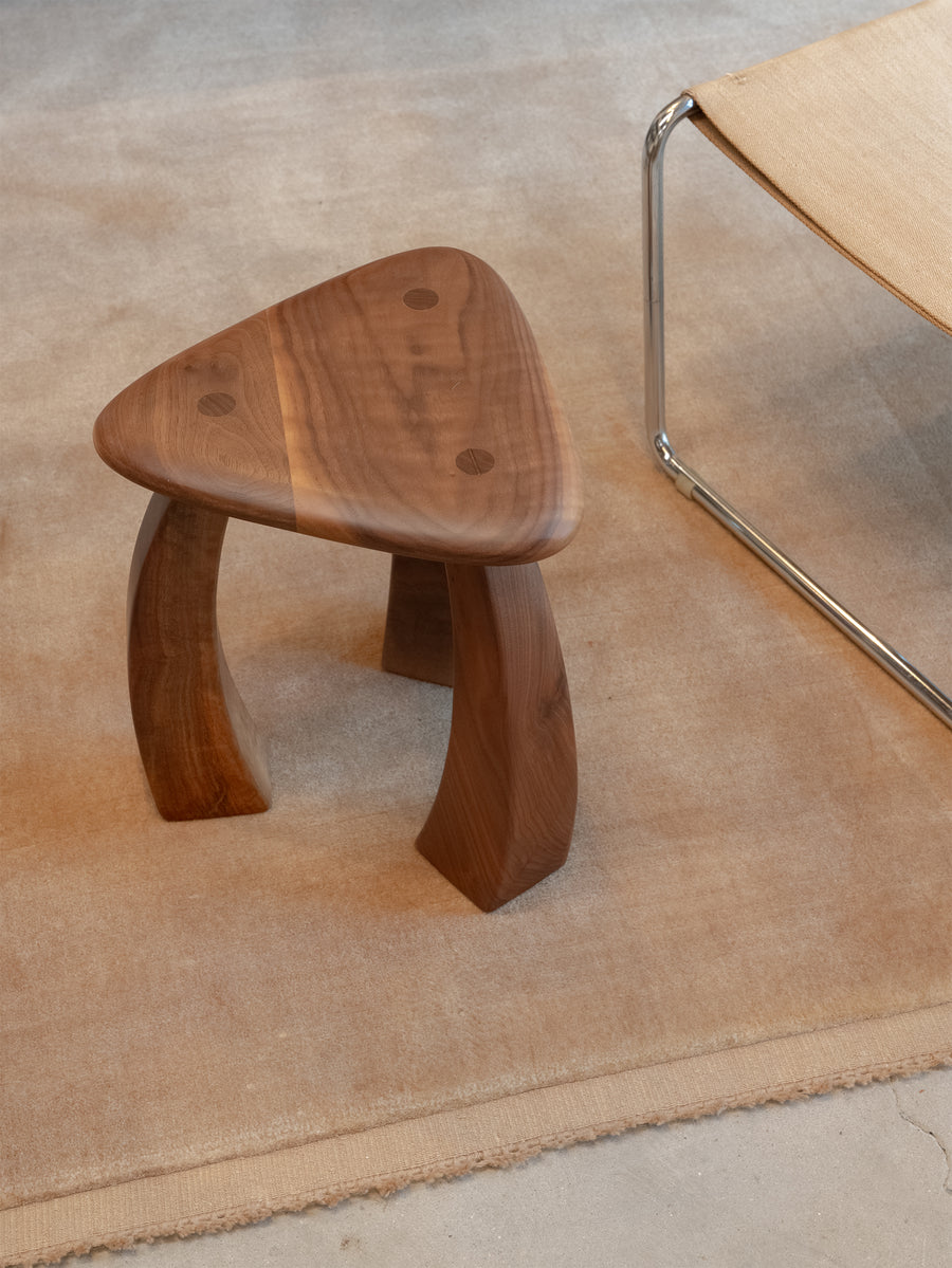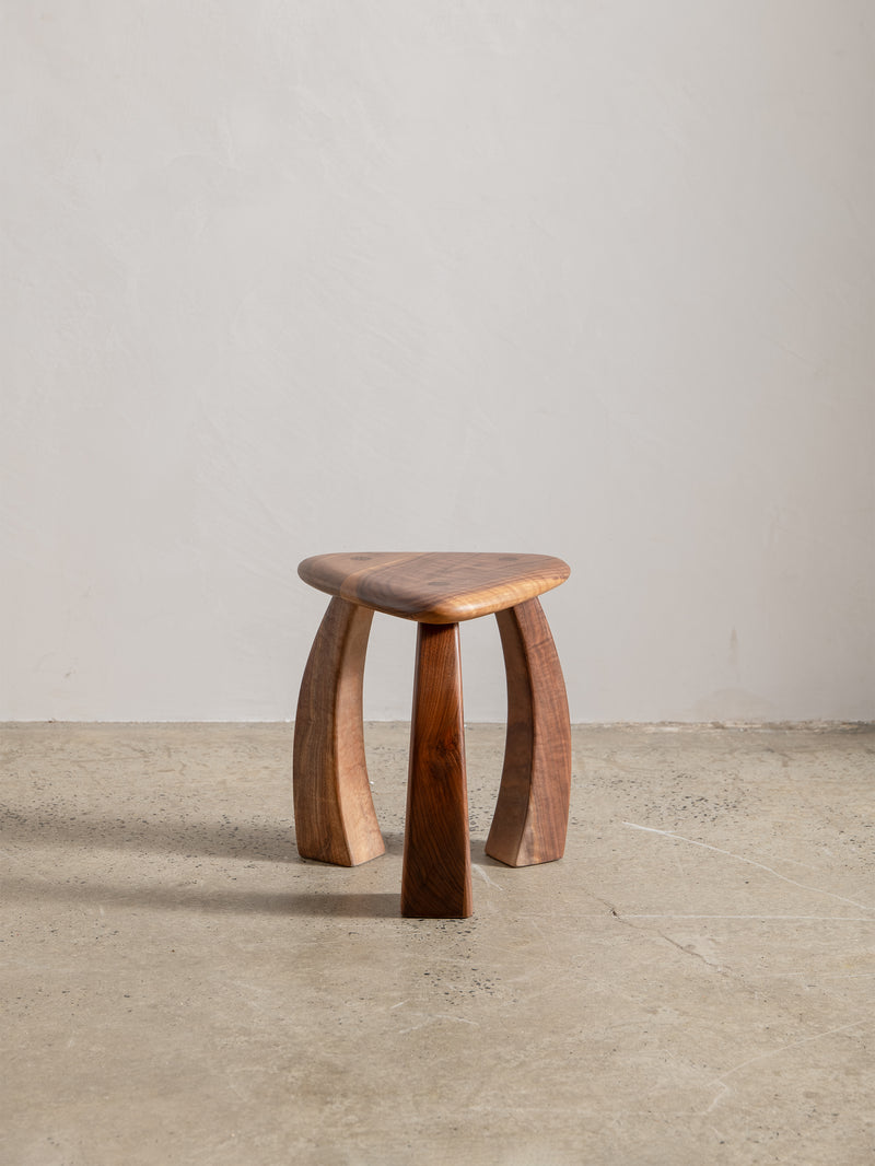 A quiet expression of craftsmanship, this sculptural walnut stool is shaped by skilled artisans in Northern Portugal. Its solid form is softened by inward-arching legs, meeting at a triangular top that highlights the natural beauty of the wood. The deep grain and hand-carved details lend warmth and depth, making each piece truly unique.