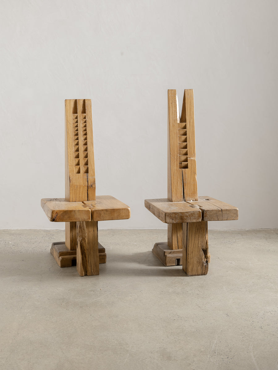 An artisan-made French timber chair, sculpted with a bold, architectural presence. Crafted from solid timber, its geometric form is balanced by the hand-carved detailing to the backrest, giving it both sculptural depth and textural character. Bearing the marks of the maker’s hand, the chair reflects a raw, elemental beauty. A statement piece that embodies the enduring traditions of French craftsmanship.