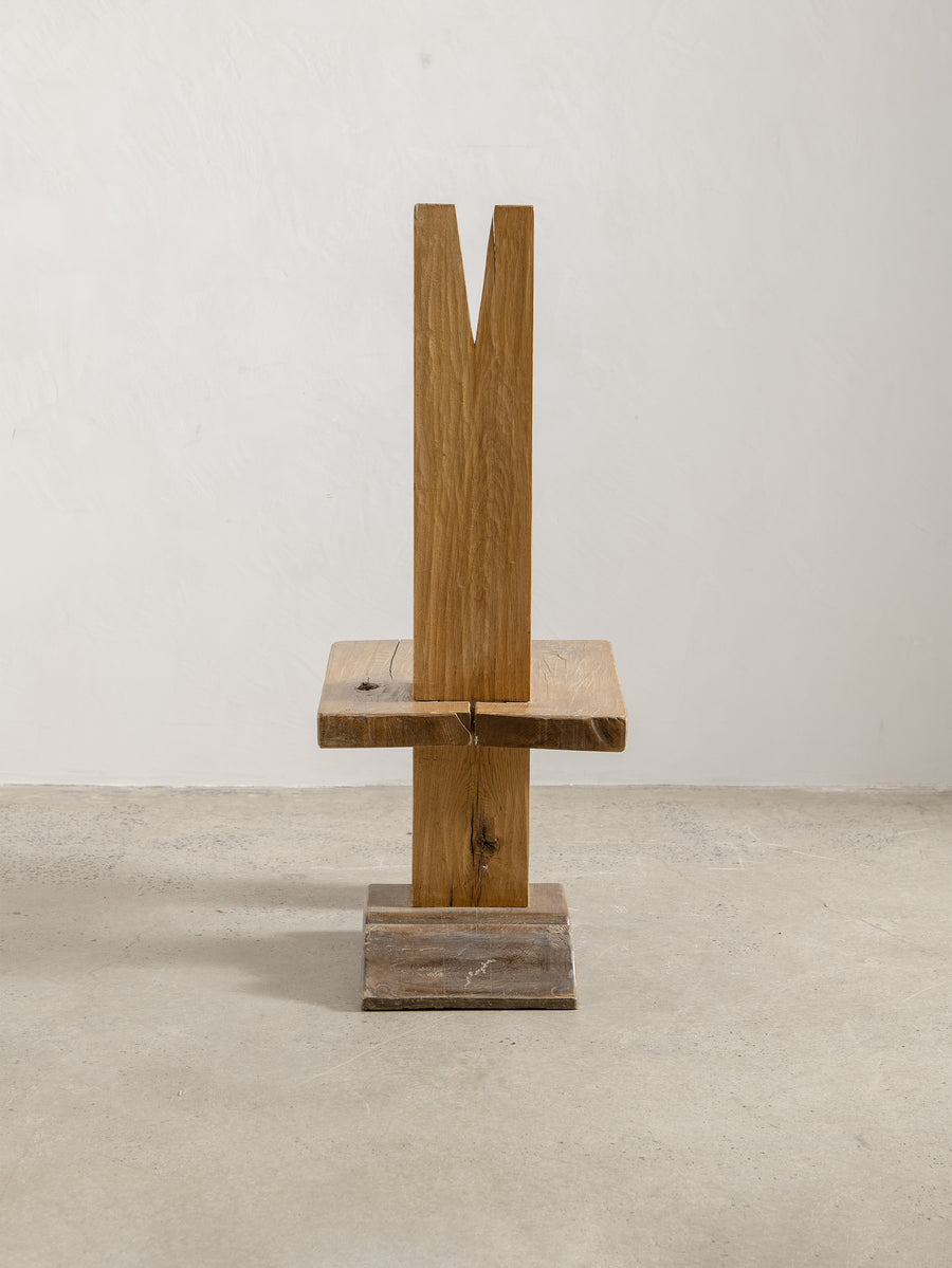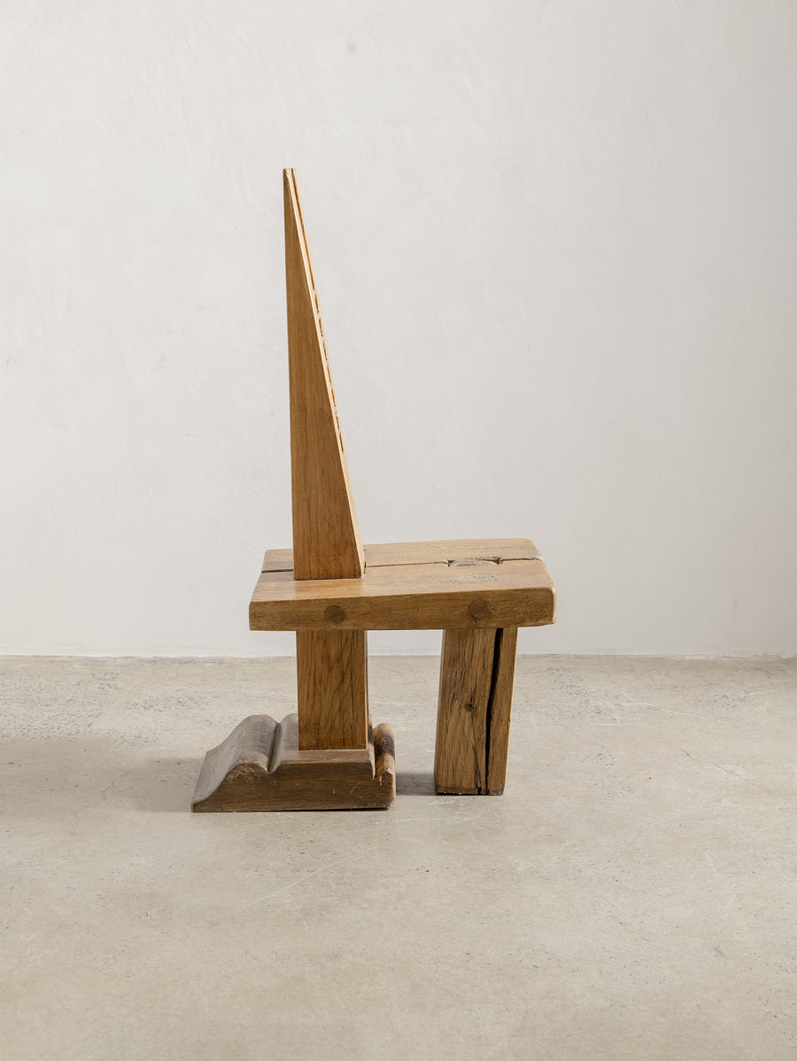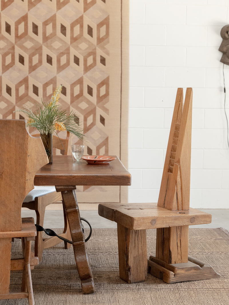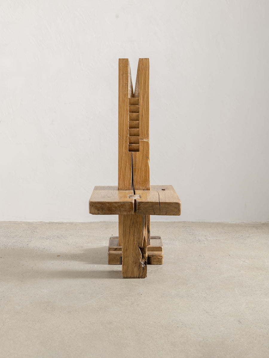 An artisan-made French timber chair, sculpted with a bold, architectural presence. Crafted from solid timber, its geometric form is balanced by the hand-carved detailing to the backrest, giving it both sculptural depth and textural character. Bearing the marks of the maker’s hand, the chair reflects a raw, elemental beauty. A statement piece that embodies the enduring traditions of French craftsmanship.