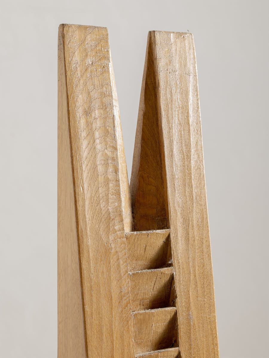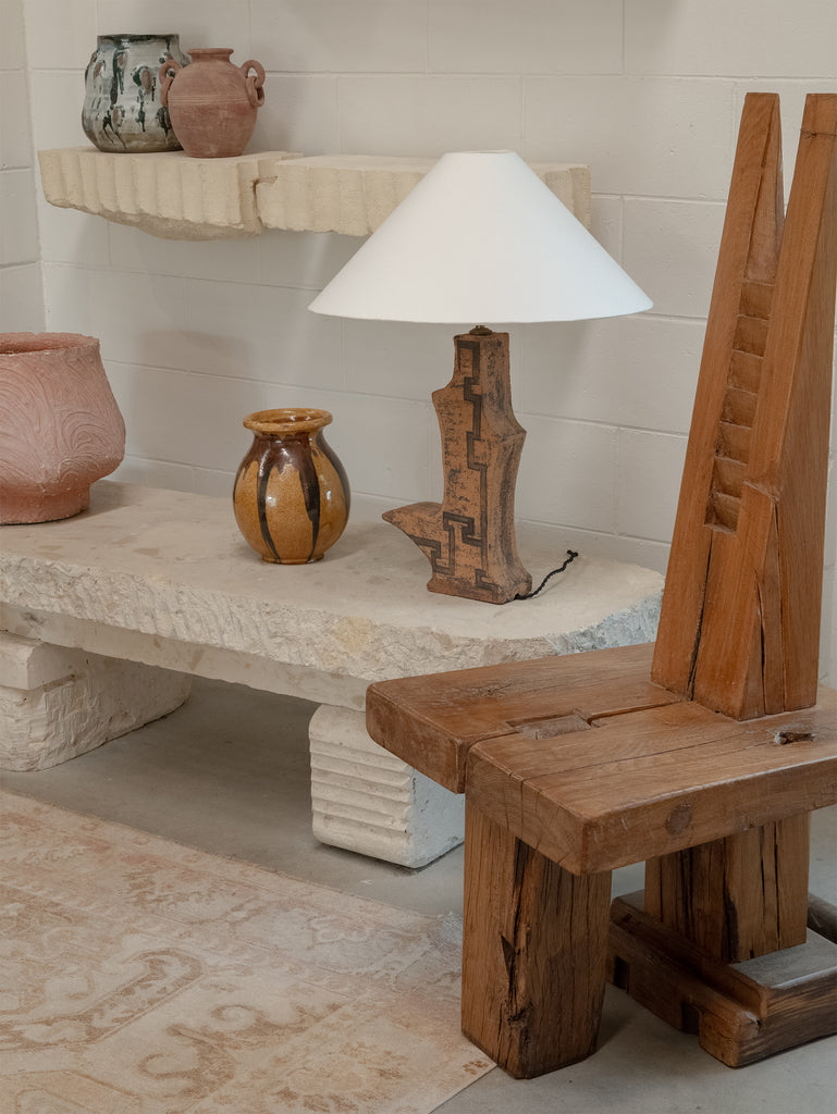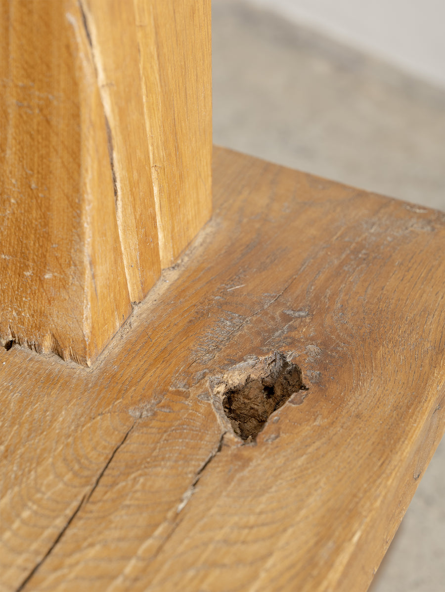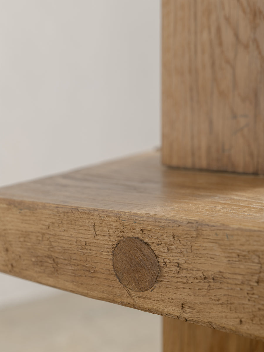 An artisan-made French timber chair, sculpted with a bold, architectural presence. Crafted from solid timber, its geometric form is balanced by the hand-carved detailing to the backrest, giving it both sculptural depth and textural character. Bearing the marks of the maker’s hand, the chair reflects a raw, elemental beauty. A statement piece that embodies the enduring traditions of French craftsmanship.