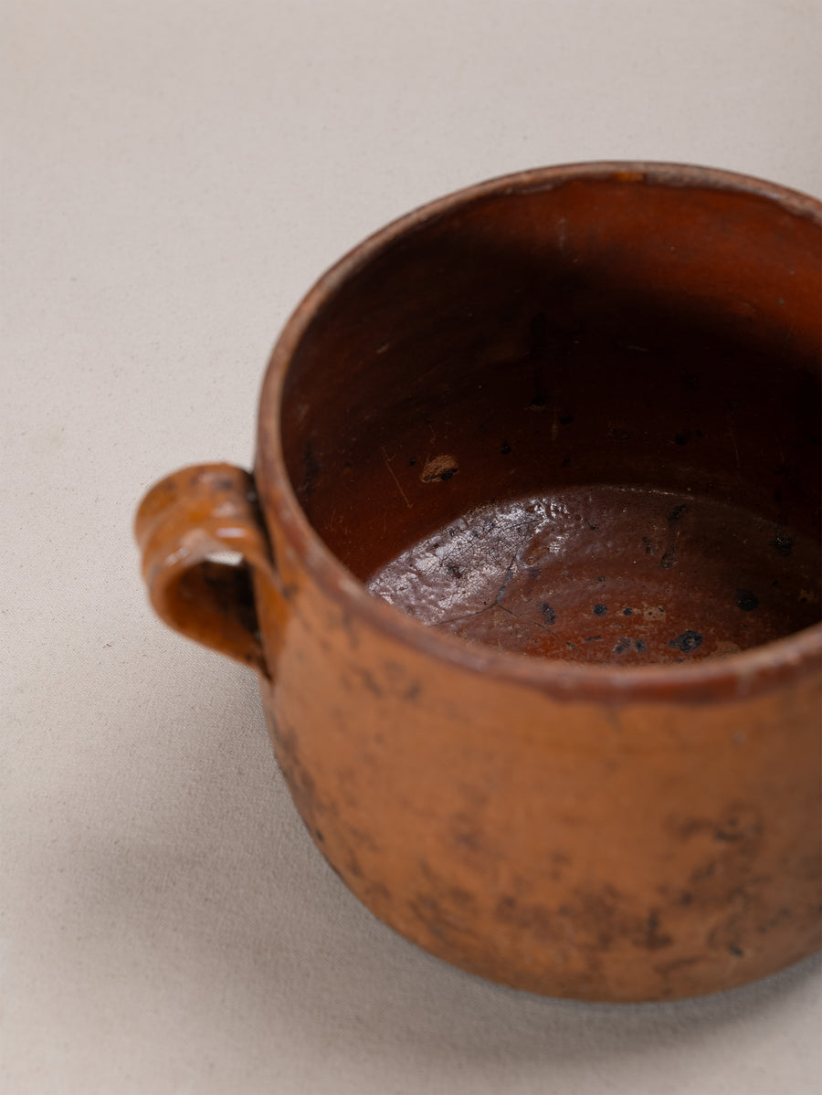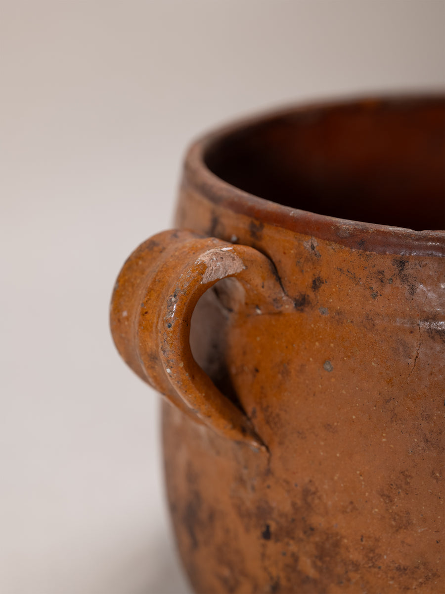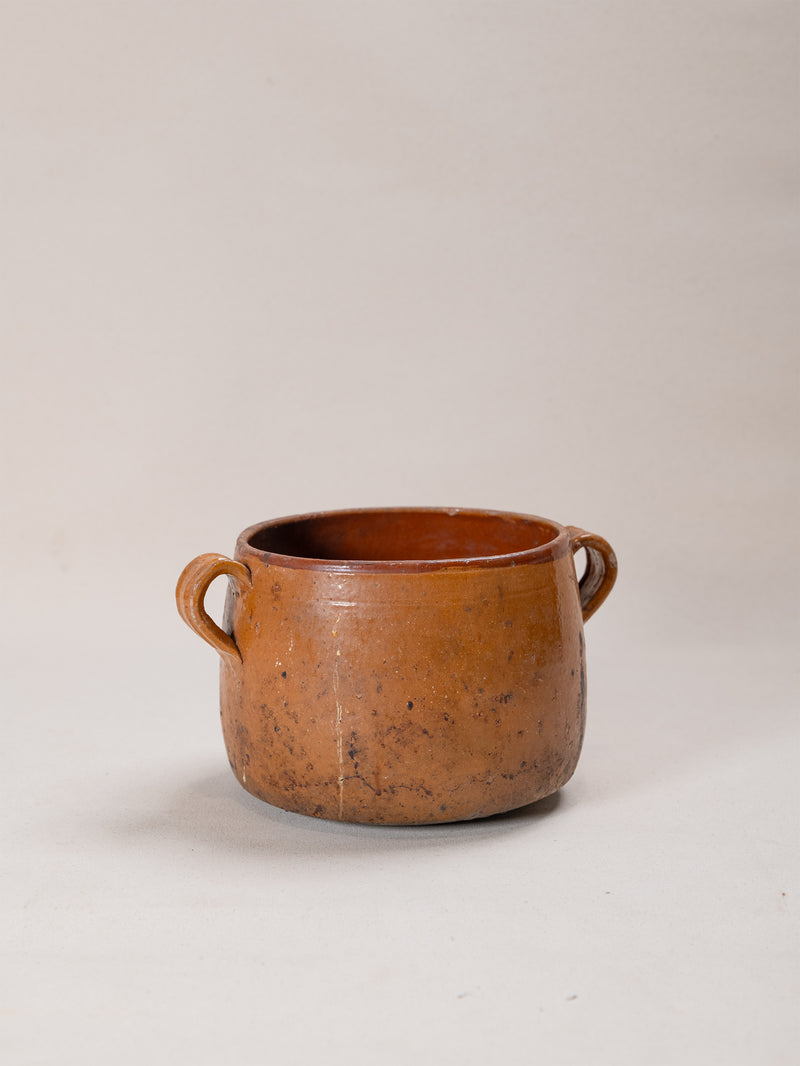 Vintage glazed terracotta pot with a warm, earthy tone and twin side handles. Once a utilitarian vessel, it now serves as a beautiful decorative accent — its simple, rounded form and natural imperfections telling the story of its handmade origin. The glaze has softened over time, revealing a surface rich in character and patina, perfect for adding an element of rustic charm to any interior.