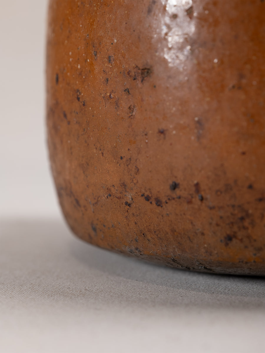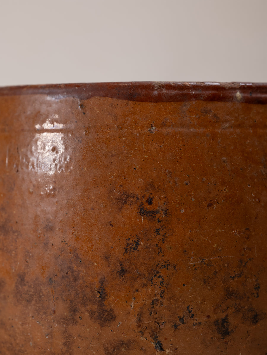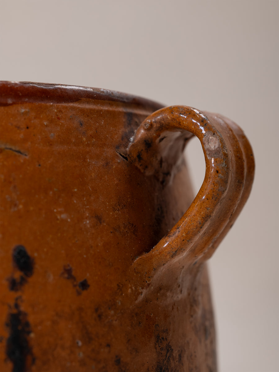 Vintage glazed terracotta pot with a warm, earthy tone and twin side handles. Once a utilitarian vessel, it now serves as a beautiful decorative accent — its simple, rounded form and natural imperfections telling the story of its handmade origin. The glaze has softened over time, revealing a surface rich in character and patina, perfect for adding an element of rustic charm to any interior.