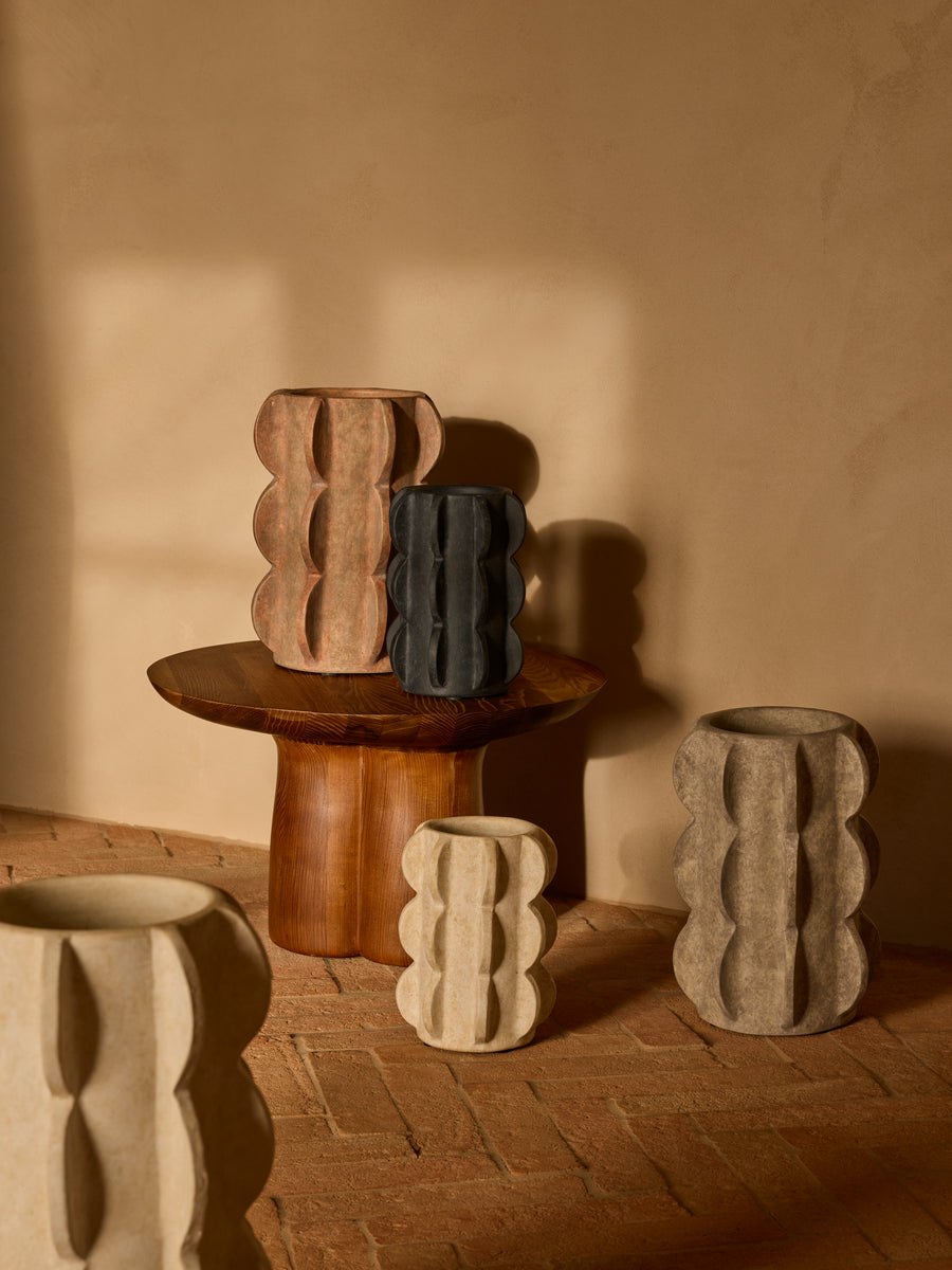 The Arcissimo range is a continuation of Dusty Deco's tribute to arched forms. Handmade with a waterproof matte coating, these pieces are available in a selection of sizes and shades. Reminiscent of brutalist architecture, this collection is striking as a clustered group, or individually placed.