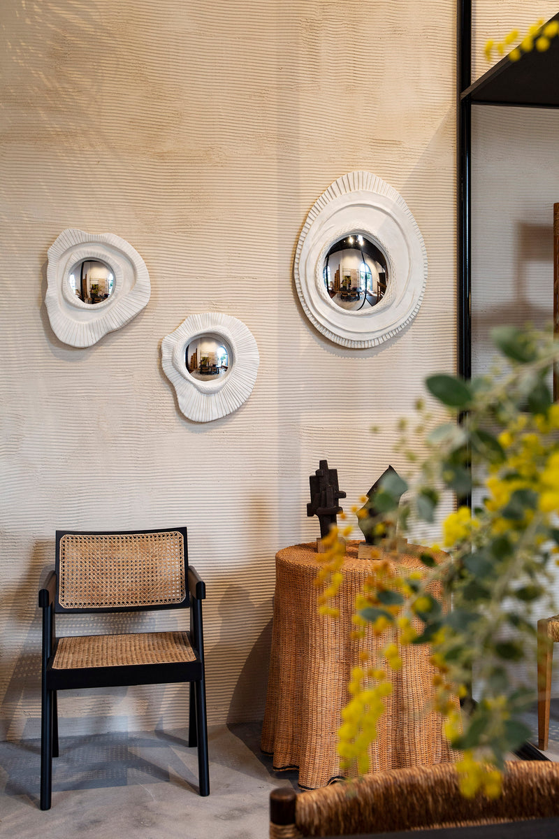 Handmade in Paris, these sculpted mirrors are crafted from plaster by artist Vincent Vauban.