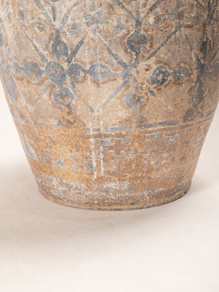 Steeped in history, this large Moorish vessel embodies the timeless artistry of Moroccan craftsmanship. Its weathered surface reveals a soft interplay of faded blues, earthen tones, and intricate hand-painted motifs - each layer bearing the marks of age and use. Both sculptural and functional, the urn’s generous form and aged finish lend an elemental beauty to interior spaces, celebrating imperfection and heritage in equal measure.