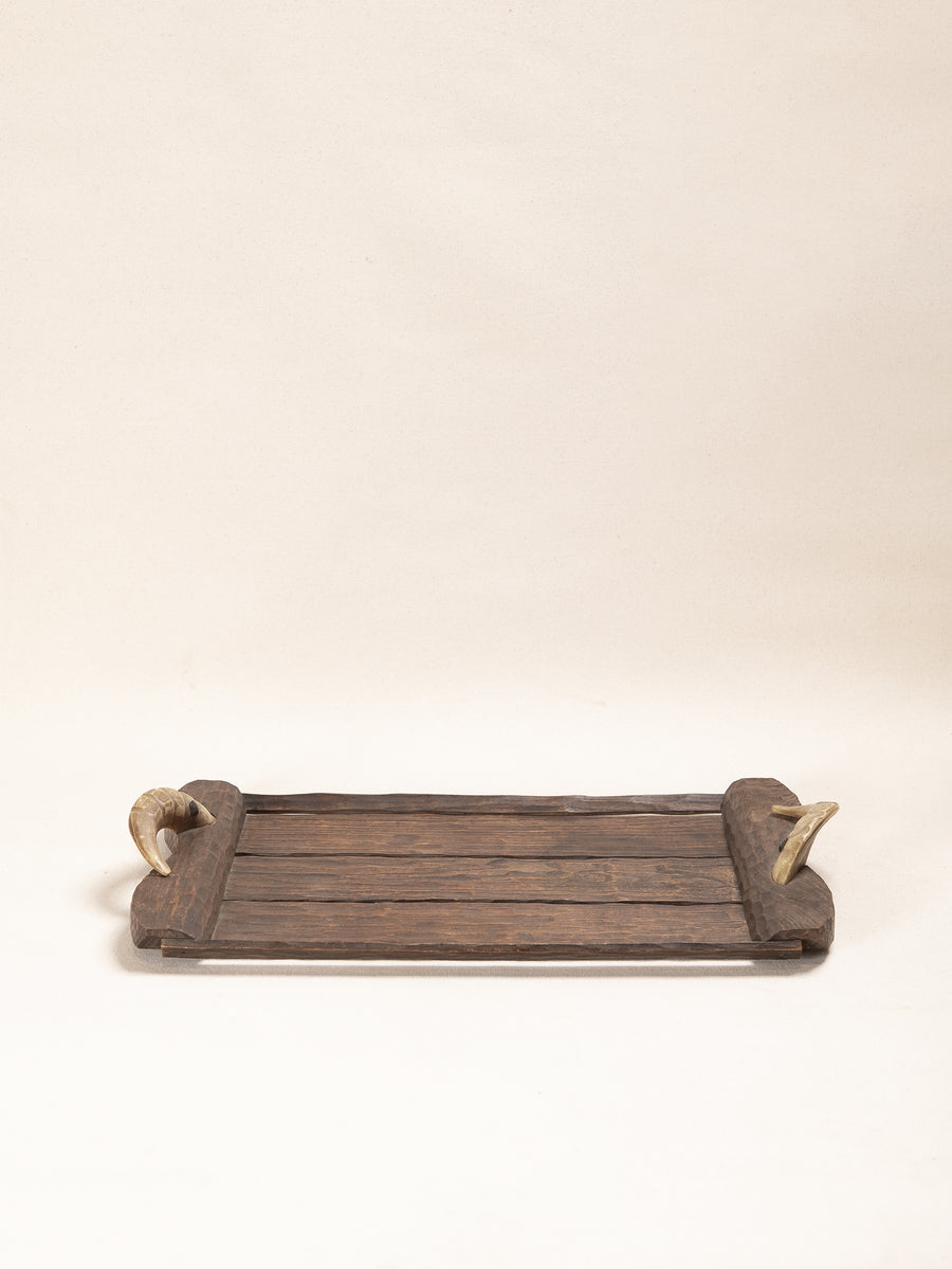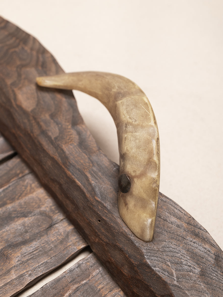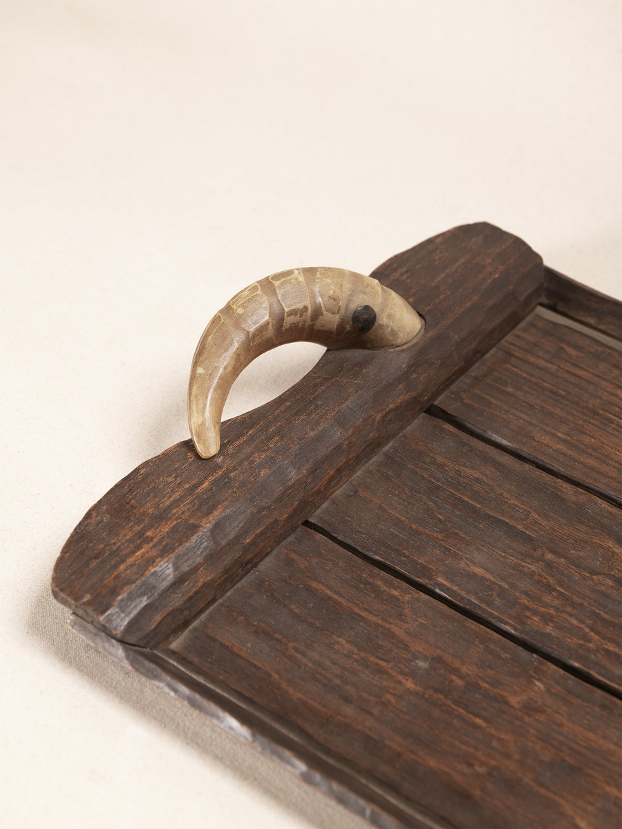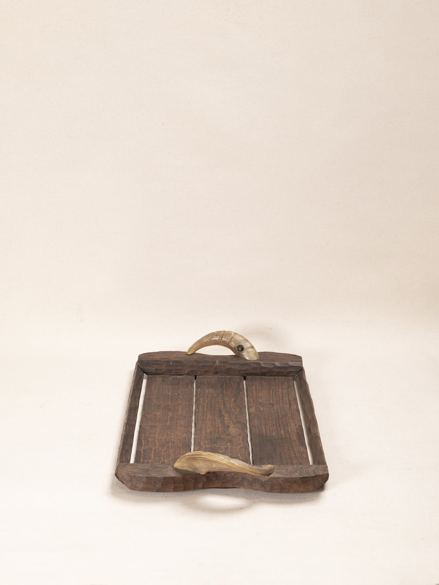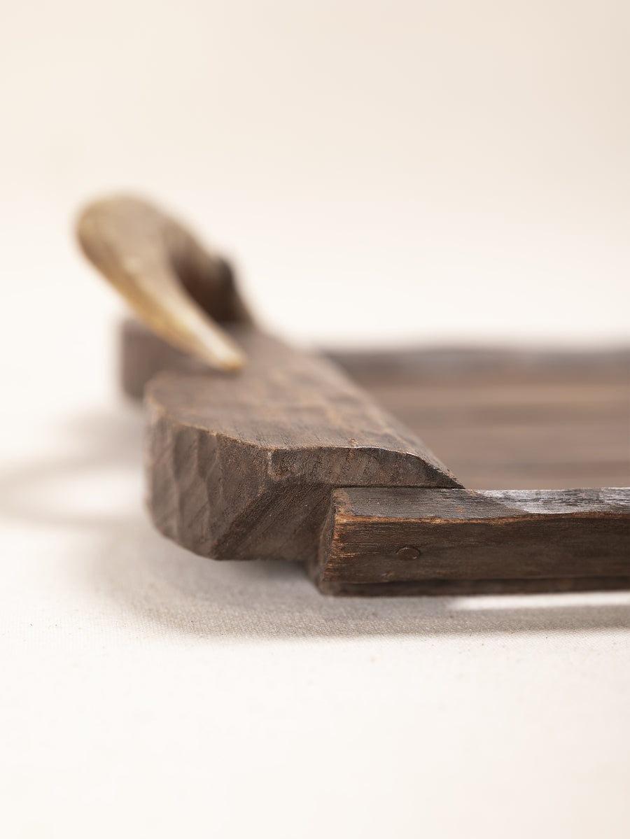 A striking Brutalist-era serving tray crafted from dark, hand-carved timber and accented with sculptural ivory handles. The piece captures the raw beauty of natural materials, combining rustic texture with elegant form. Once used for serving wine or aperitifs, it now serves beautifully as a decorative centrepiece - a refined example of French artisanal design from the period.