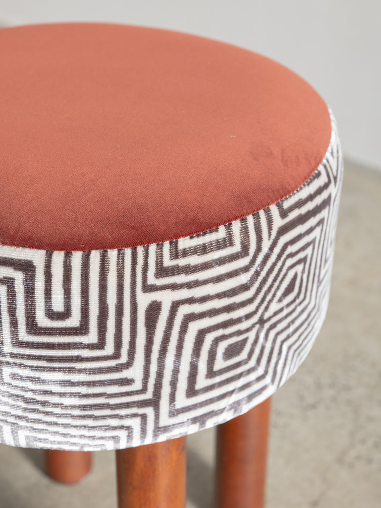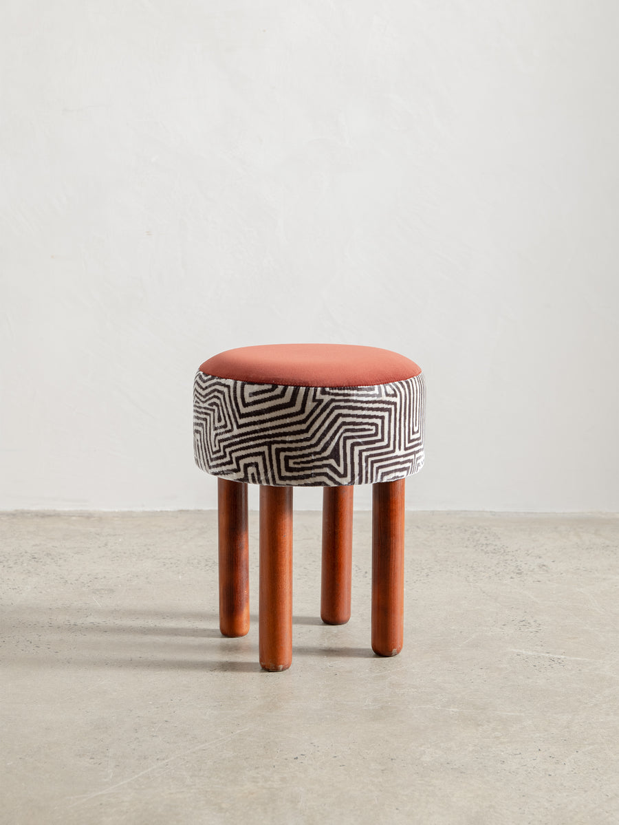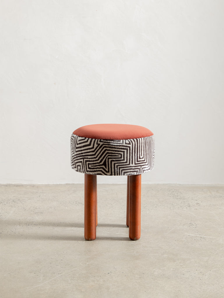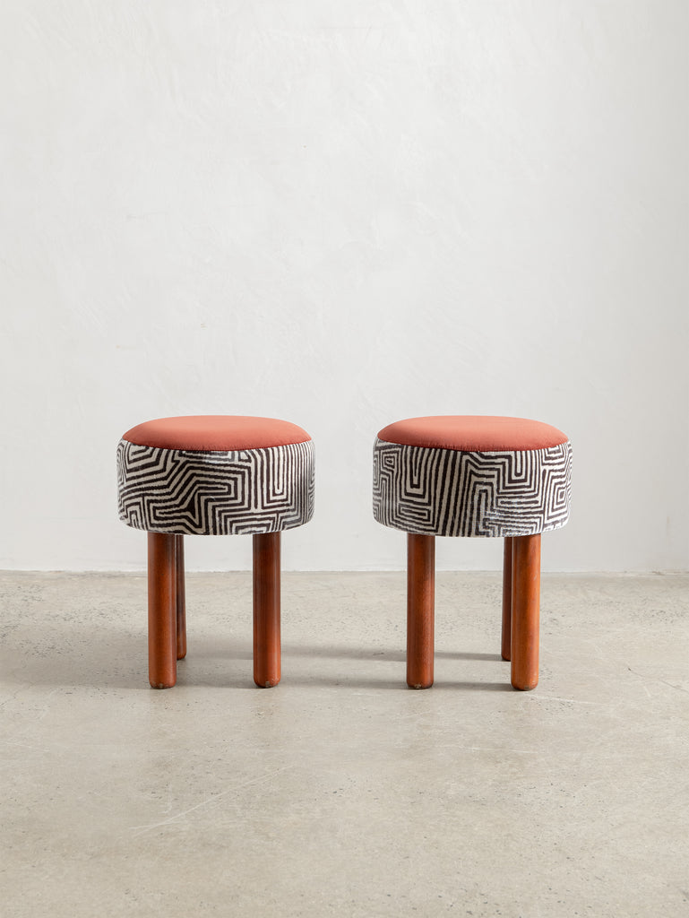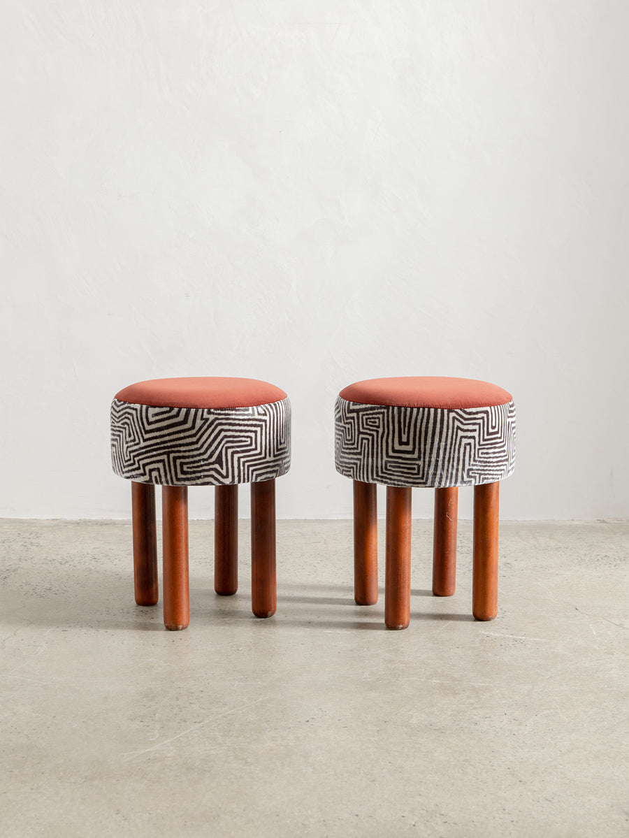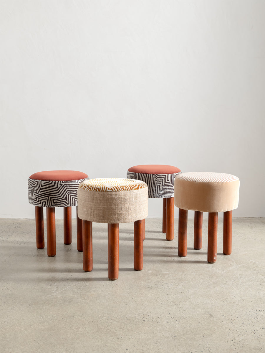 Playful yet refined, these mid-century stools from Italy are characterised by their cylindrical teak legs and graphic, rounded forms. Each piece has been thoughtfully reupholstered in a combination of two complementary fabrics—contrasting textures and patterns that bring new life to the original padded skai structure. Perfect as occasional seating or sculptural accents.