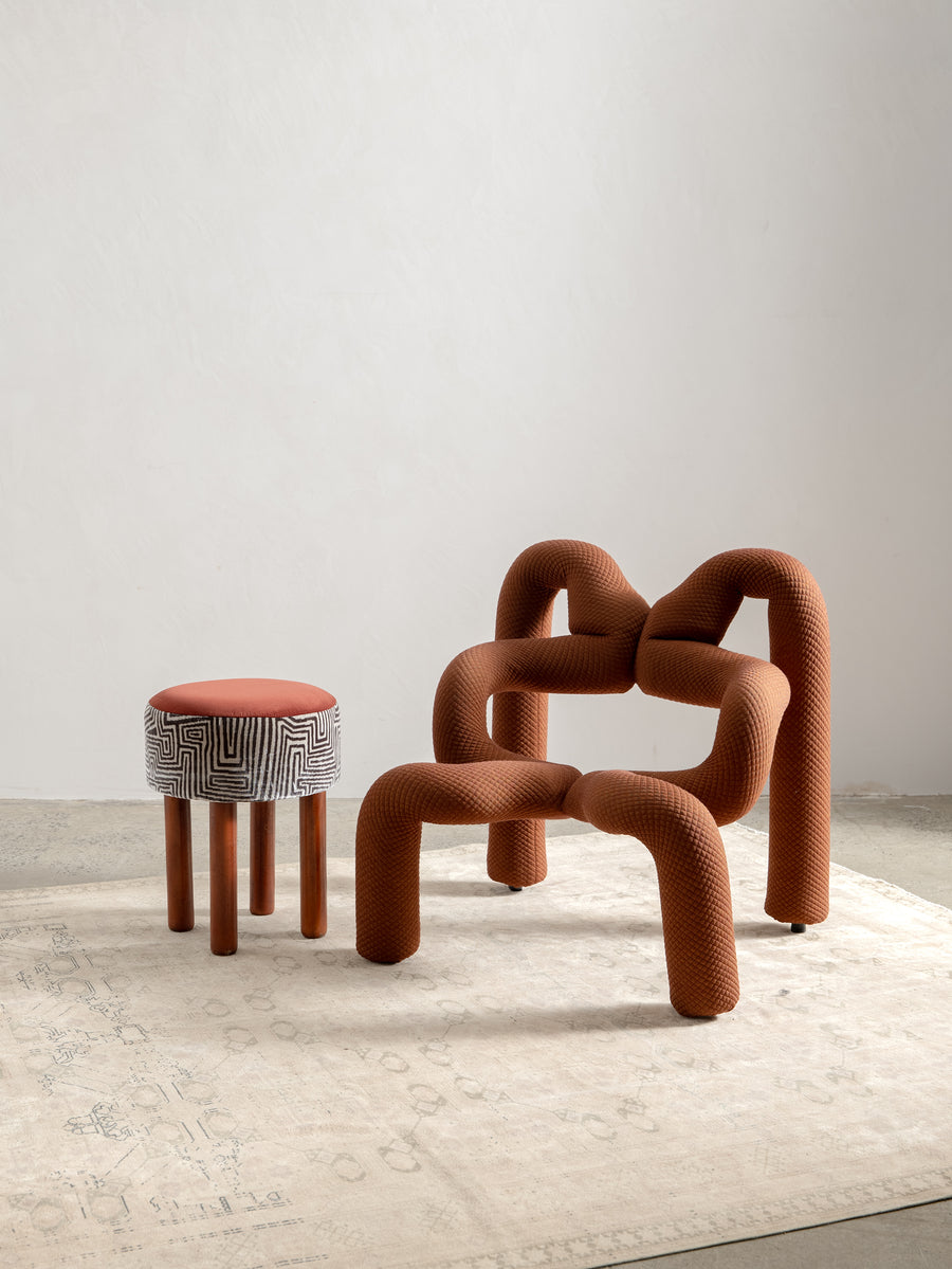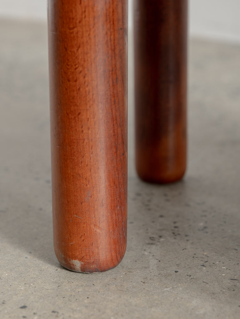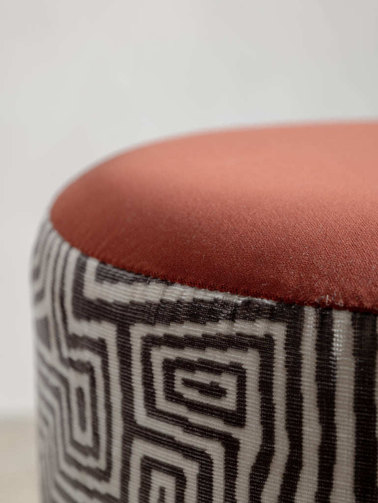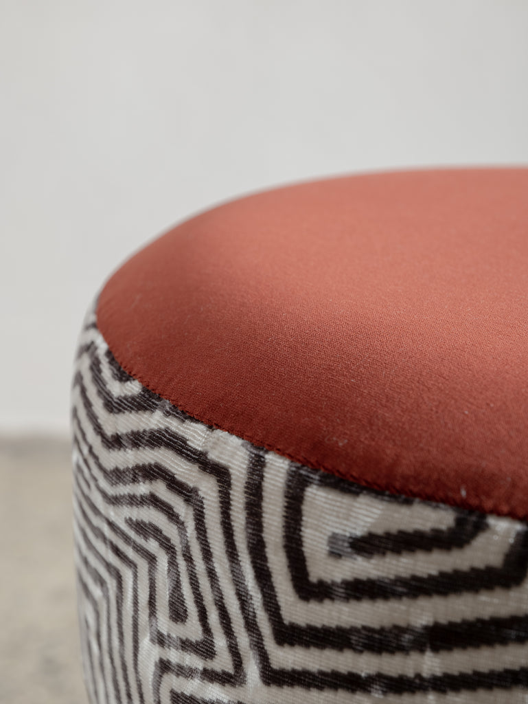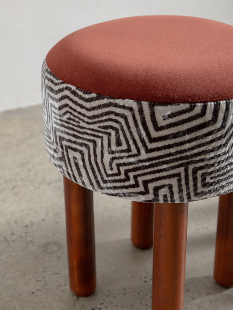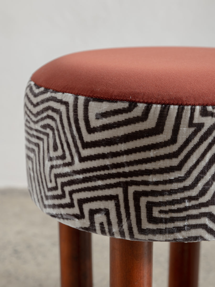 Playful yet refined, these mid-century stools from Italy are characterised by their cylindrical teak legs and graphic, rounded forms. Each piece has been thoughtfully reupholstered in a combination of two complementary fabrics—contrasting textures and patterns that bring new life to the original padded skai structure. Perfect as occasional seating or sculptural accents.